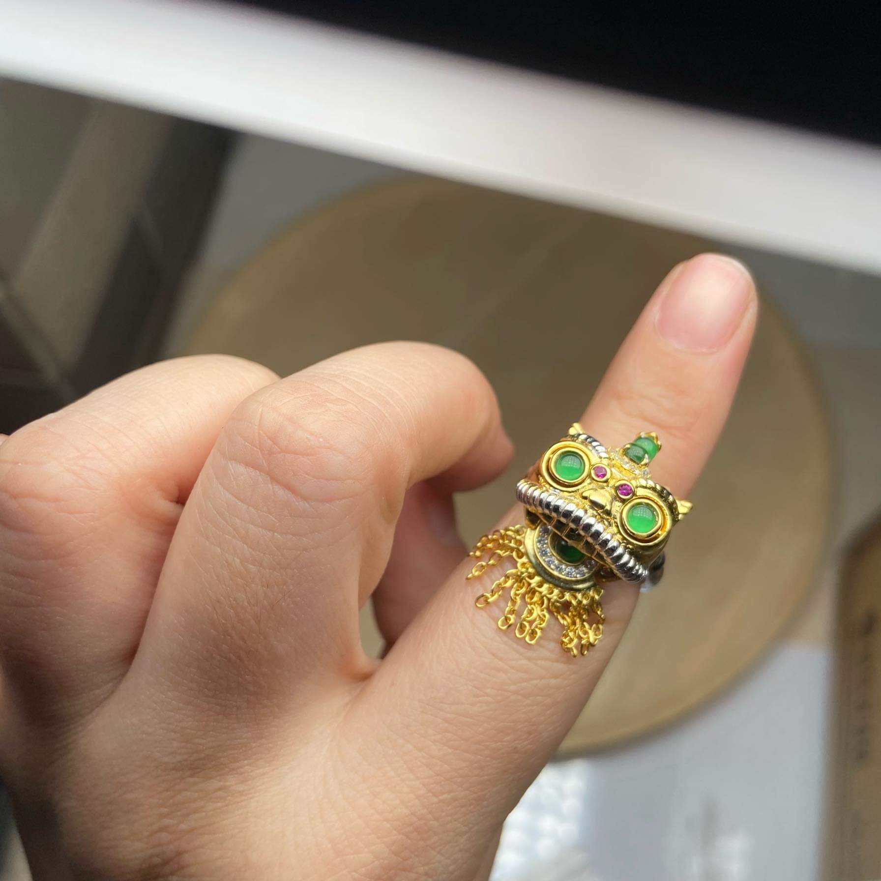 Made of S925 silver and then plated gold. The green jadeite stones are a vibrant colour.
