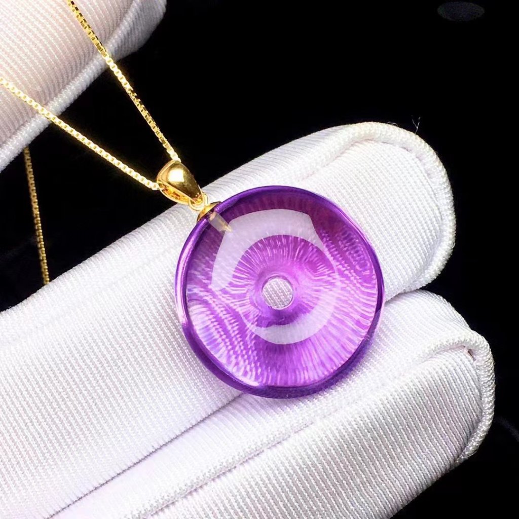 Measures 20 x 8, this mystic amethyst looks so mysterious, in the shape of coin aka Circle Donut/Ping An Kou: The jade coin or “ping an kou” (平安口) in Chinese, is a classic jade design. Reminiscent of a traditional Chinese coin, it grants safety, harmony, and fortune to its wearers. The clasp is solid 18k gold, comes with a plated chain. £120