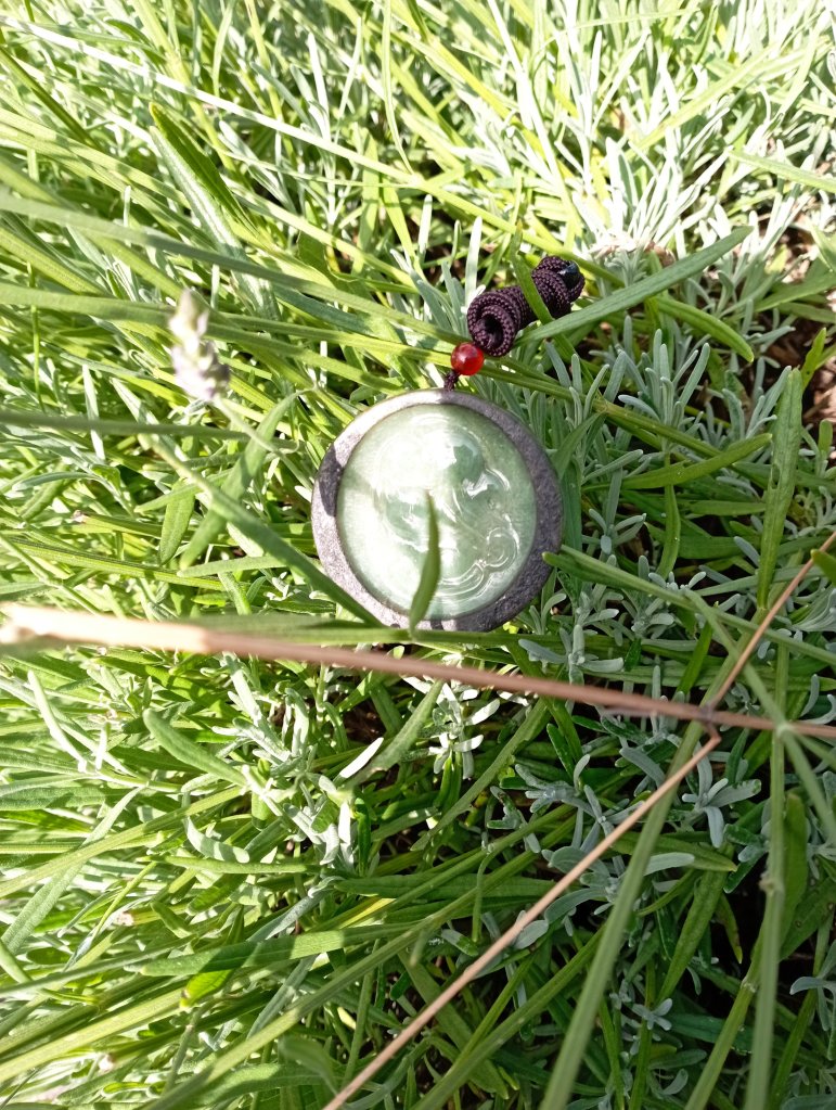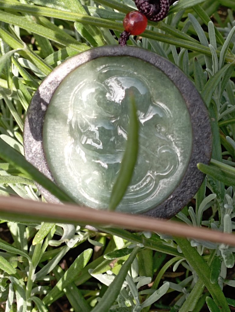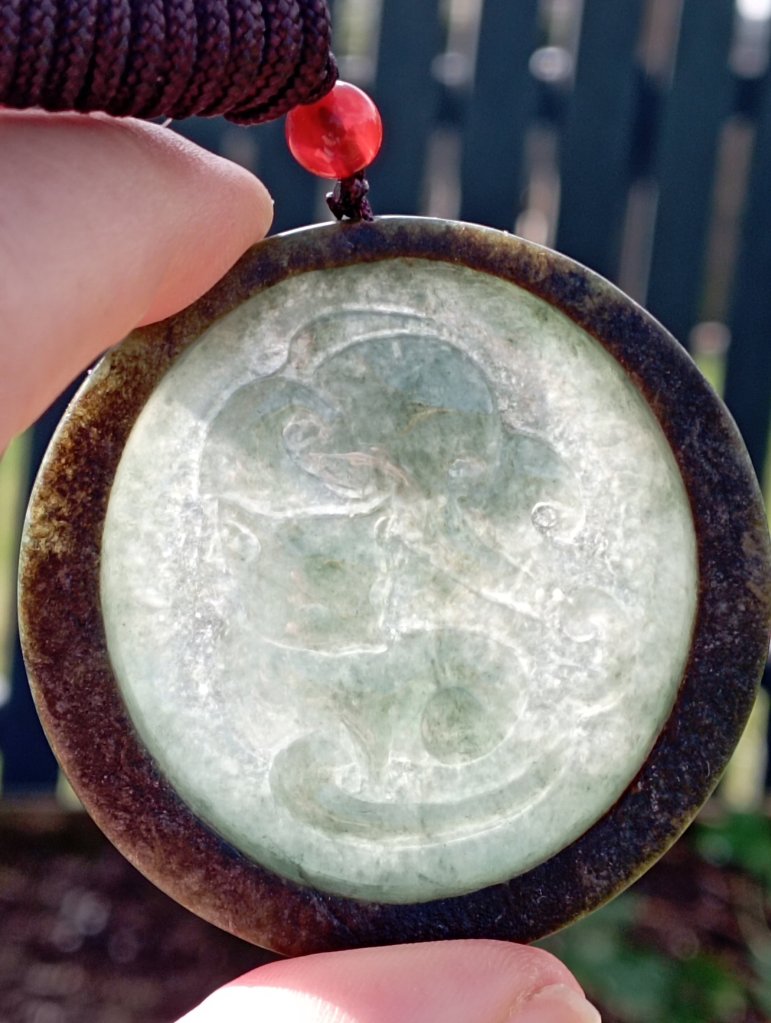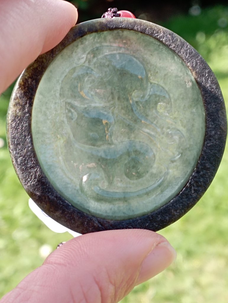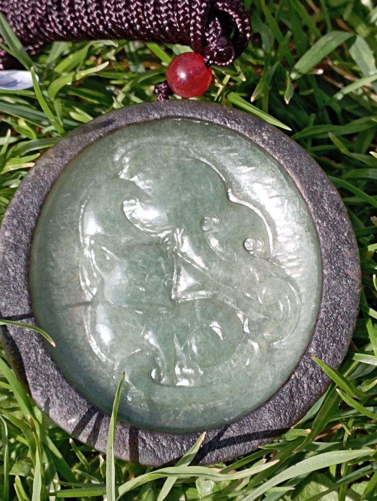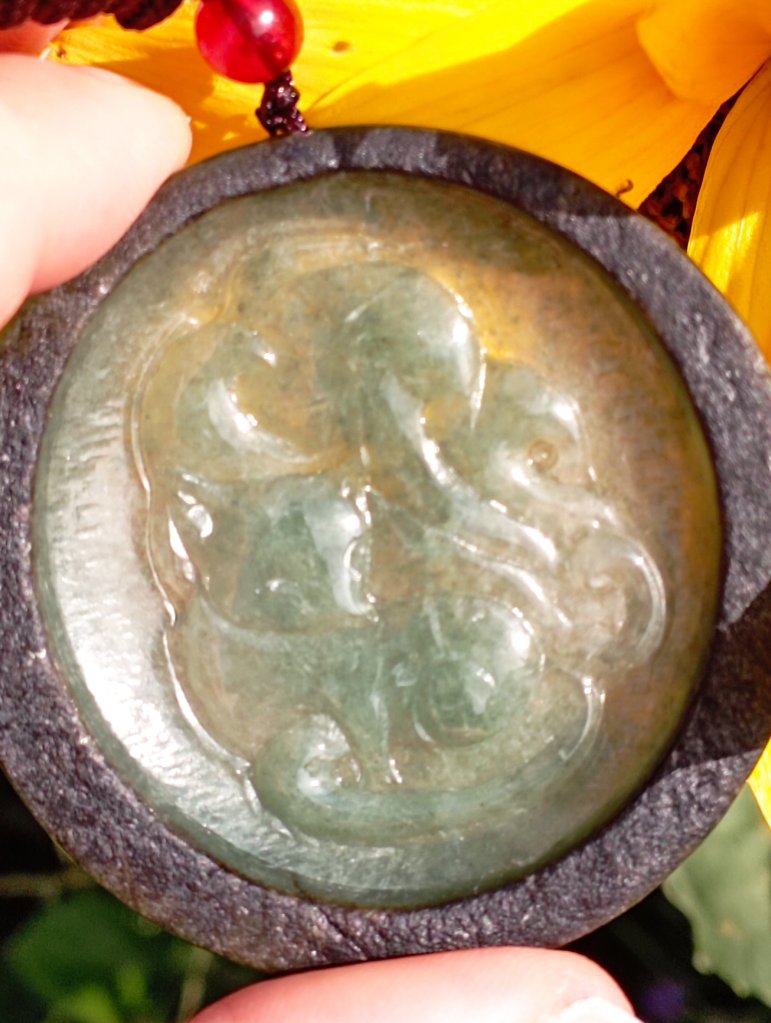 Gorgeous round jadeite fox with 9 tails in green, very translucent with the red skin of the jadeite around it, very unique. It is also known in Japan as Kitsune or Gumiho in Korea.