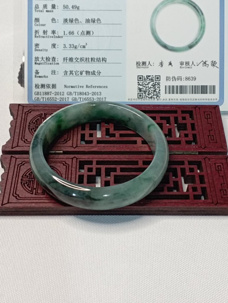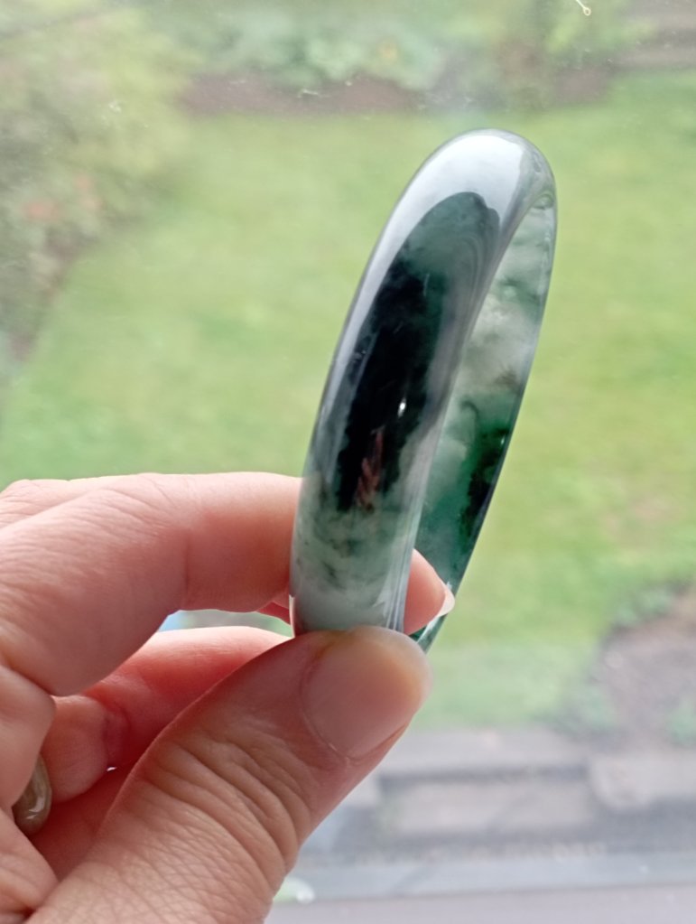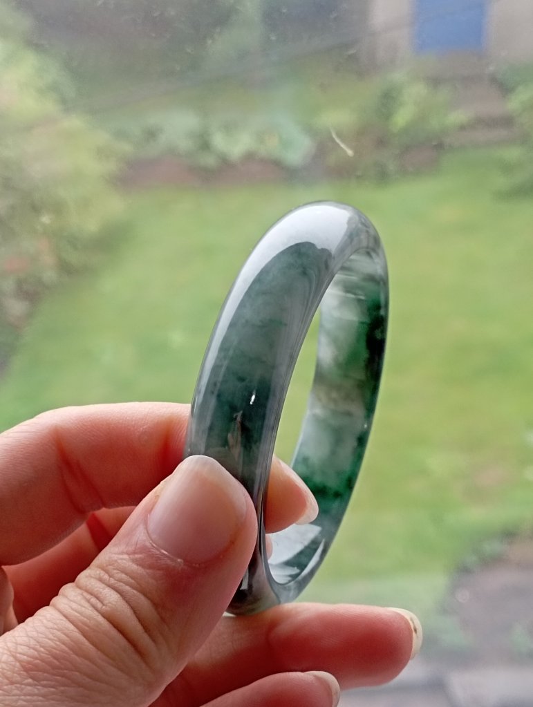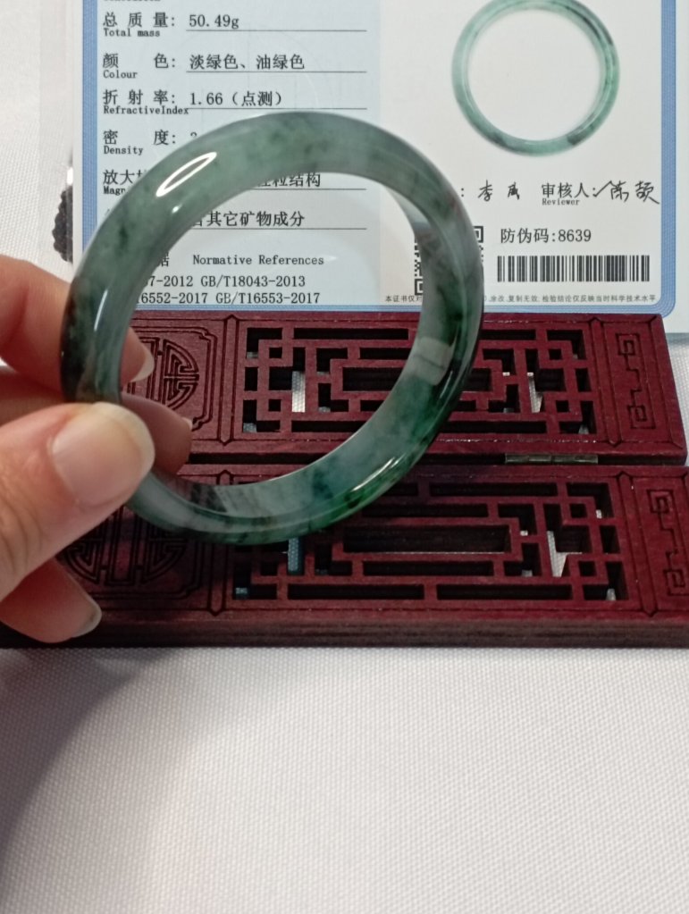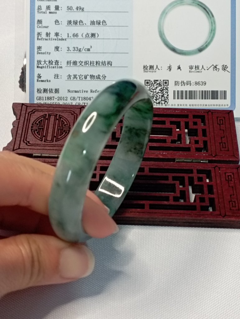 Stunning green bangle, translucent and full of blooms that look alive. Comes with a certificate of authenticity.