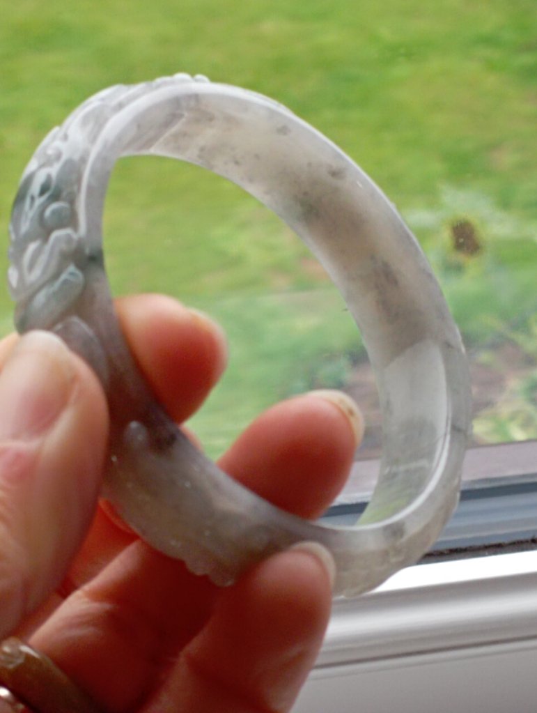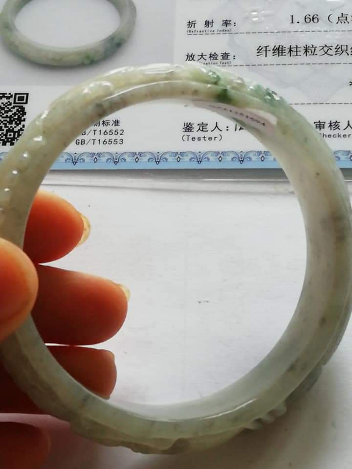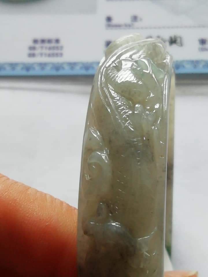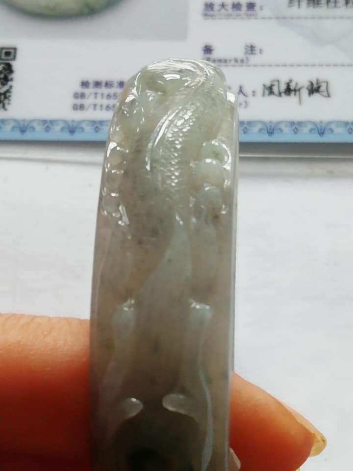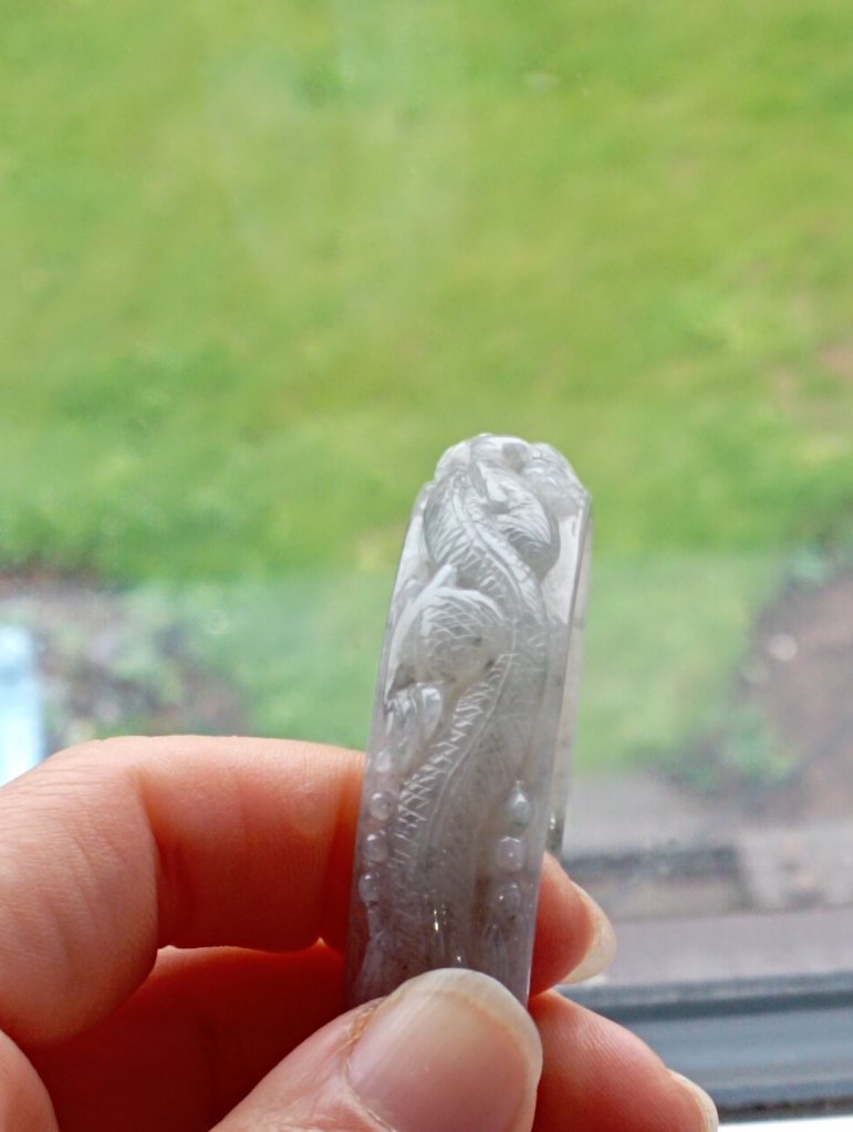 Translucent carved dragon jadeite bangle in green and smoky grey. The dragon is biting on a coin which means bringing the wearer wealth on top of good luck, measures 56.7 x 13.4 x 7mm, and comes with a certificate of authenticity. £188