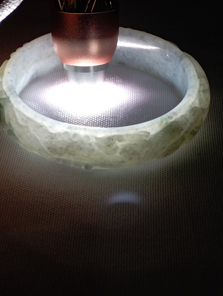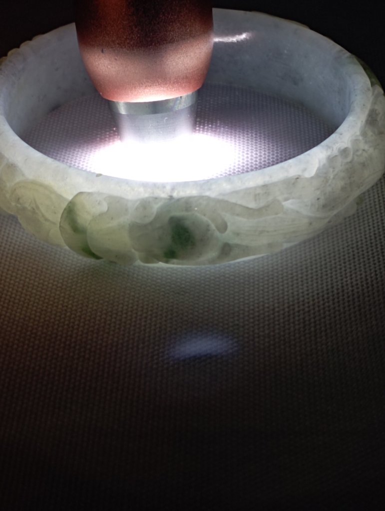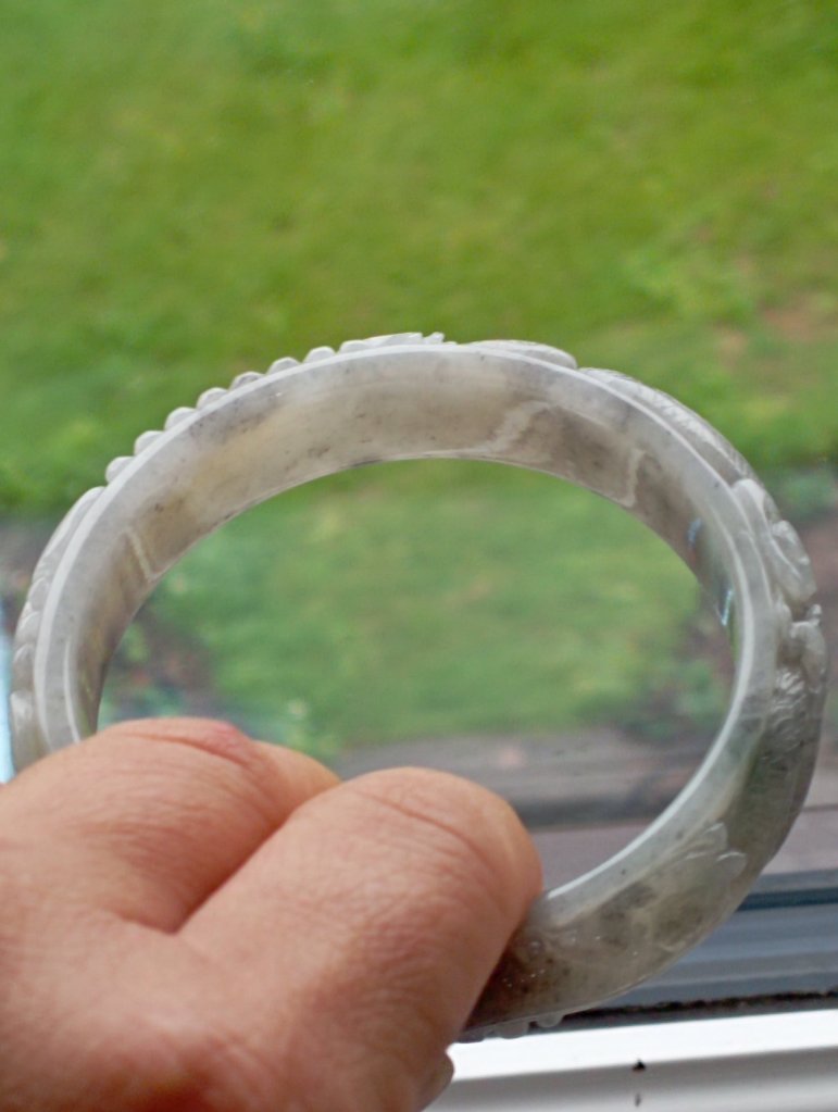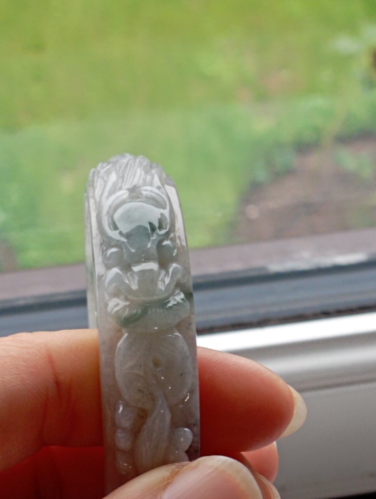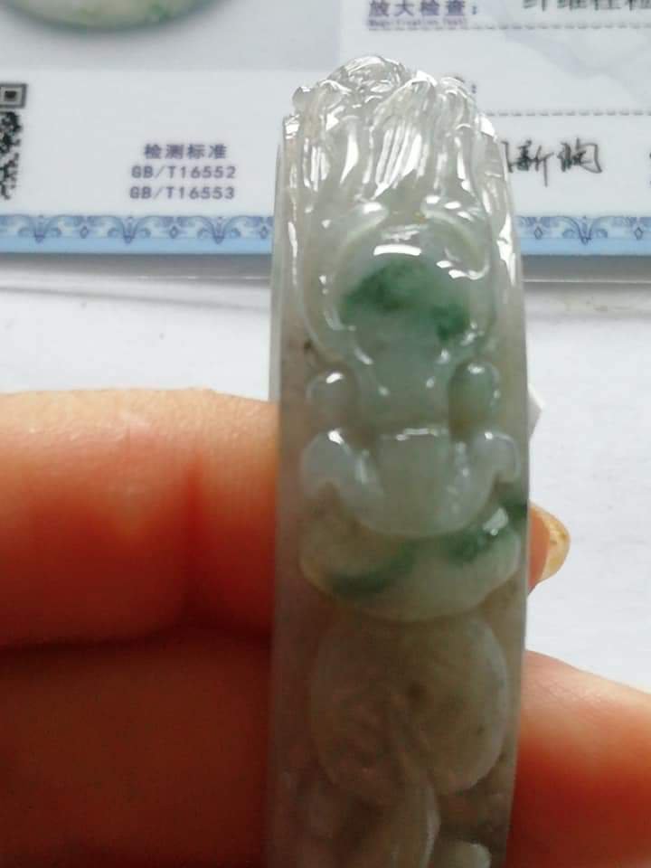 Translucent carved dragon jadeite bangle in green and smoky grey. The dragon is biting on a coin which means bringing the wearer wealth on top of good luck, measures 56.7 x 13.4 x 7mm, and comes with a certificate of authenticity. £188