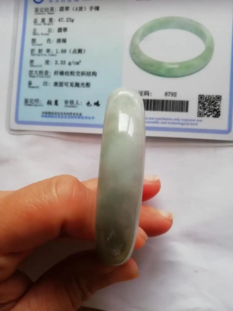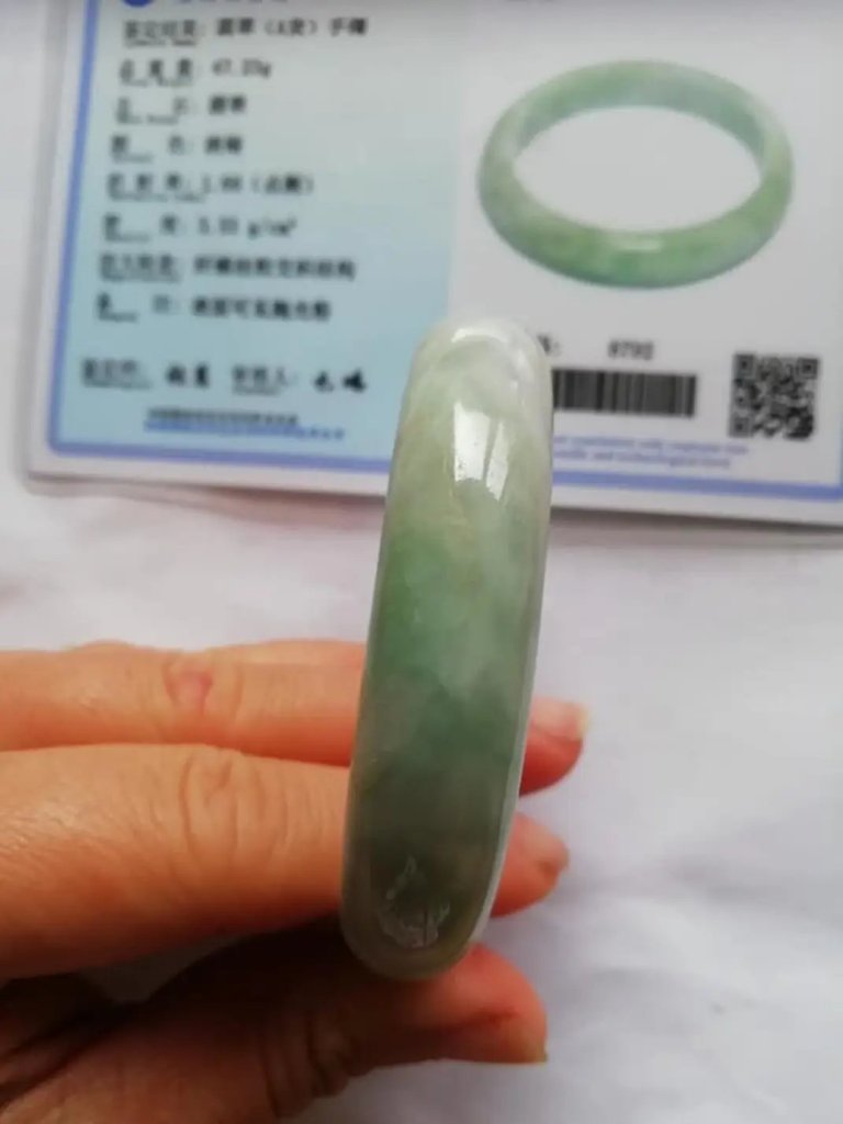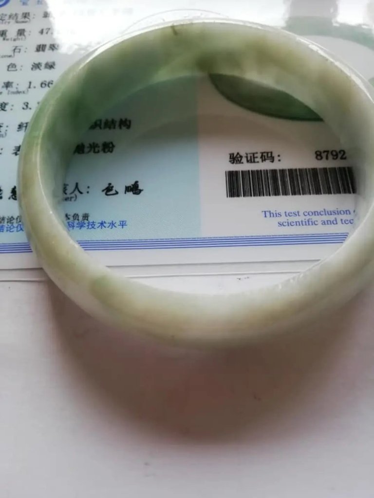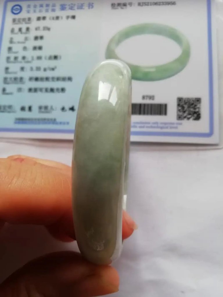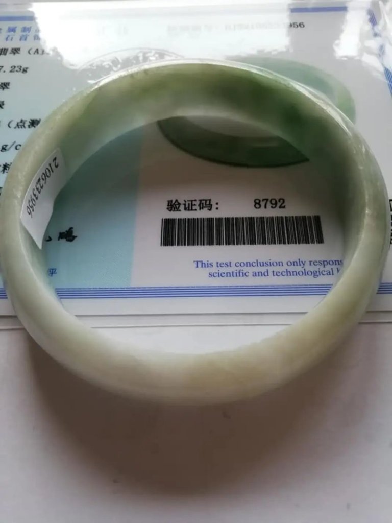 Lovely light green bangle measures 56.2 x 12.2 x 6.2mm, comes with certificate of authenticity