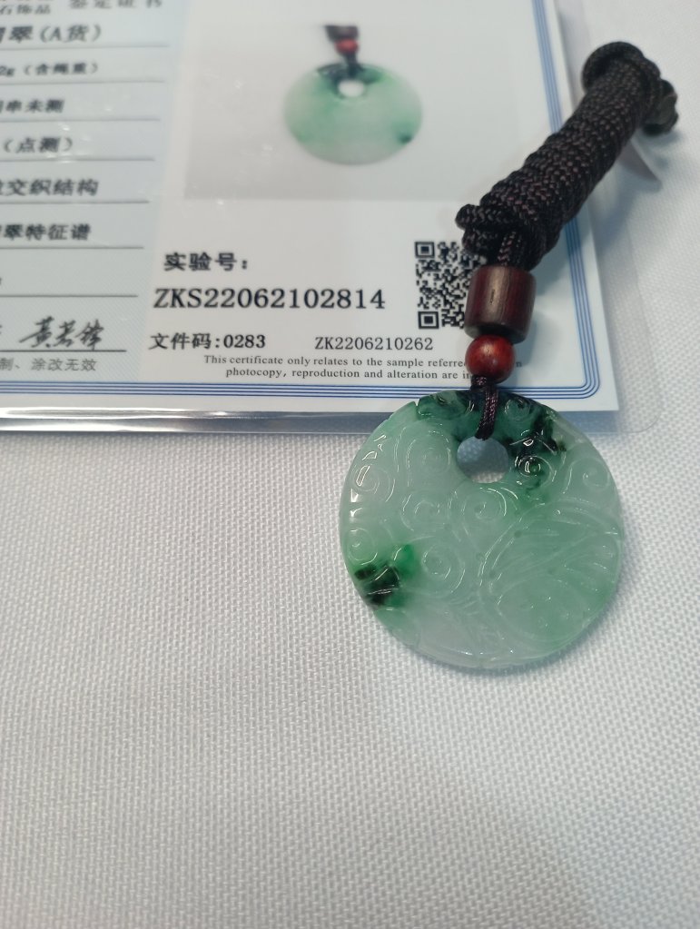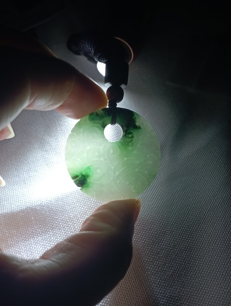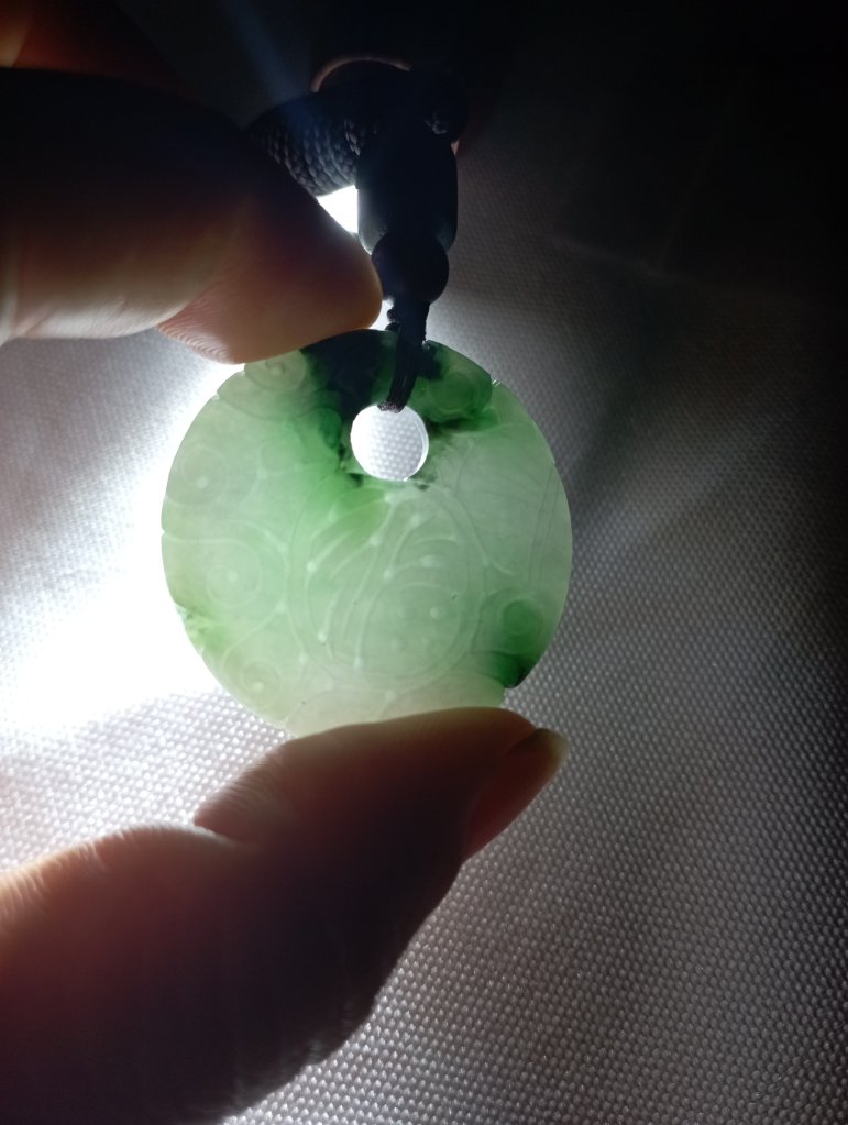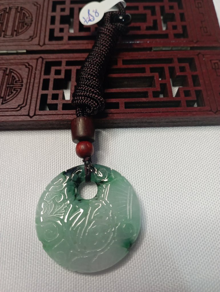 Beautifully carved green jadeite with the word fu 福, as in good fortune, carved ruyi如意 which means may everything goes smoothly, as well as lucky clouds and coin. The donut measures 33.9 x 4.9mm, comes with a certificate of authenticity. £68