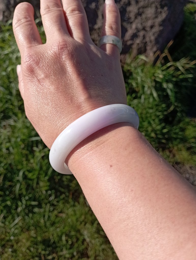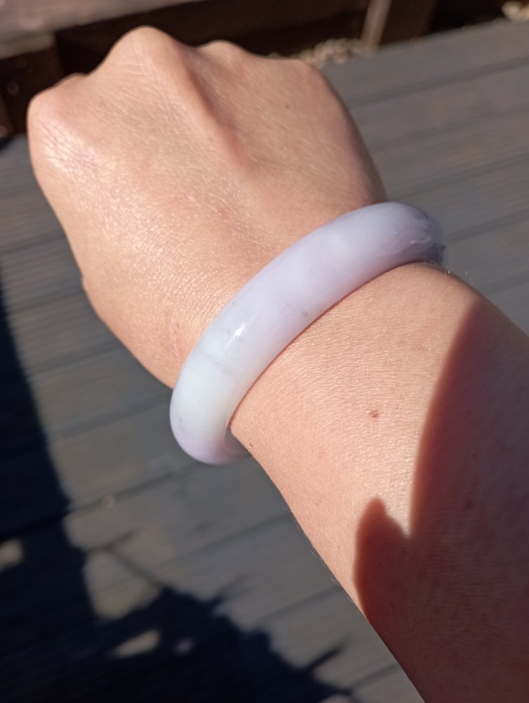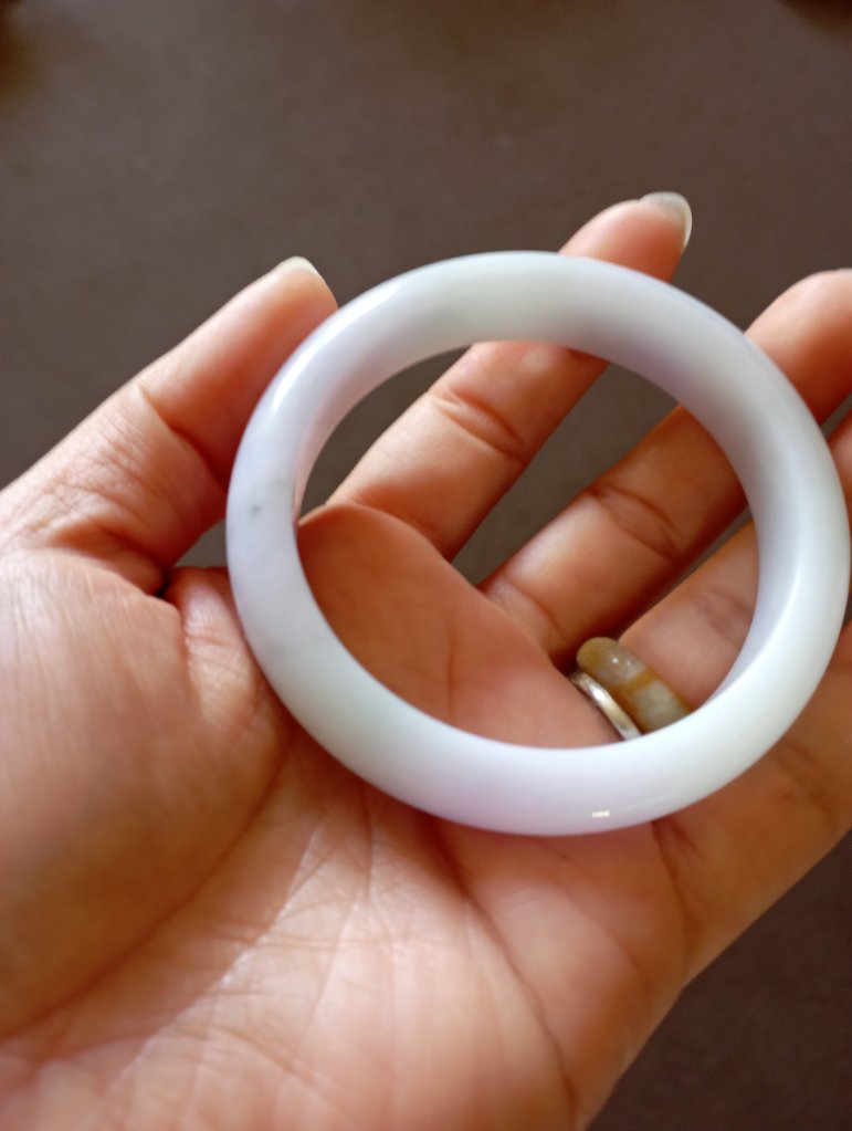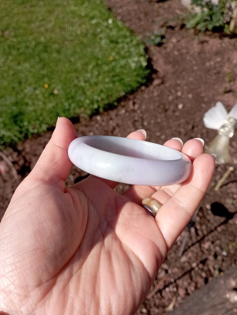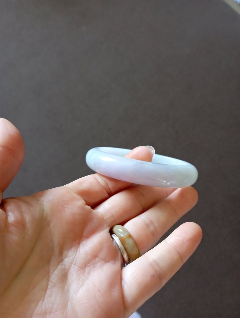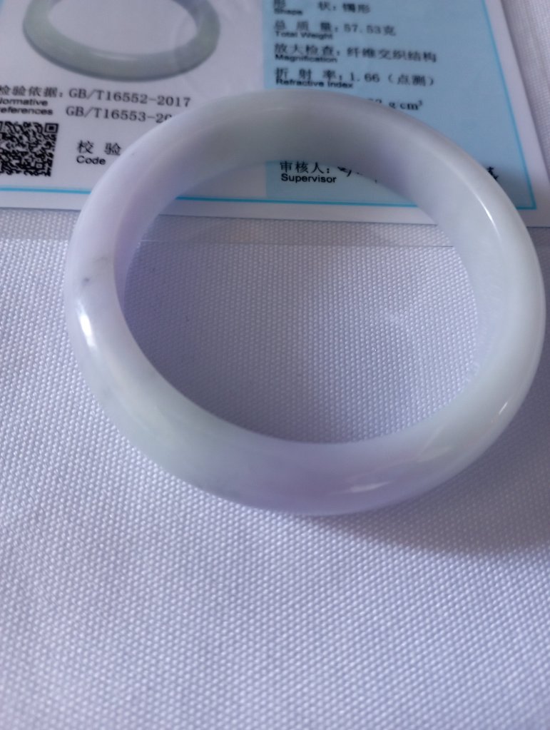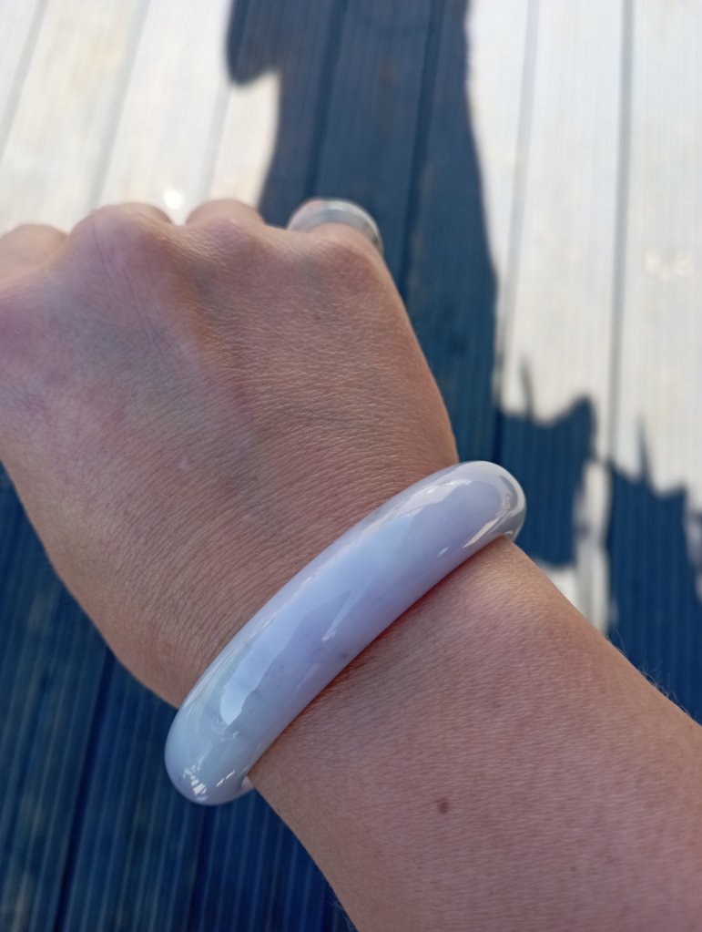 Beautiful colour measures 57 x 13 x 8.1mm. As seen in pictures, under strong lights, it looks white, indoor, it looks lavendar and some areas are stronger in purple.