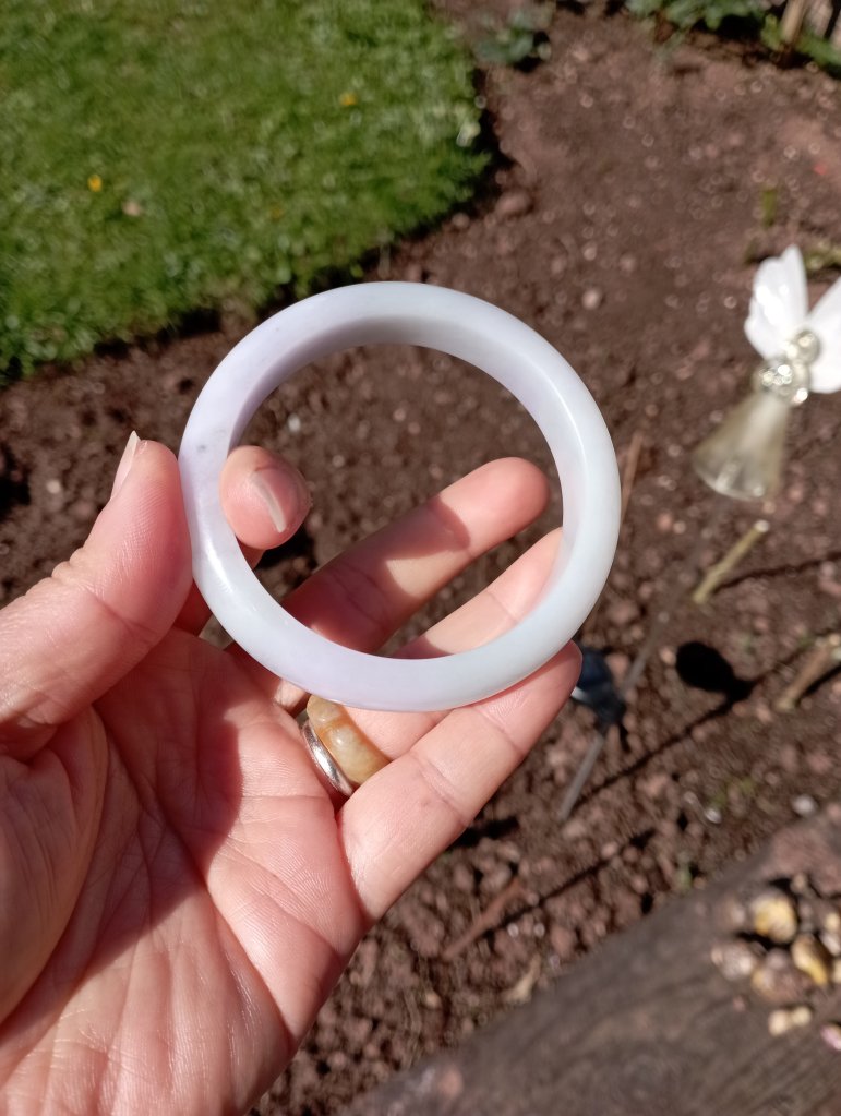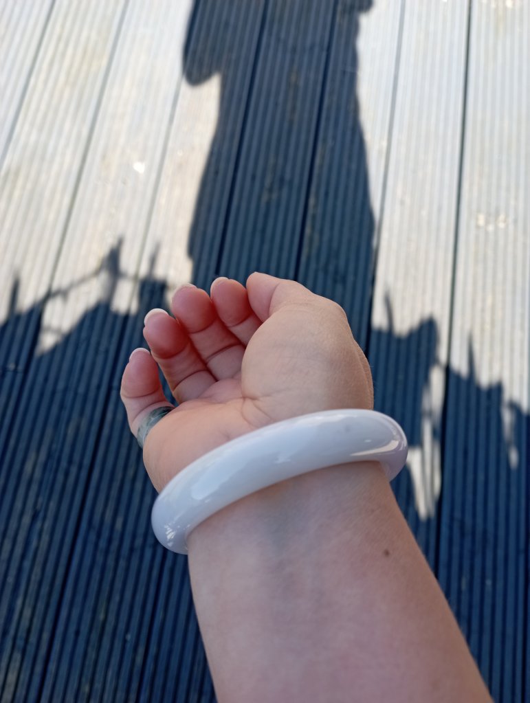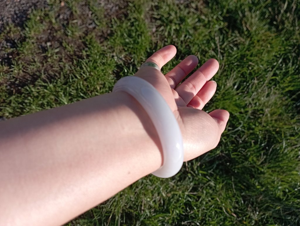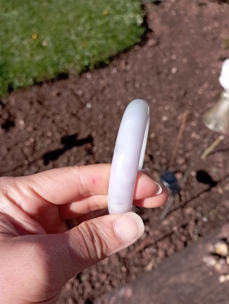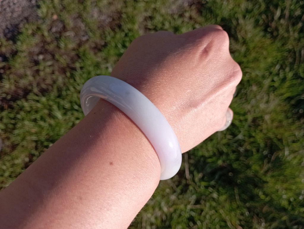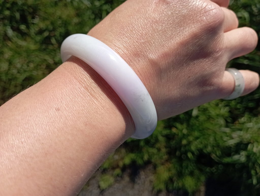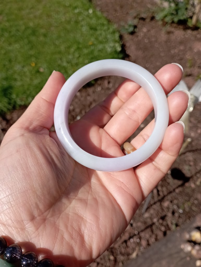 Beautiful colour measures 57 x 13 x 8.1mm. As seen in pictures, under strong lights, it looks white, indoor, it looks lavendar and some areas are stronger in purple.