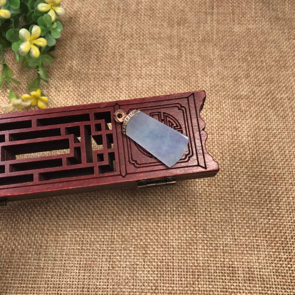Set in 18k gold, this lovely translucent jadeite is in a triangular shape known as wushipai,无事牌 as in ,平安无事keeping you safe and sound. Comes with a certificate of authenticity.