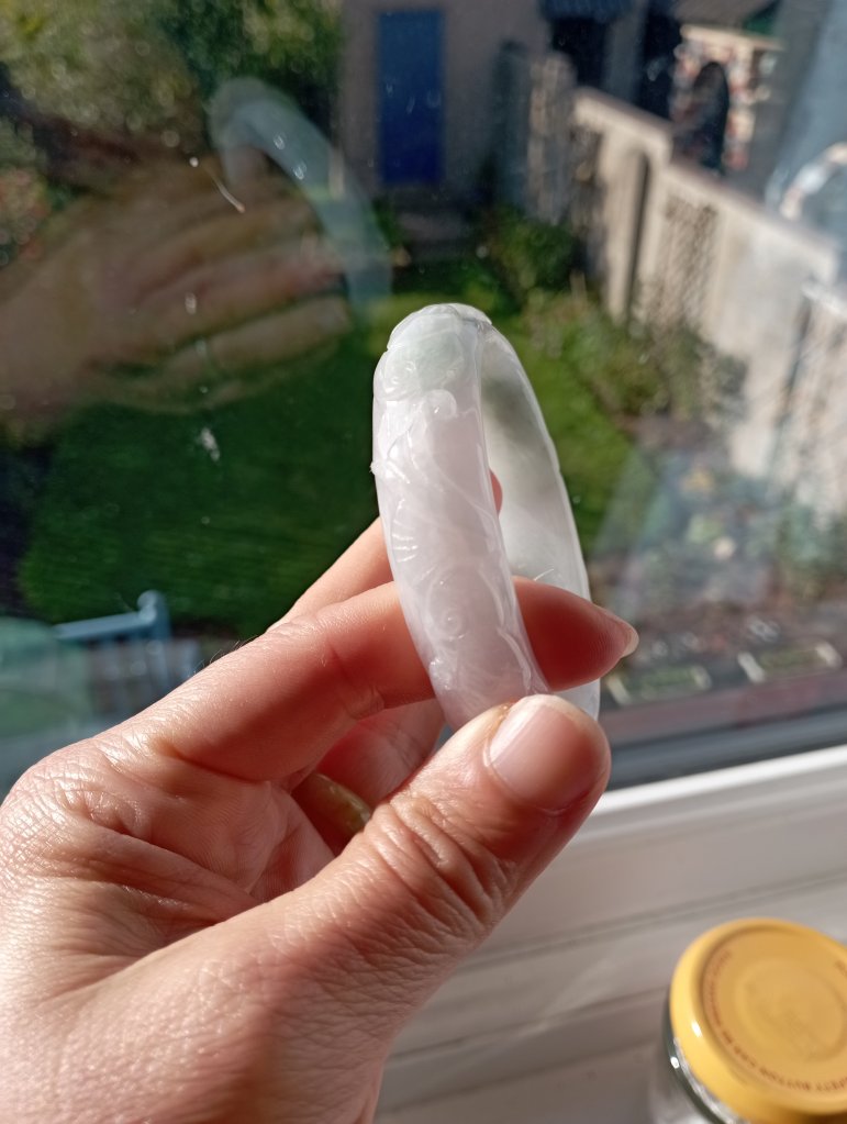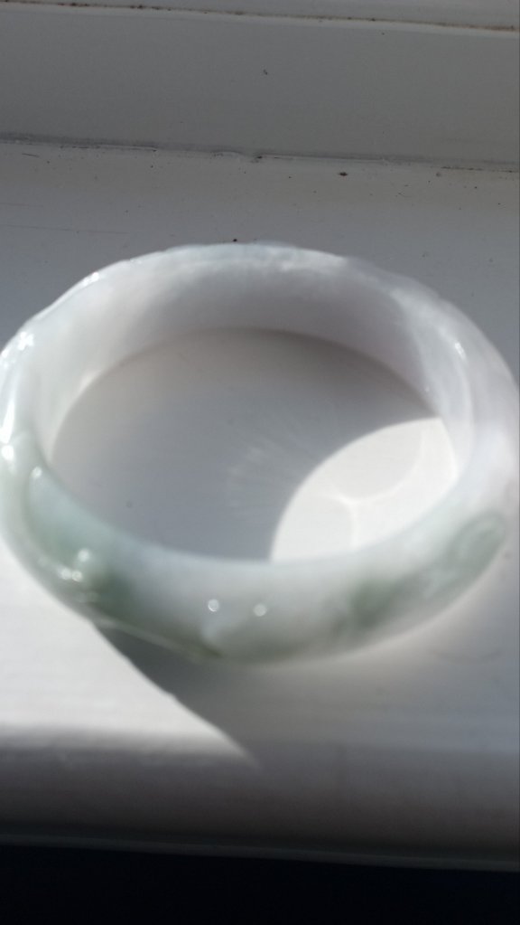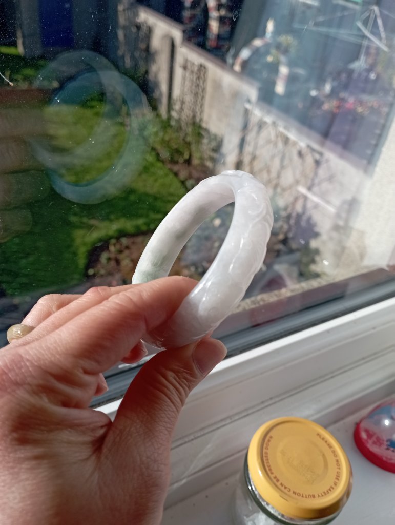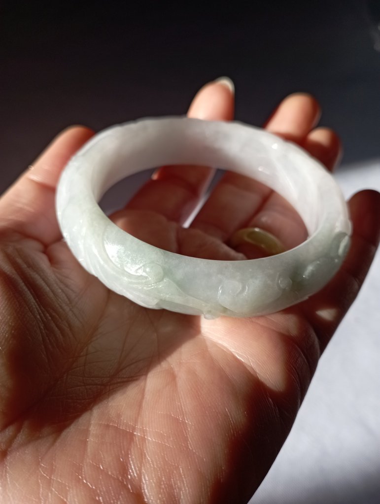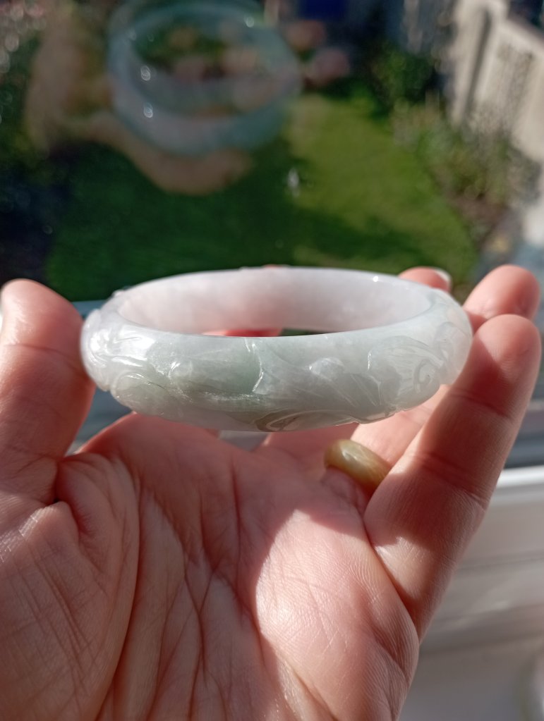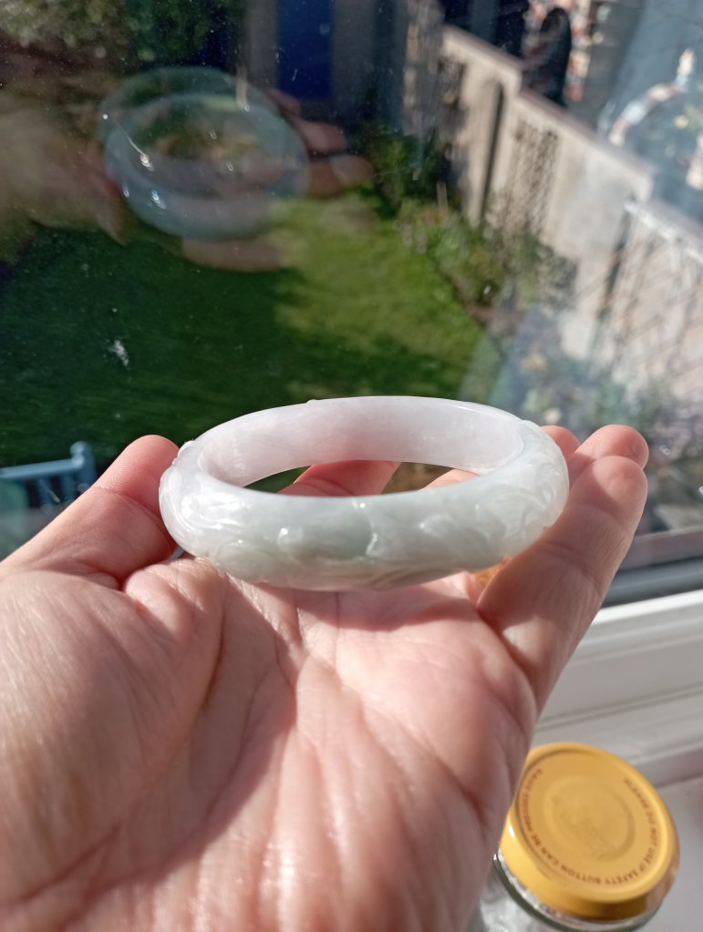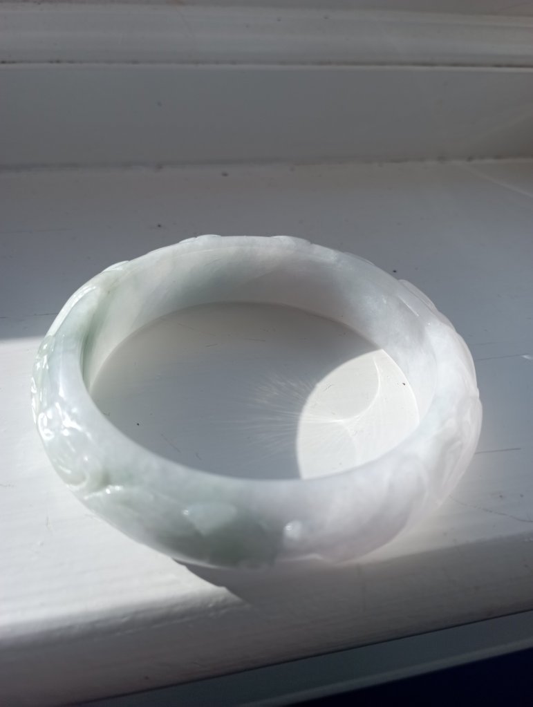 Stunning bangle carved with ruyi( may everything in your life go smoothly in your favour), it is translucent and measures 58.5 X 13.8 X 7.7mm, comes with a certificate of authenticity. £218
