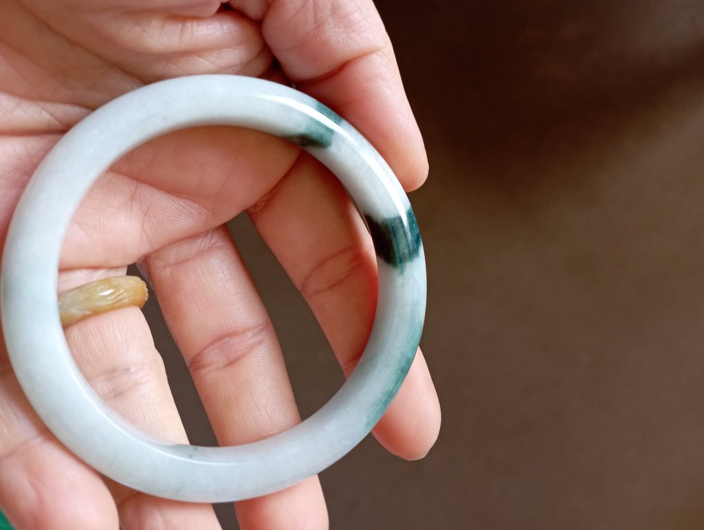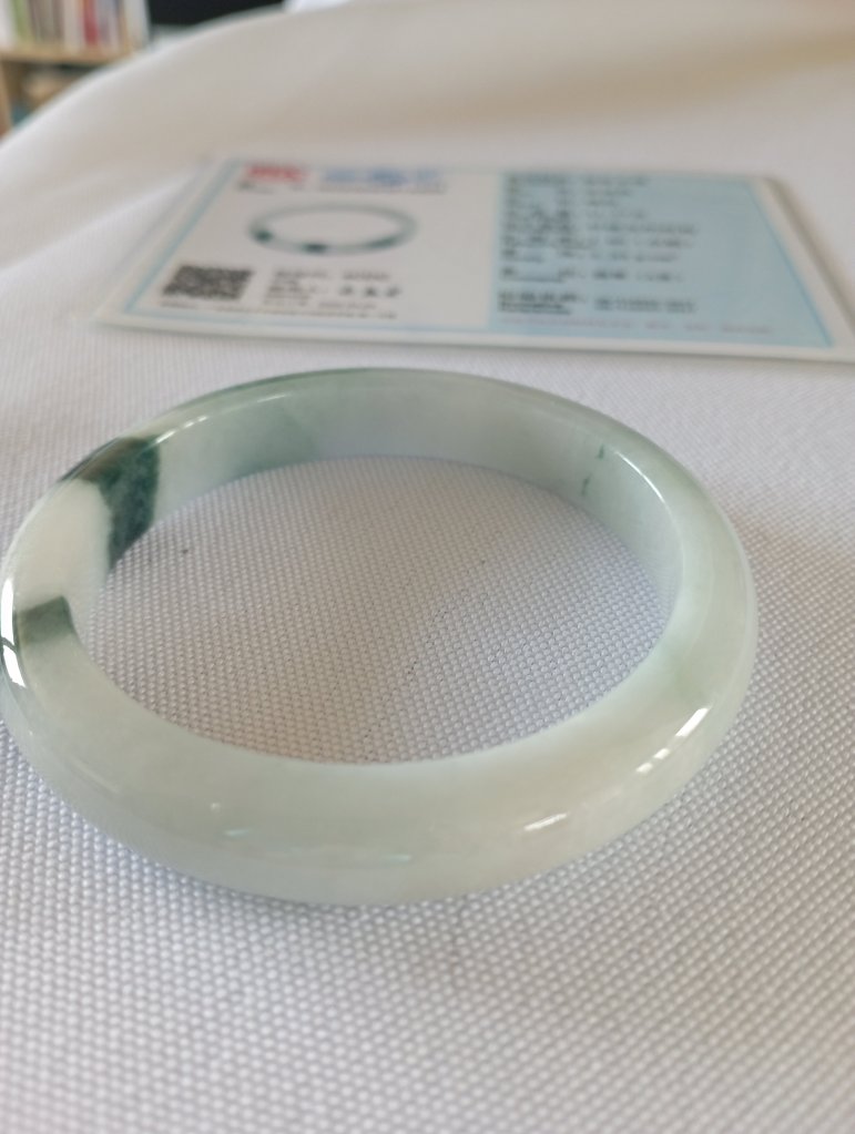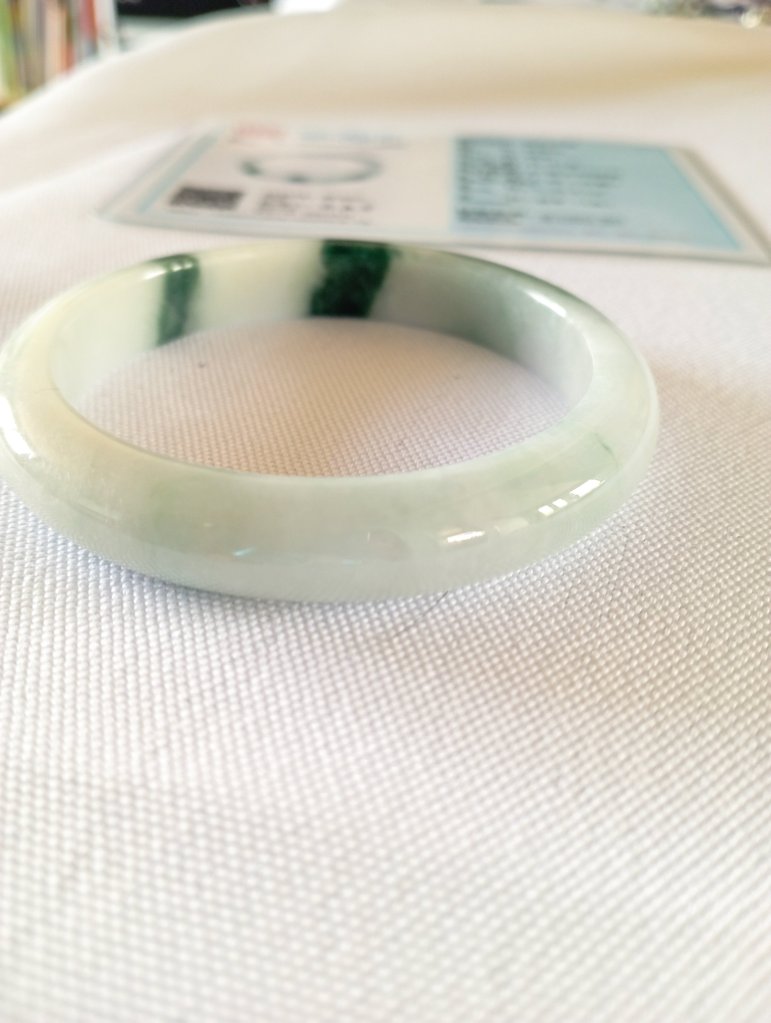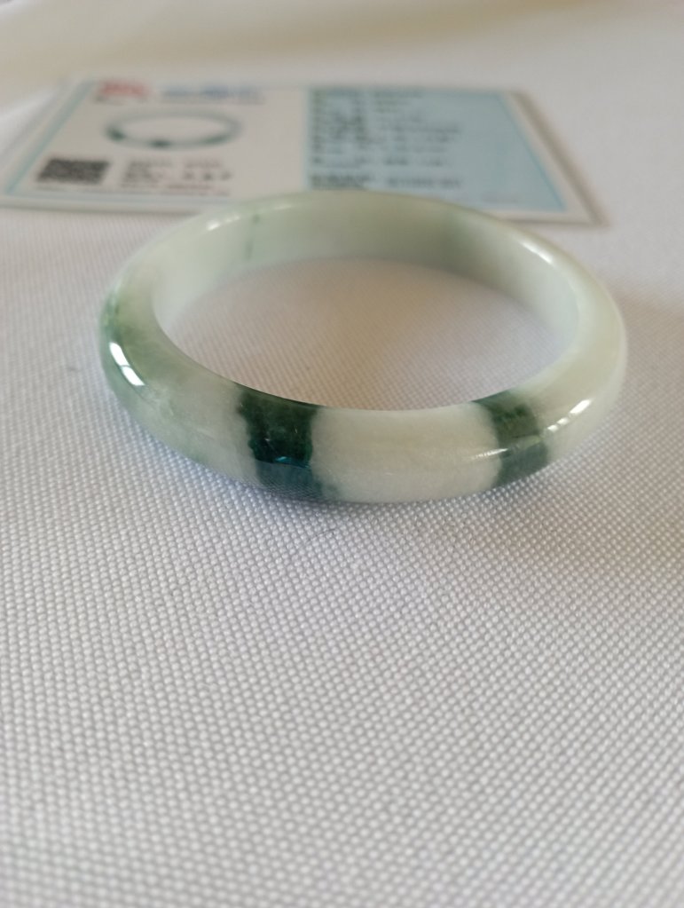 Gorgeous jadeite bangle with three patches of dark green blossoms measure 54.4 x 9.1 x 7.6mm, weighing 41.77g. It comes with a certificate of authenticity. £75