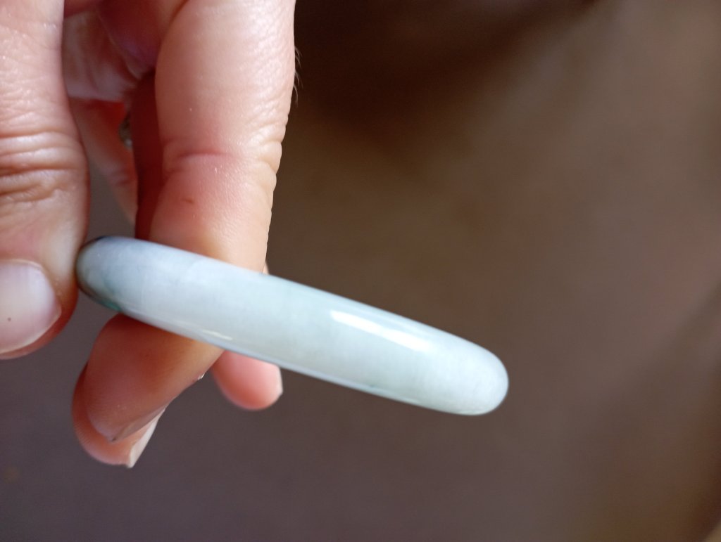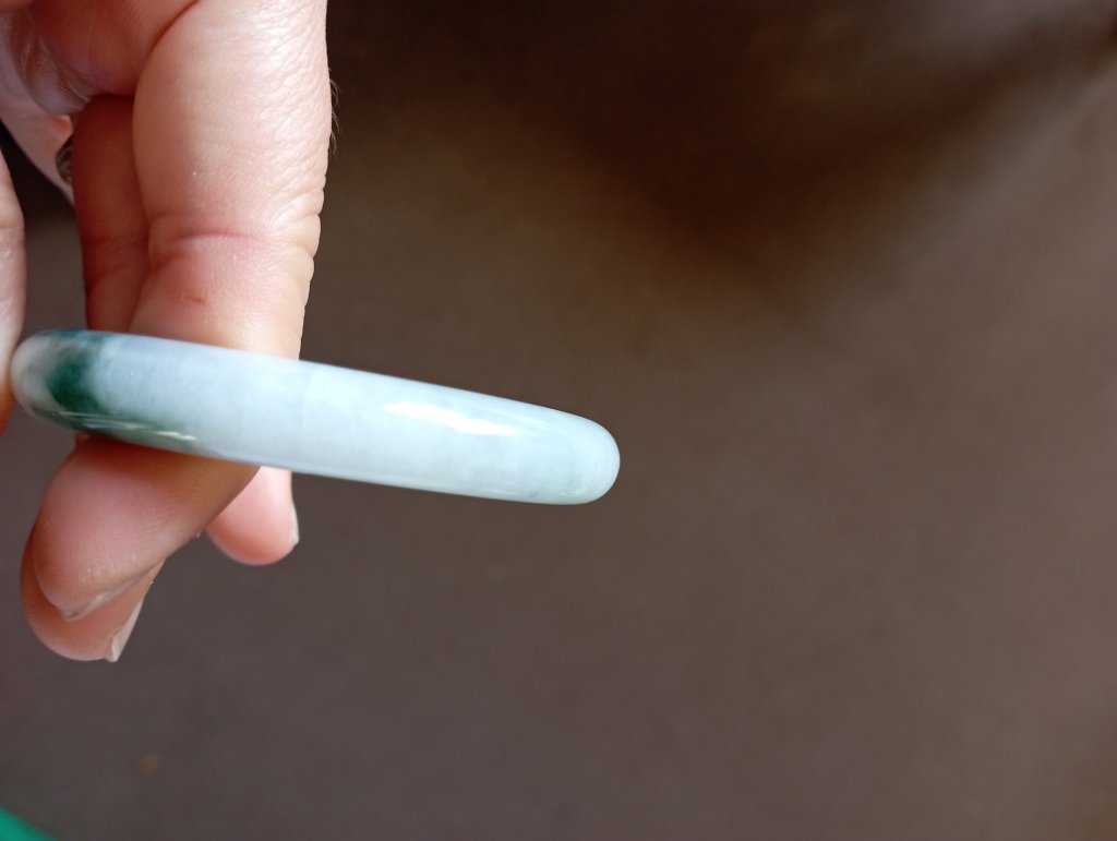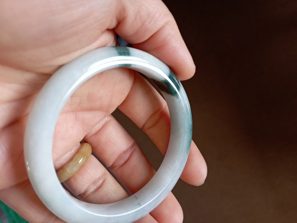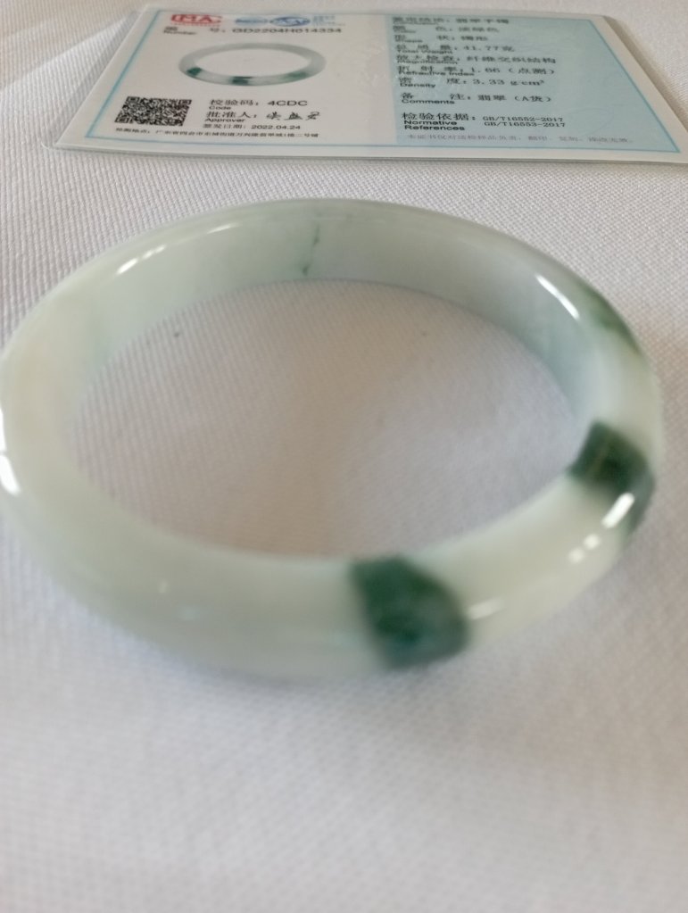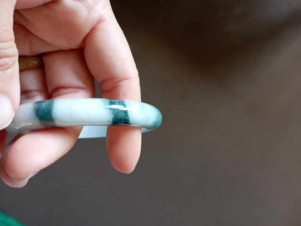 Gorgeous jadeite bangle with three patches of dark green blossoms measure 54.4 x 9.1 x 7.6mm, weighing 41.77g. It comes with a certificate of authenticity. £75