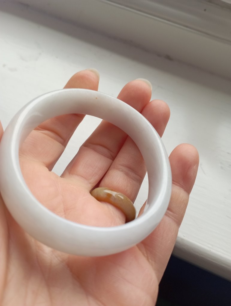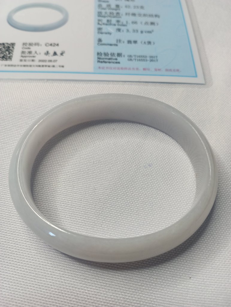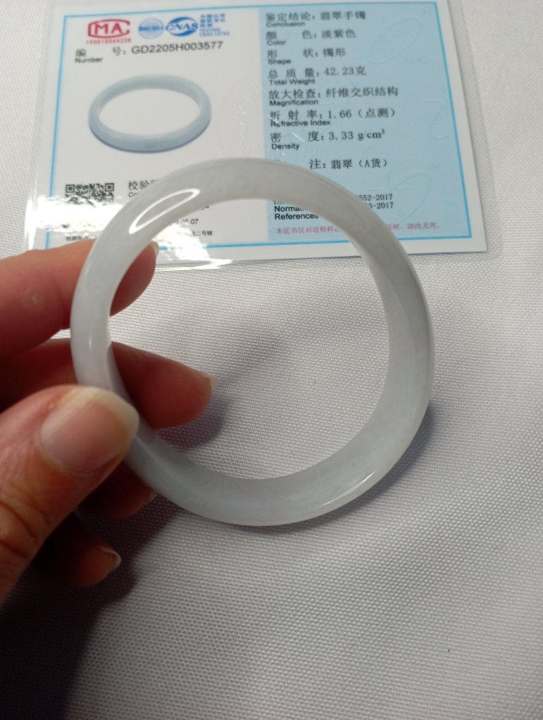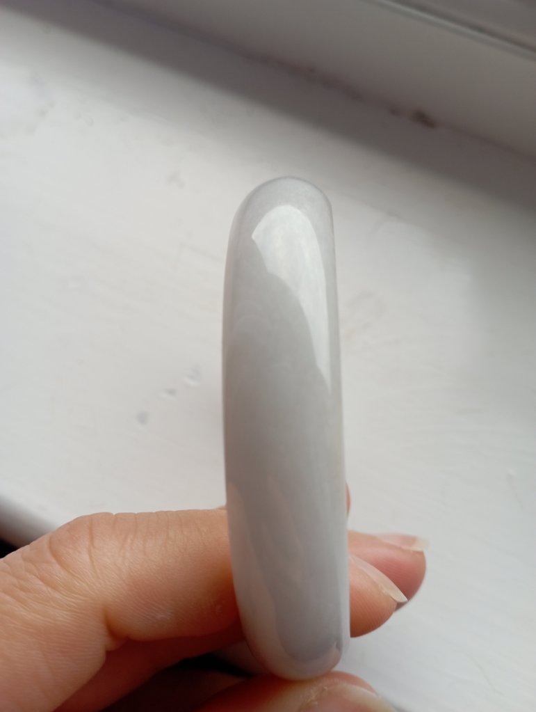 A very subtle purple jadeite bangle measures 61 x 50.6 X 13.3 X 7.3mm, due to its shape, fits up to 59mm only. Oval shape is popular with a lot of ladies who works in the office as it fits the wrist very well. £298