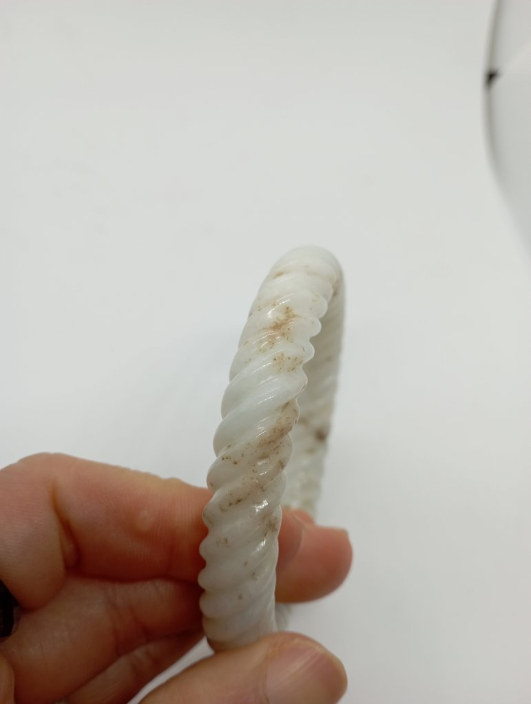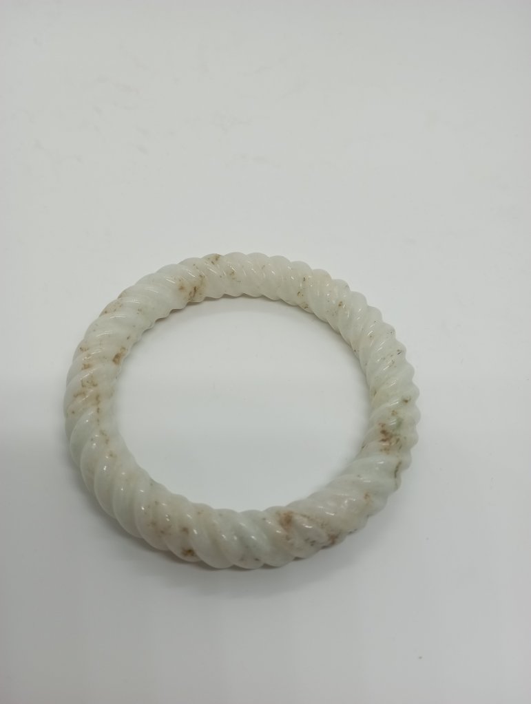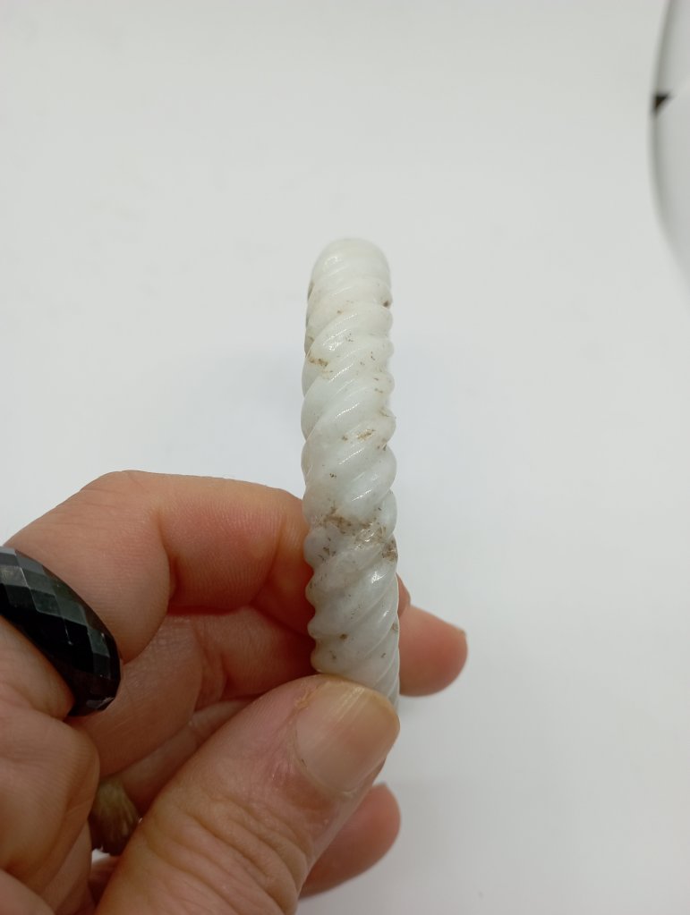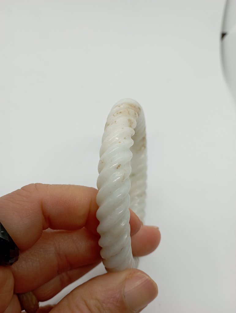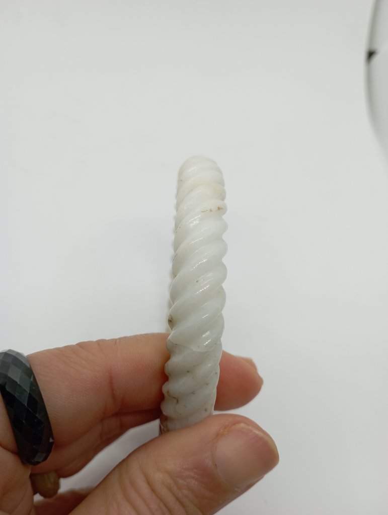 Braided bangles are time consuming to make. They are done in such way to remove imperfections. This bangle measures 56.6 X 11.3 X 10.9mm, is a great price for the size and work. It has an external crack that does not affect usage and can only be seen upon close inspection.