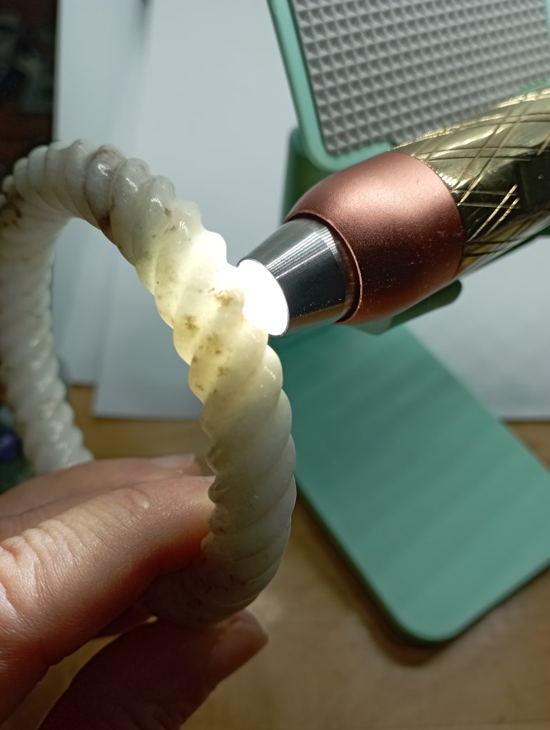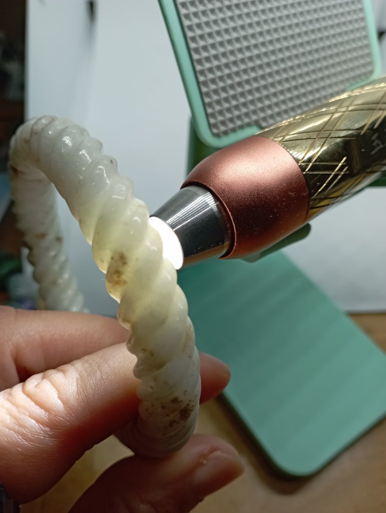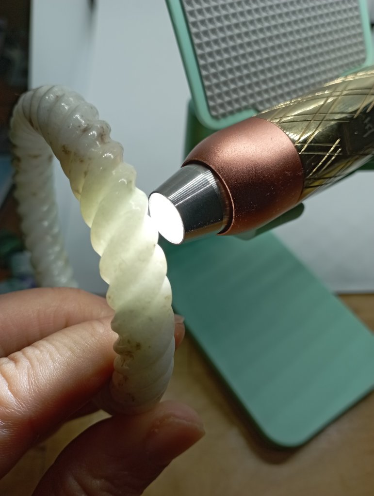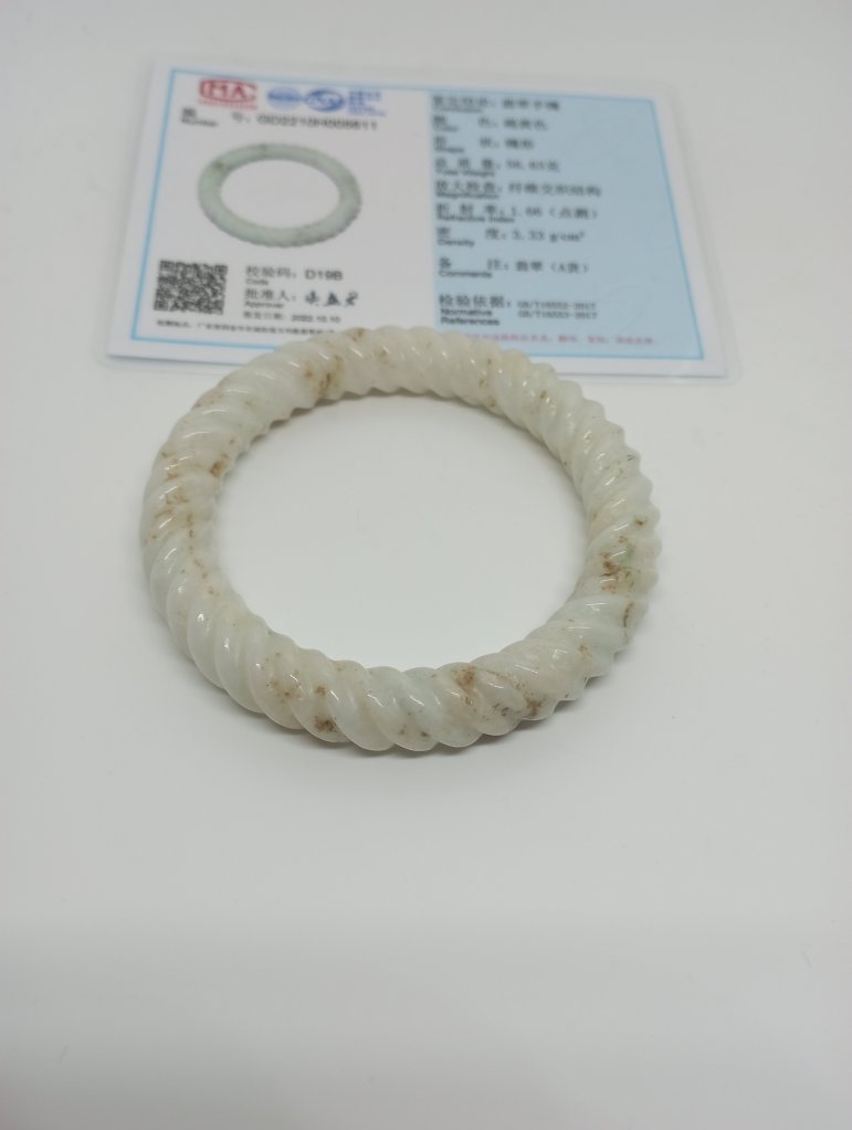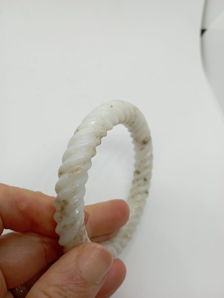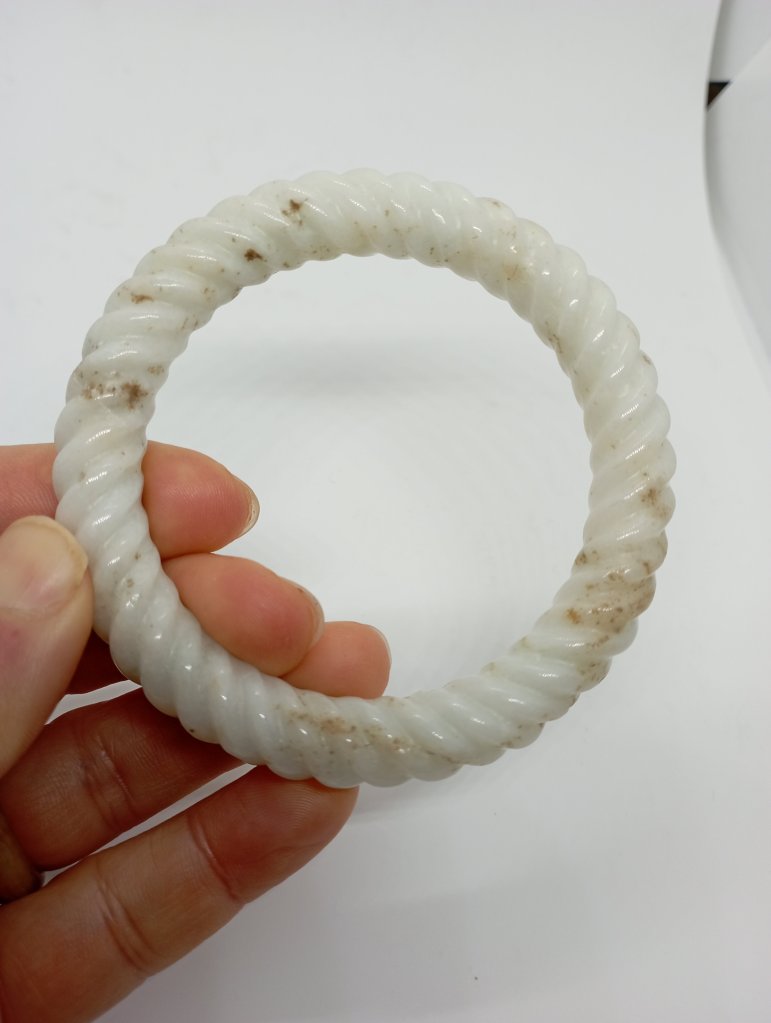 Braided bangles are time consuming to make. They are done in such way to remove imperfections. This bangle measures 56.6 X 11.3 X 10.9mm, is a great price for the size and work. It has an external crack that does not affect usage and can only be seen upon close inspection.