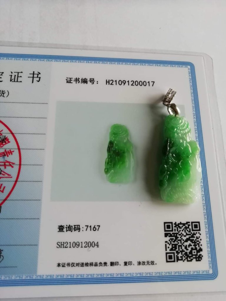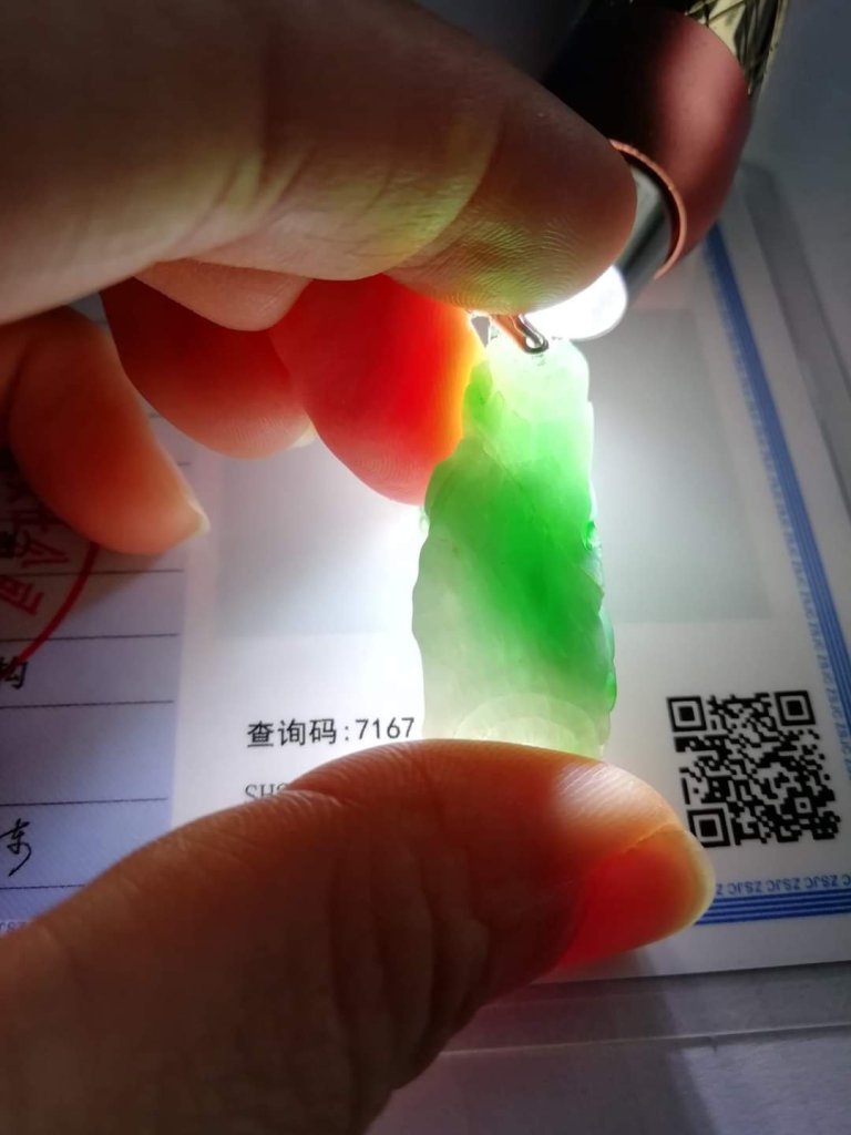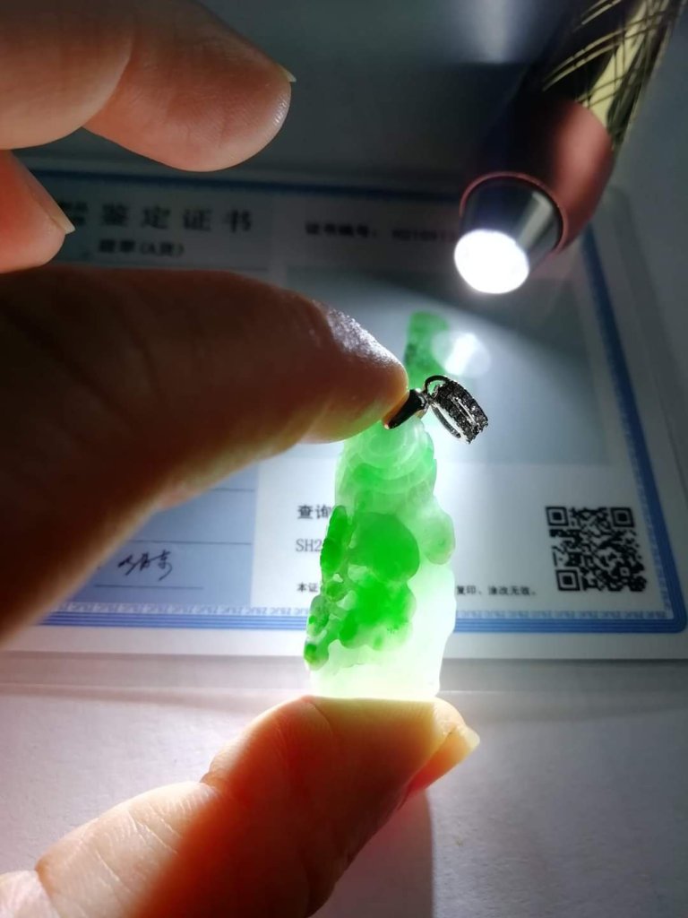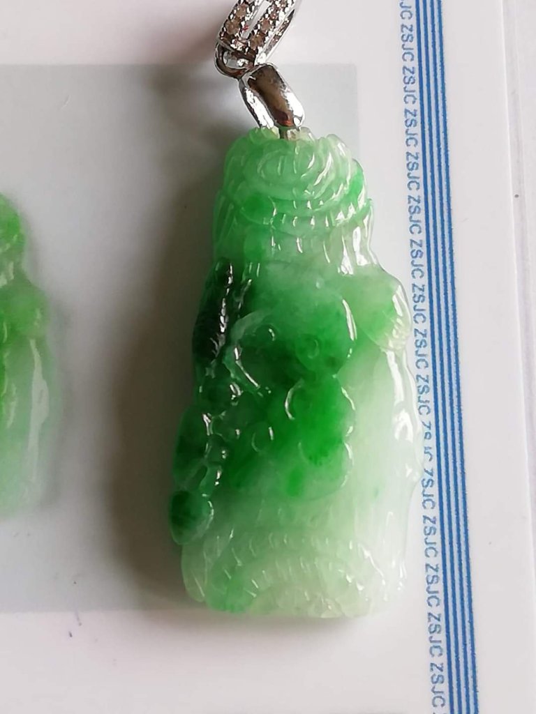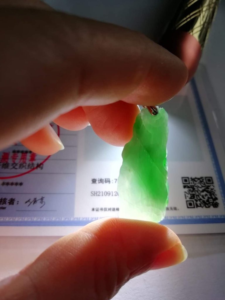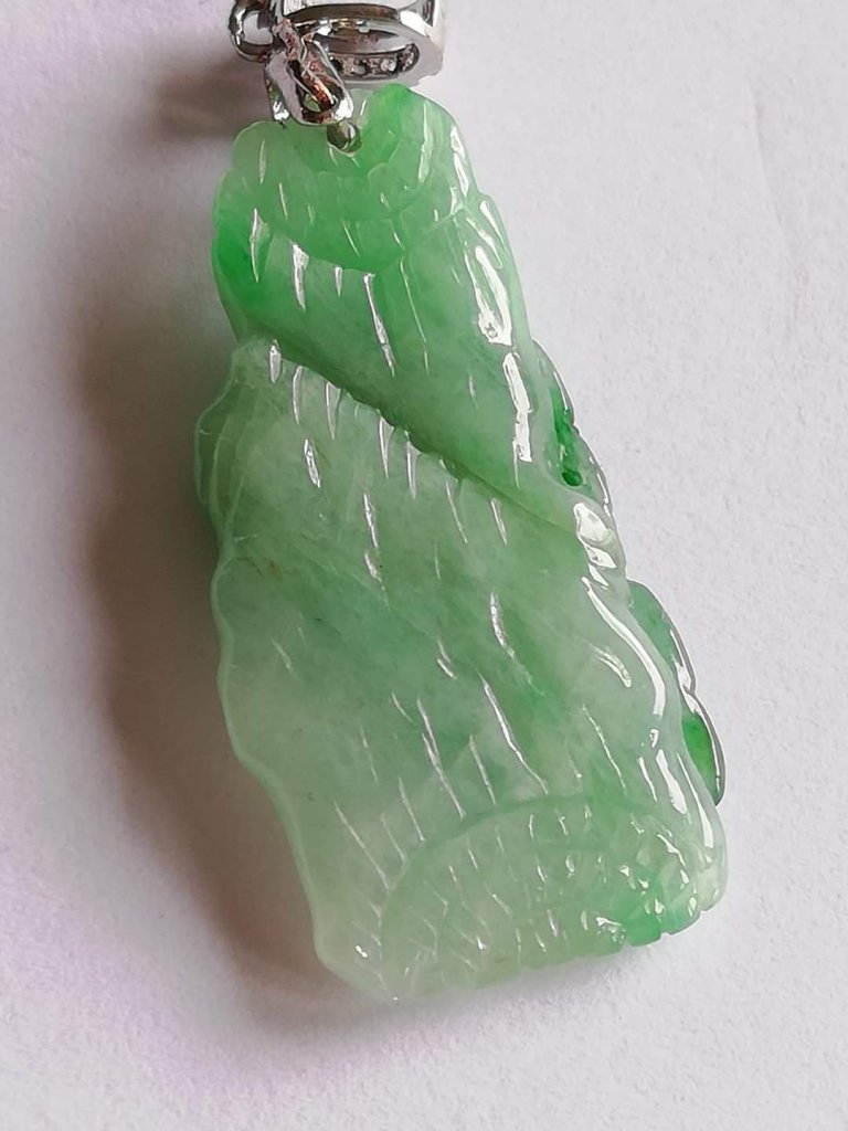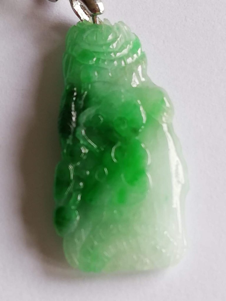 Gorgeous apple green pendant measures 31.4 x 16 x 5mm, no. 2404, it is engraved with ruyi growing on a cliff.