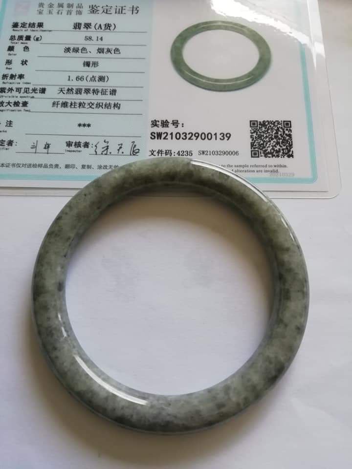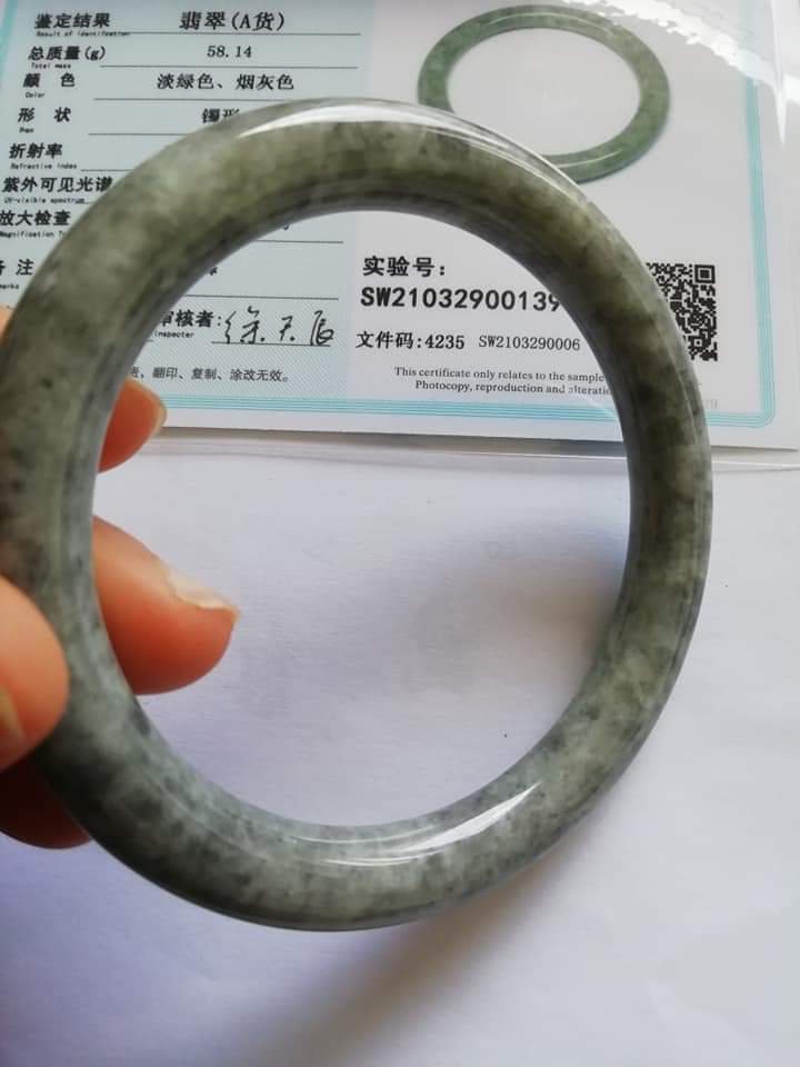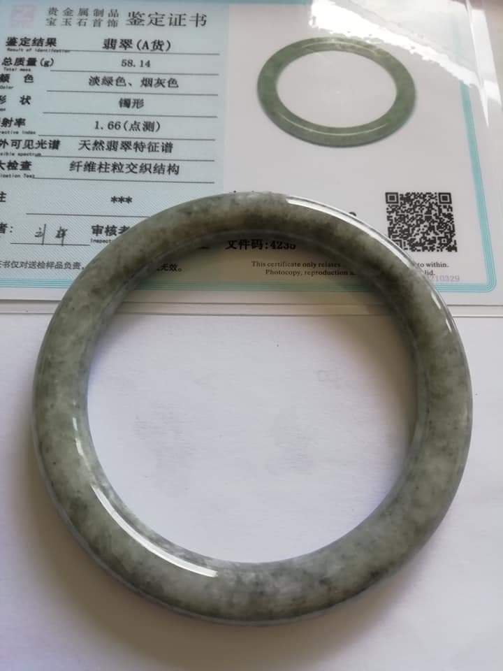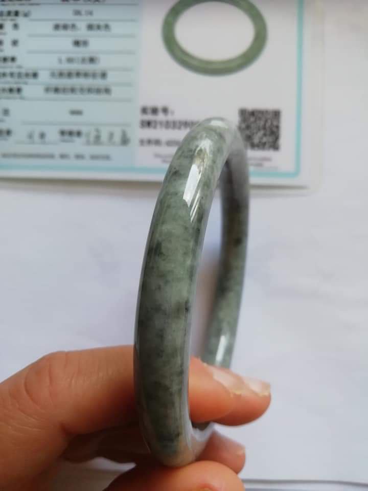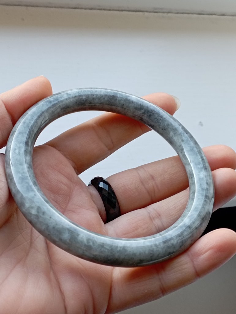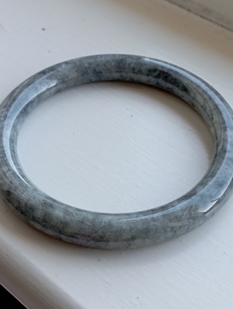 Bargain bangle, fits up to 65mm, measures 63.4 x 8.4 x 9mm, the smoky grey colour is great for deflecting negative energy and goes well with any outfit. Last two photos taken in day light