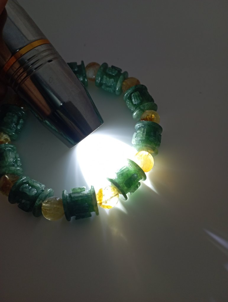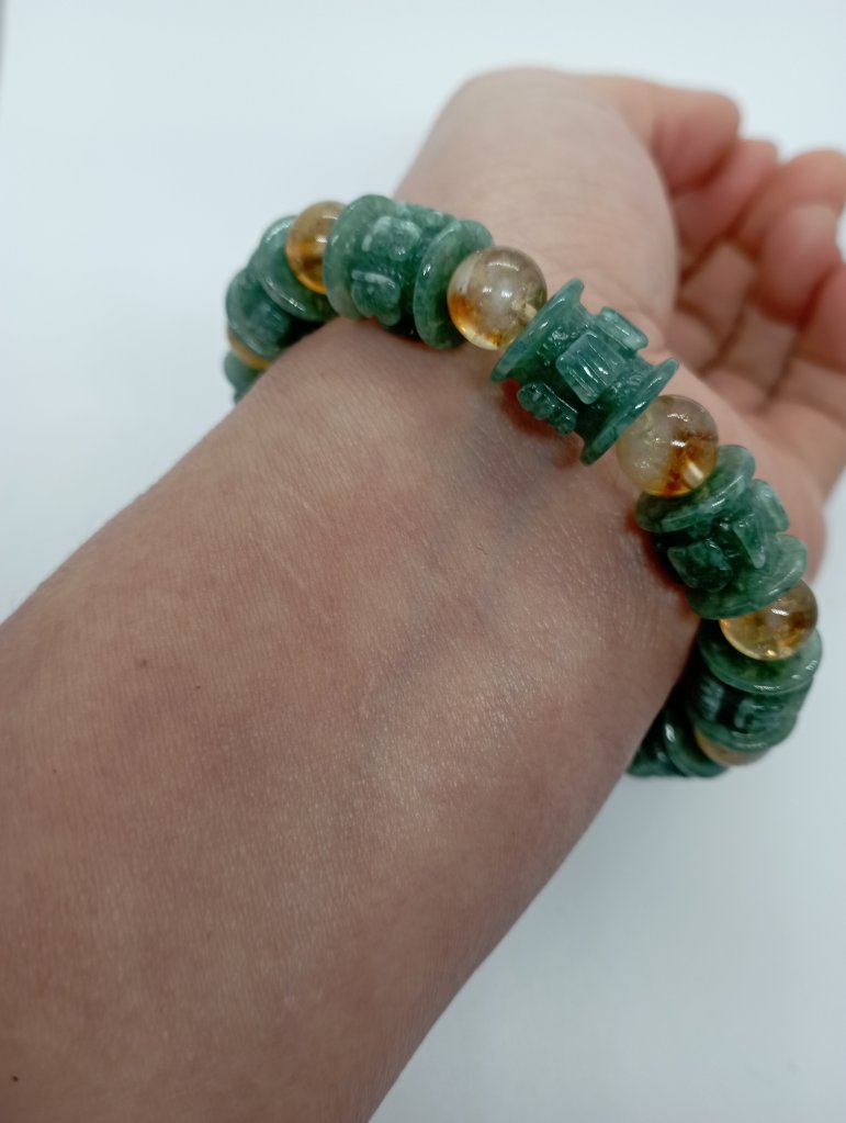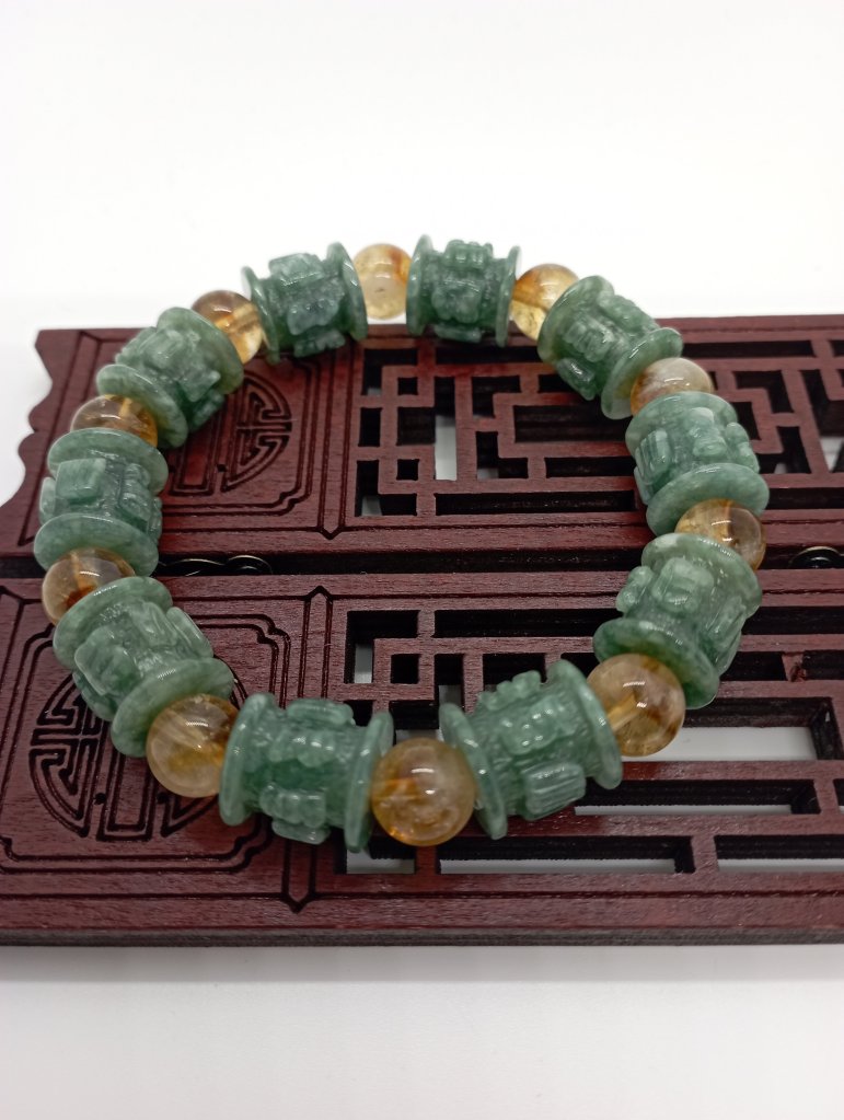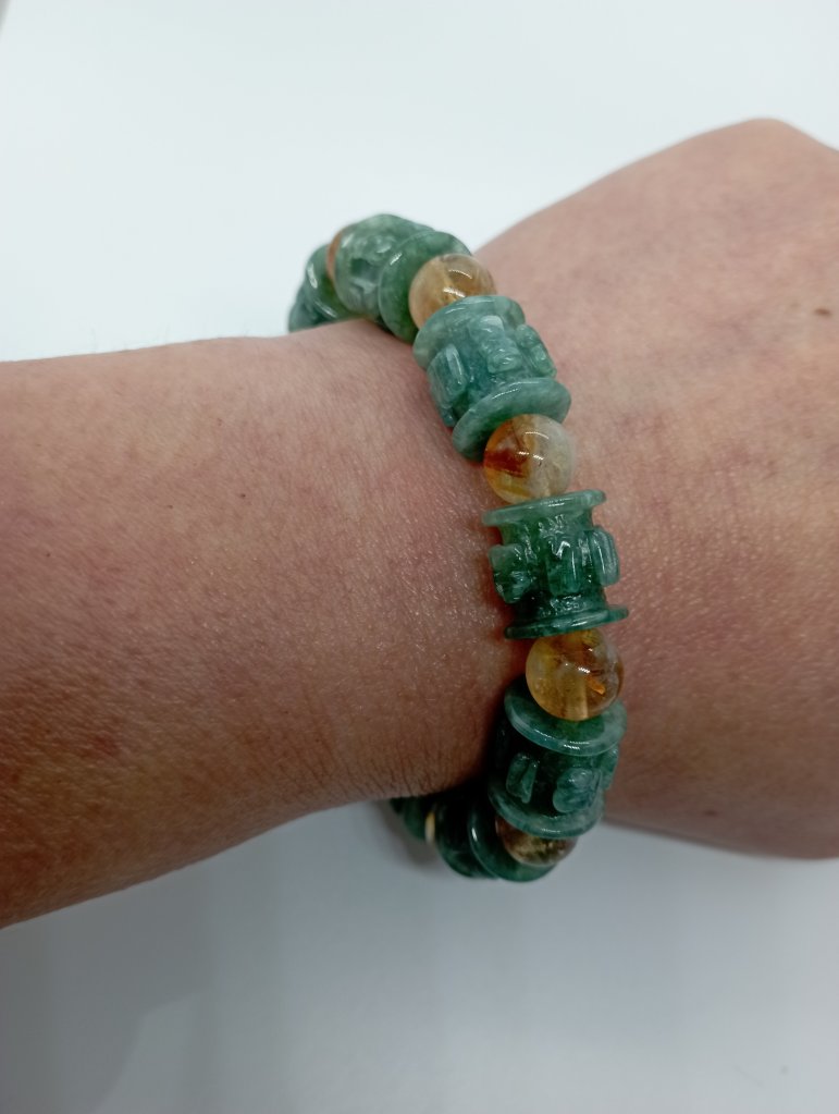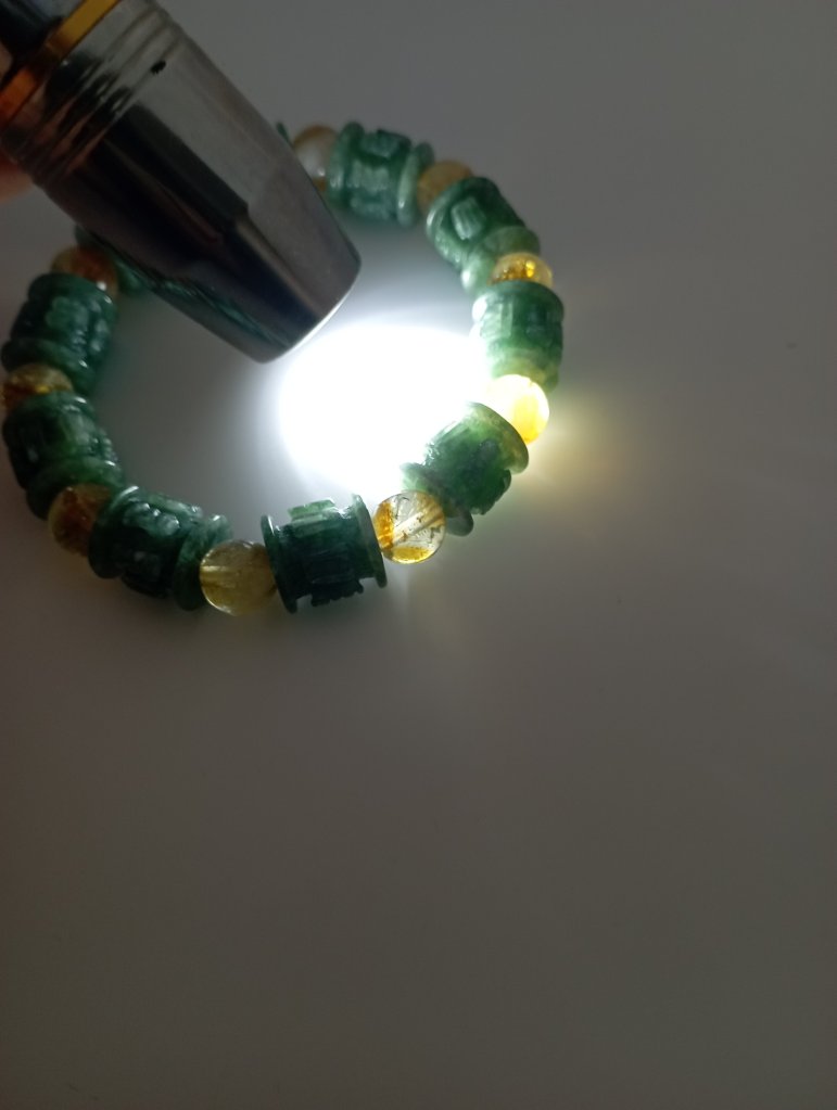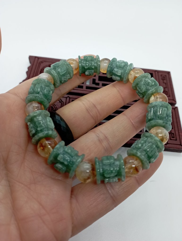 This gorgeous bracelet is made of 10 green jadeite barrels carved with the six syllable mantra, each measures approx 12 x 11.8mm with a 8.5mm amber bead in between each barrel. Comes with a certificate of authenticity, £149
