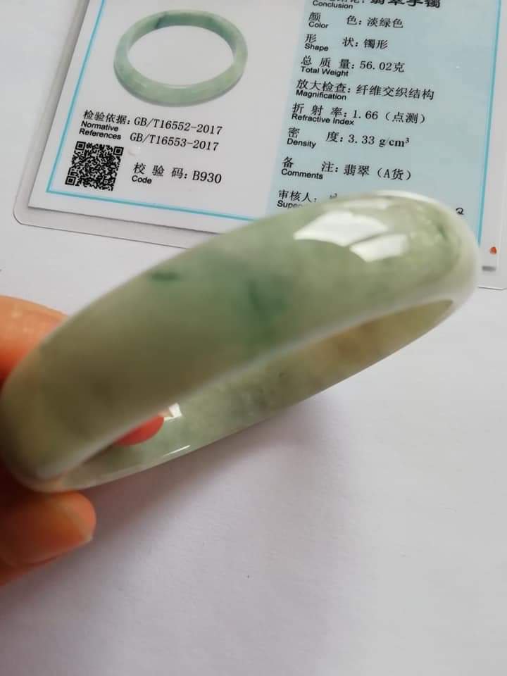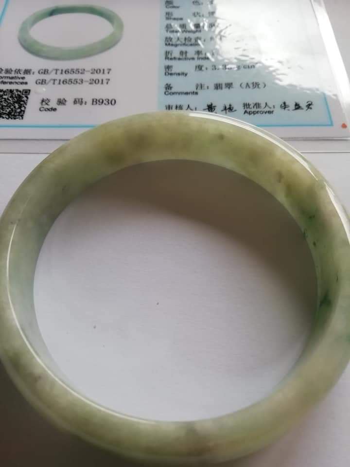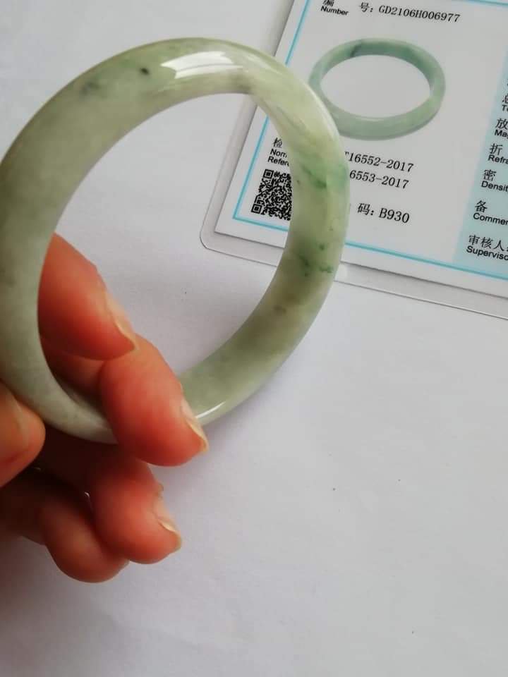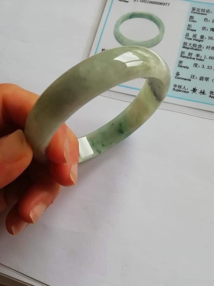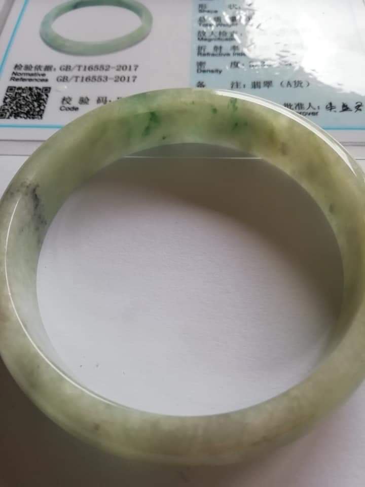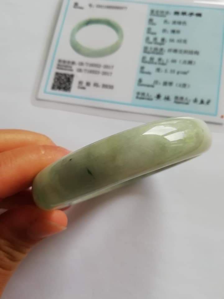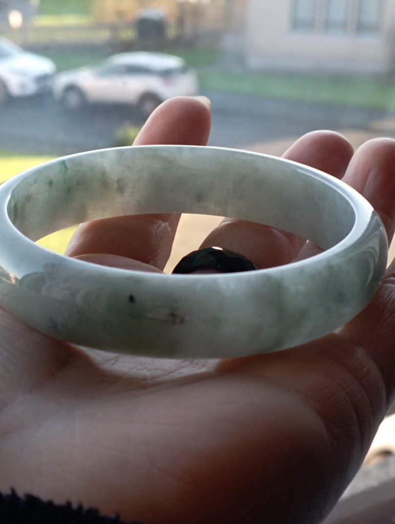 This is an icy green bangle with lovely blooms. There are some specks of smoky grey colour great for deflecting negative forces around you.