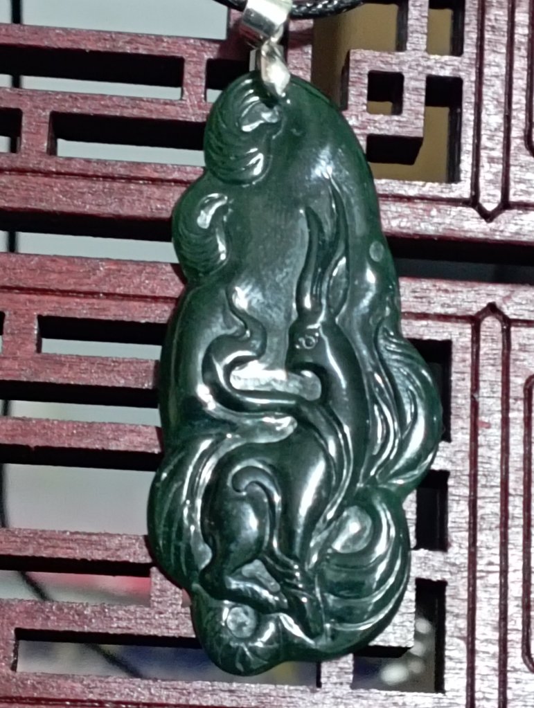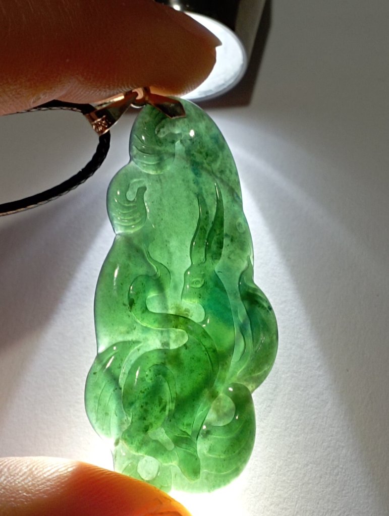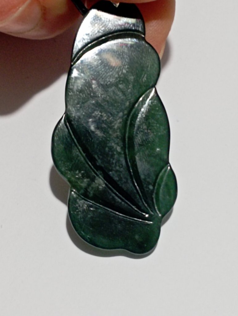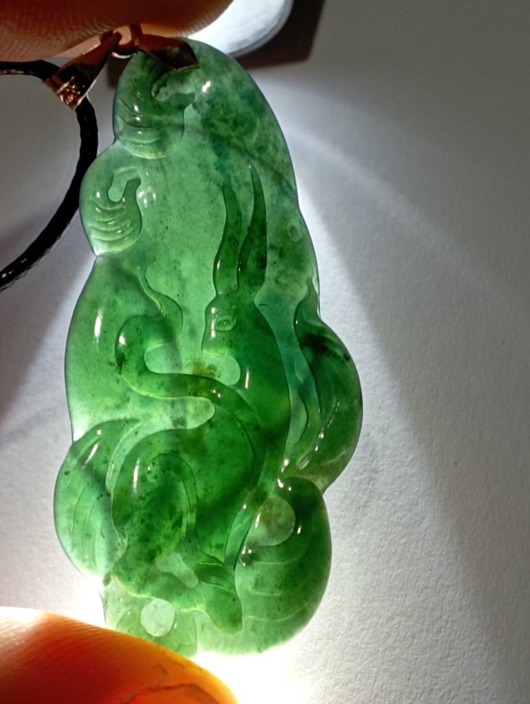 This pendant is made of Burmese jadeite where the colour is called lanshui, loosely translated as blue water which is a rare stone. It is a very dark green that looks almost black and when the light goes through, it is a beautiful green. Measures 44 X 21 x 4mm, comes with a certificate of authenticity. £88