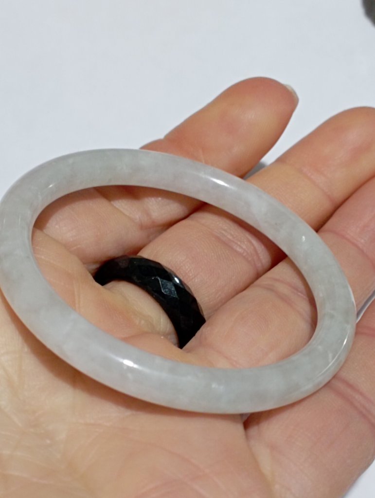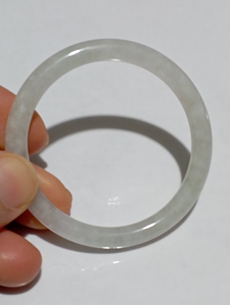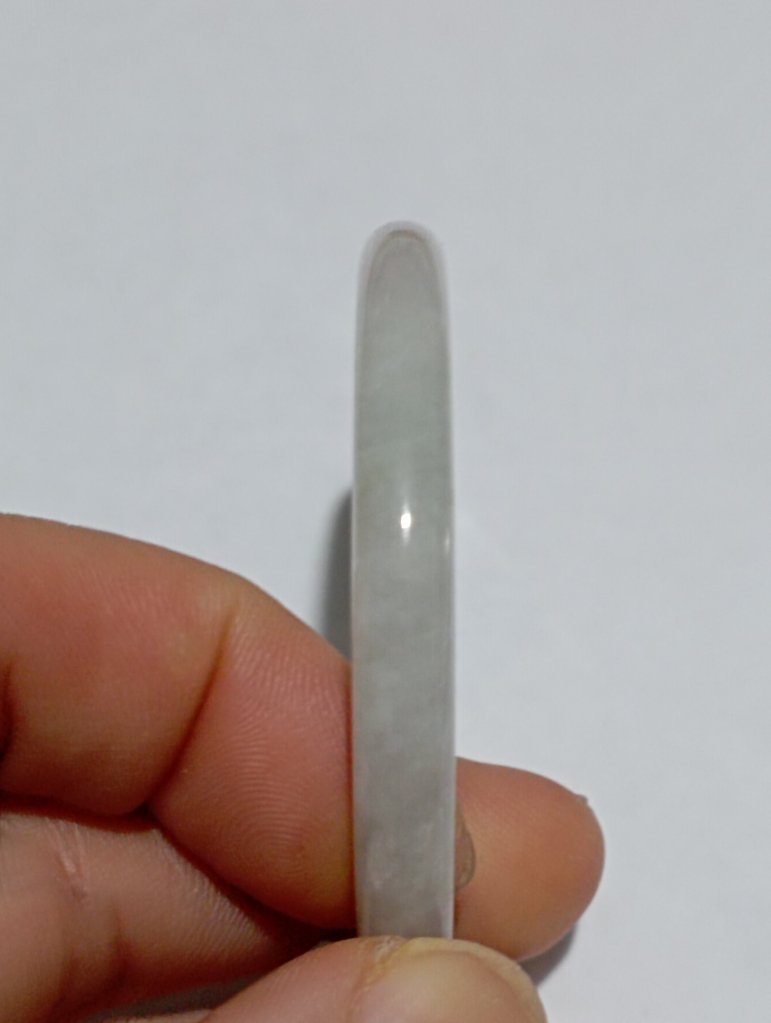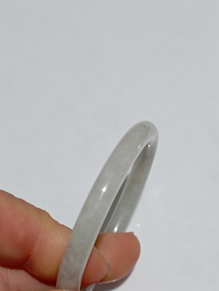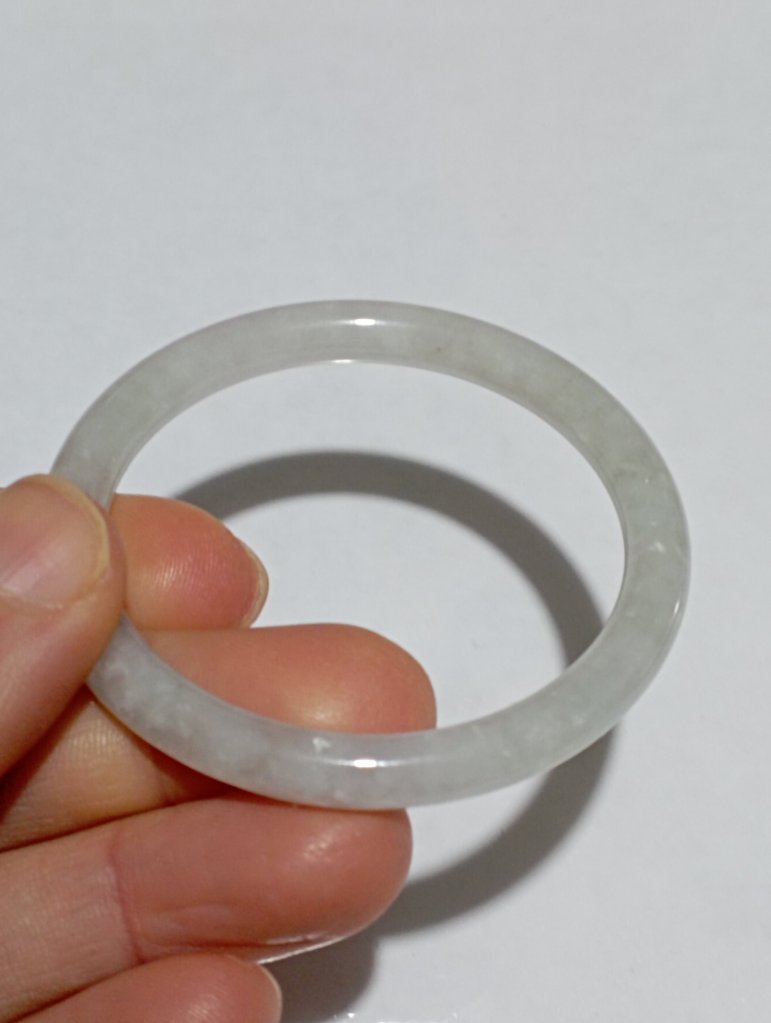Jade bangle is often gifted to children and thought to have protective and lucky-charm energy. This round icy jadeite bangle measures 44 X 5.8 X 5.8mm, comes with a certificate of authenticity.
