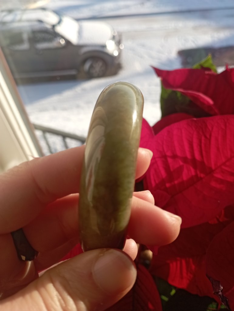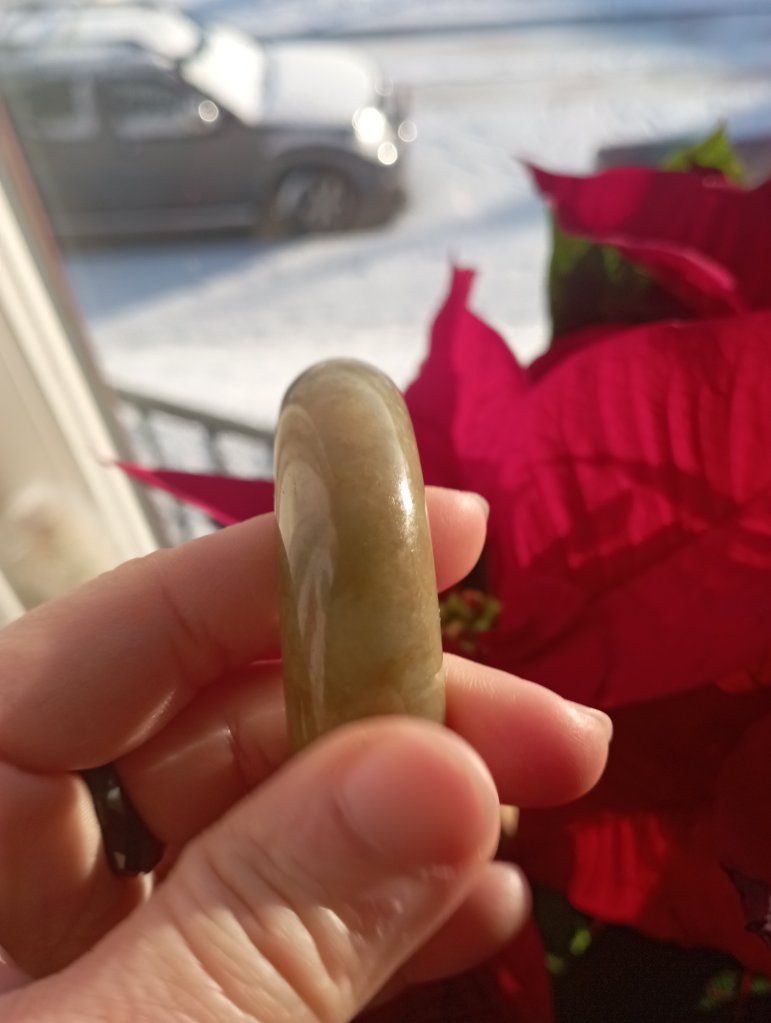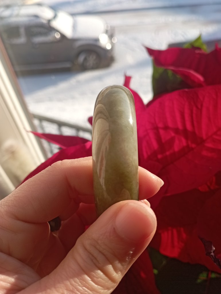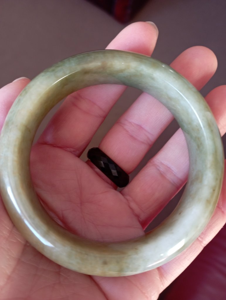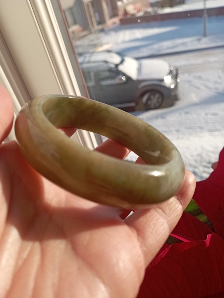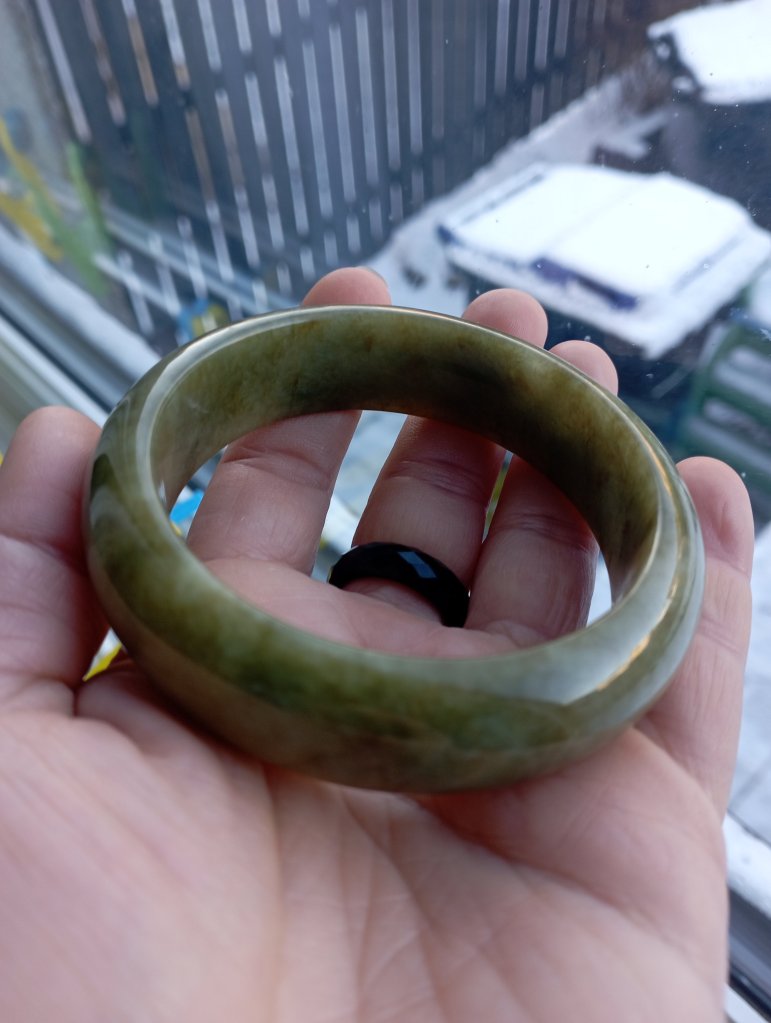 With a width of 17.6mm, this Burmese jadeite bangle measures 58.4mm in internal diameter and 9.3mm thick, the colour is a rich tea green colour that is very attractive. Comes with a certificate of authenticity. £398