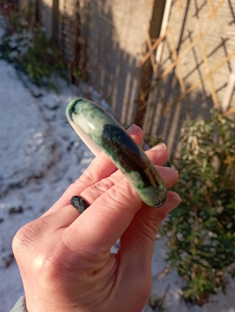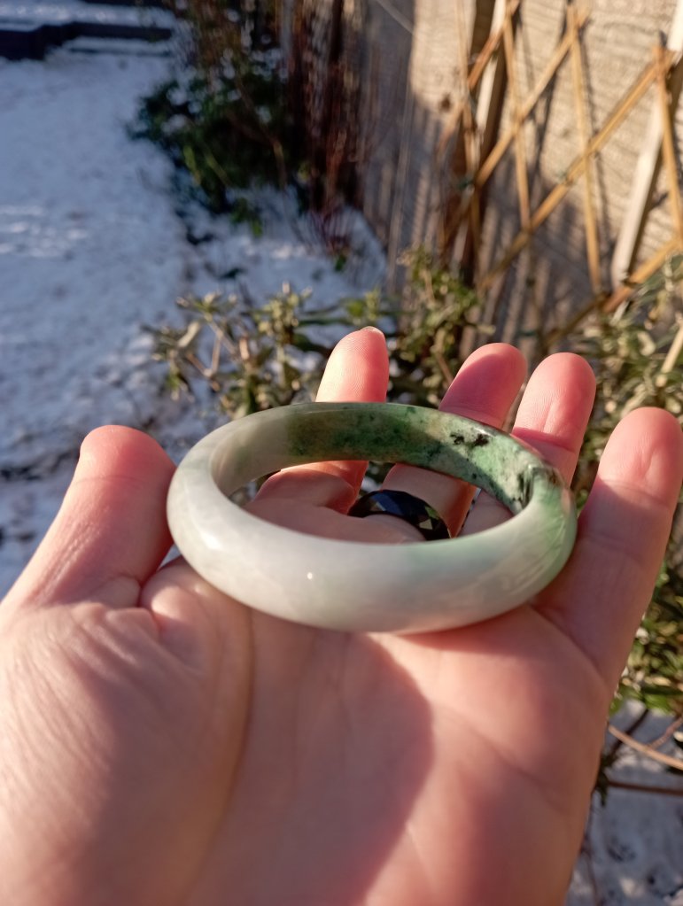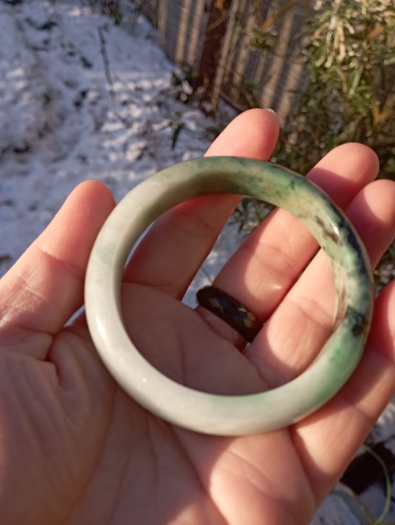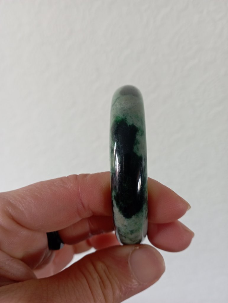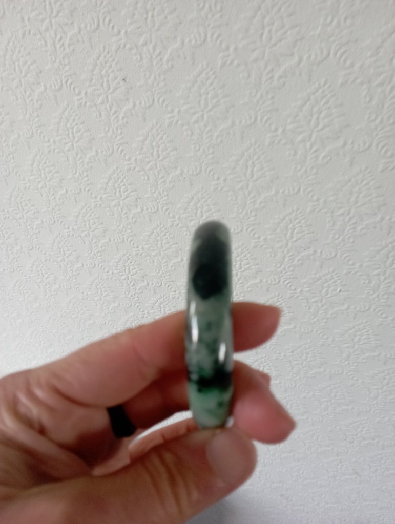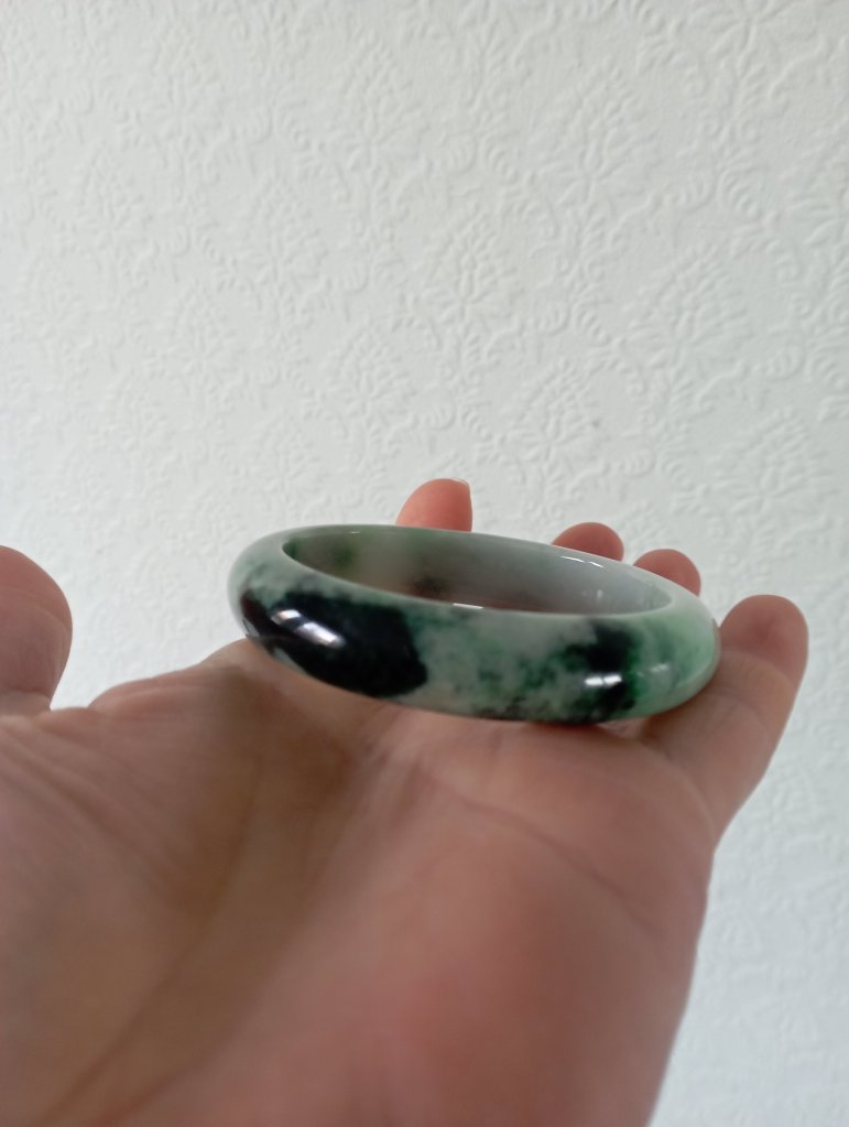 A very beautiful bangle darker green on one side and lighter green on the other with lovely apple green in places. Measures 54.3 X 12.8 X 8mm, it has internal cracks that do not affect usage. The price reflects the imperfections but definitely a bargain just for the colour. Comes with a certificate of authenticity. £79