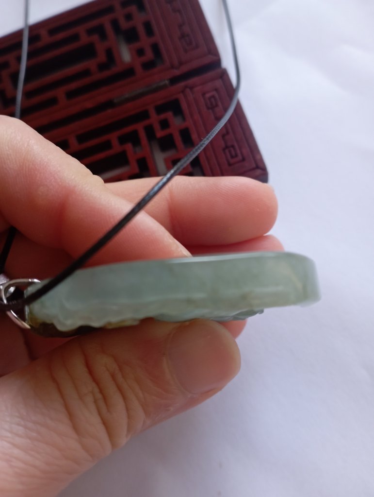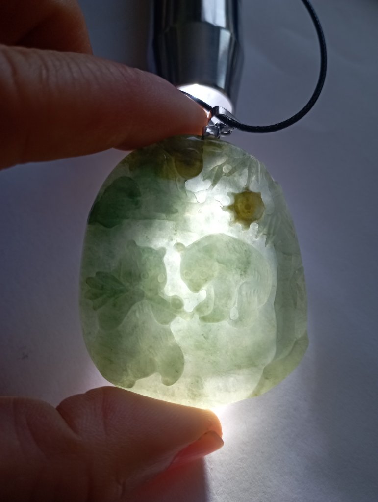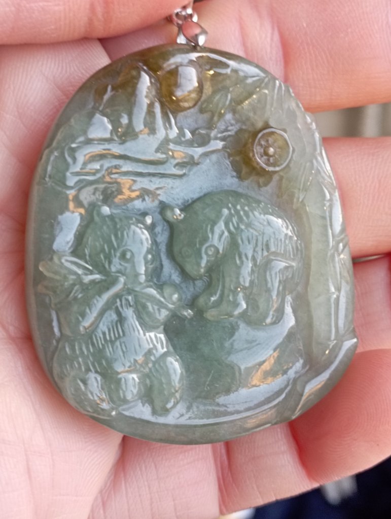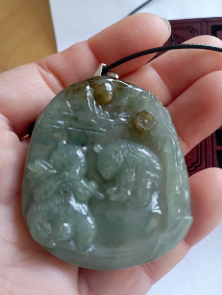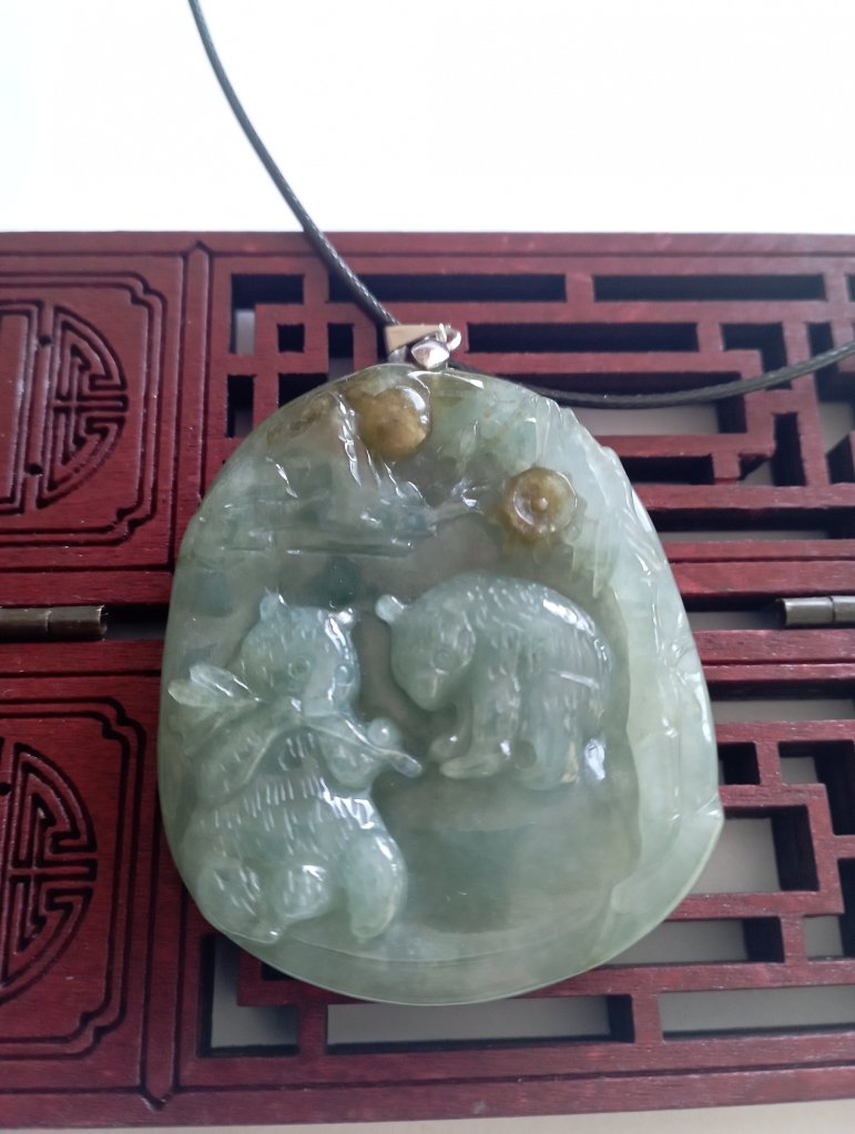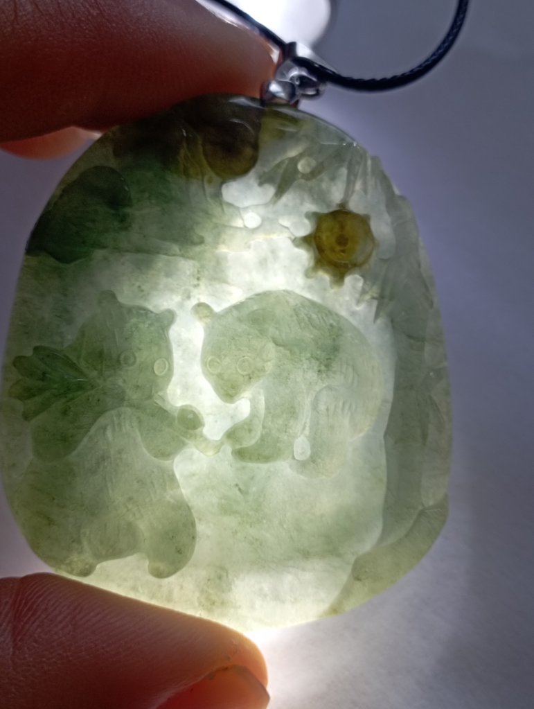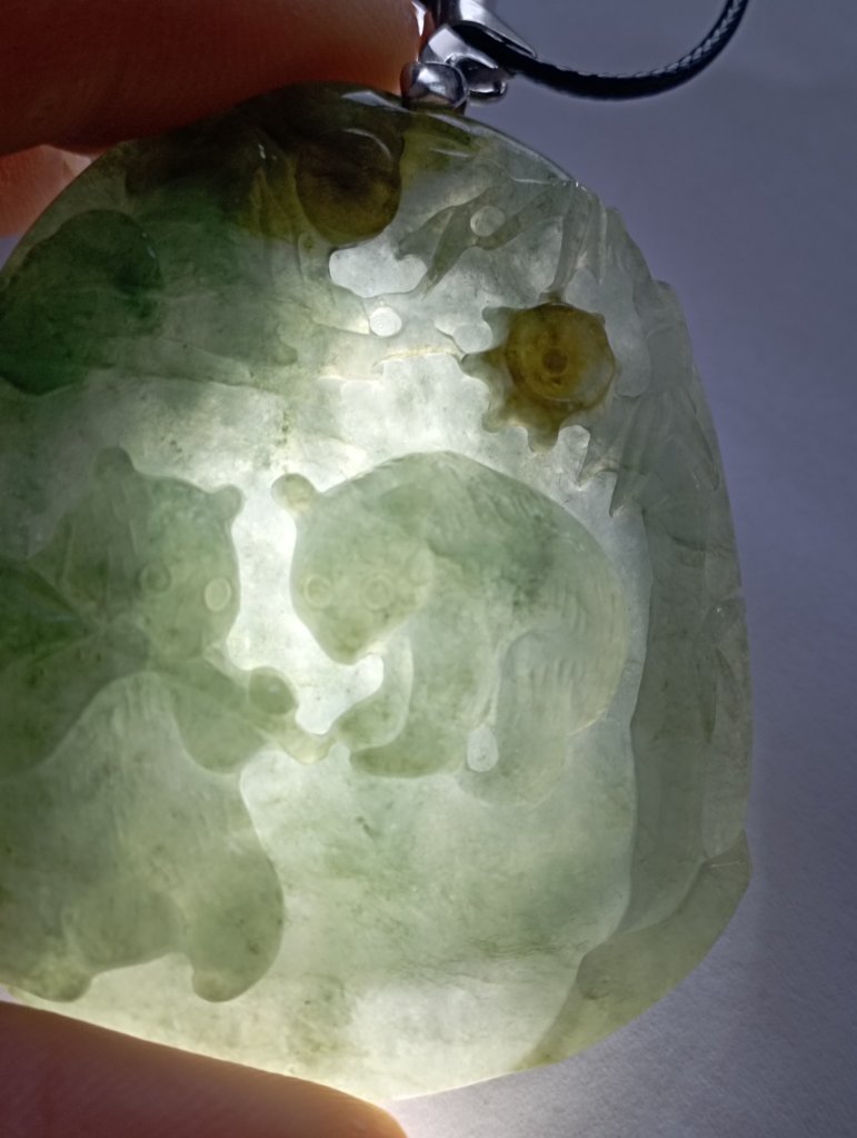 The jade has very good lustre and translucency with some yellow right on the sun and windmill, it is engraved with a pair of panda chewing on bamboo with the sun on top and the hill behind them.