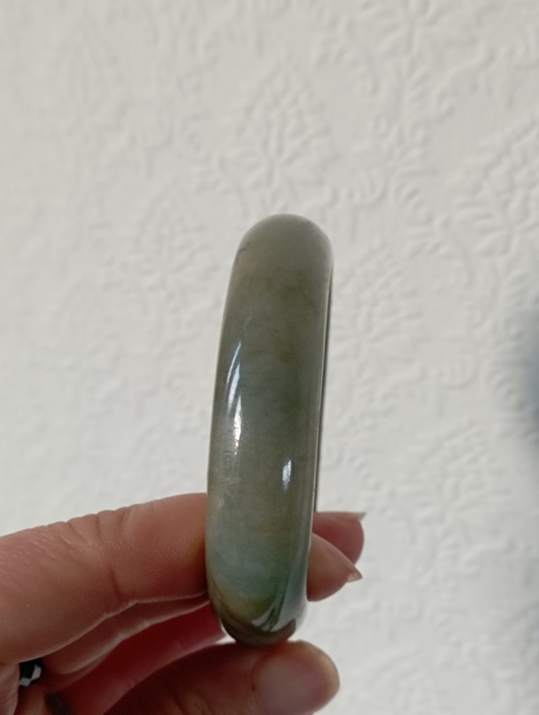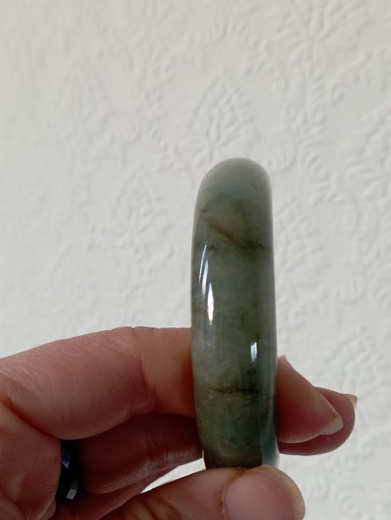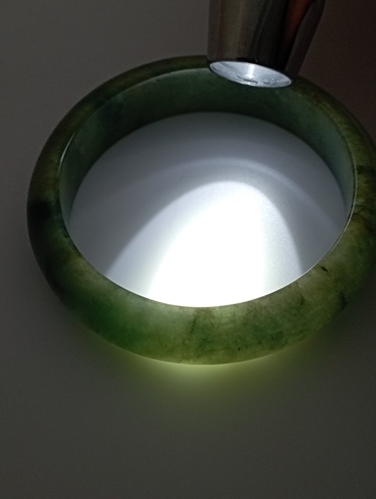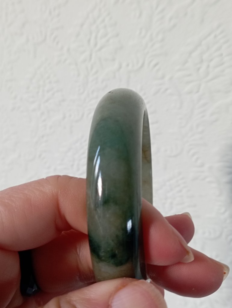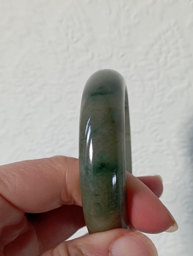 Lovely wide green jadeite bangle measures 56.7 X 15.3 X 9.2mm with gorgeous blooms. Pictures against the wall taken in indoor natural lights. Comes with a certificate of authenticity, £155