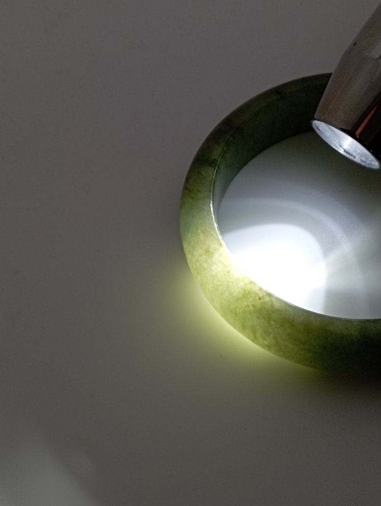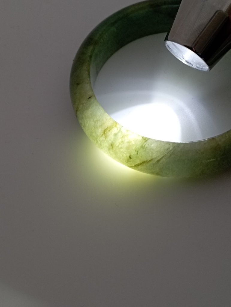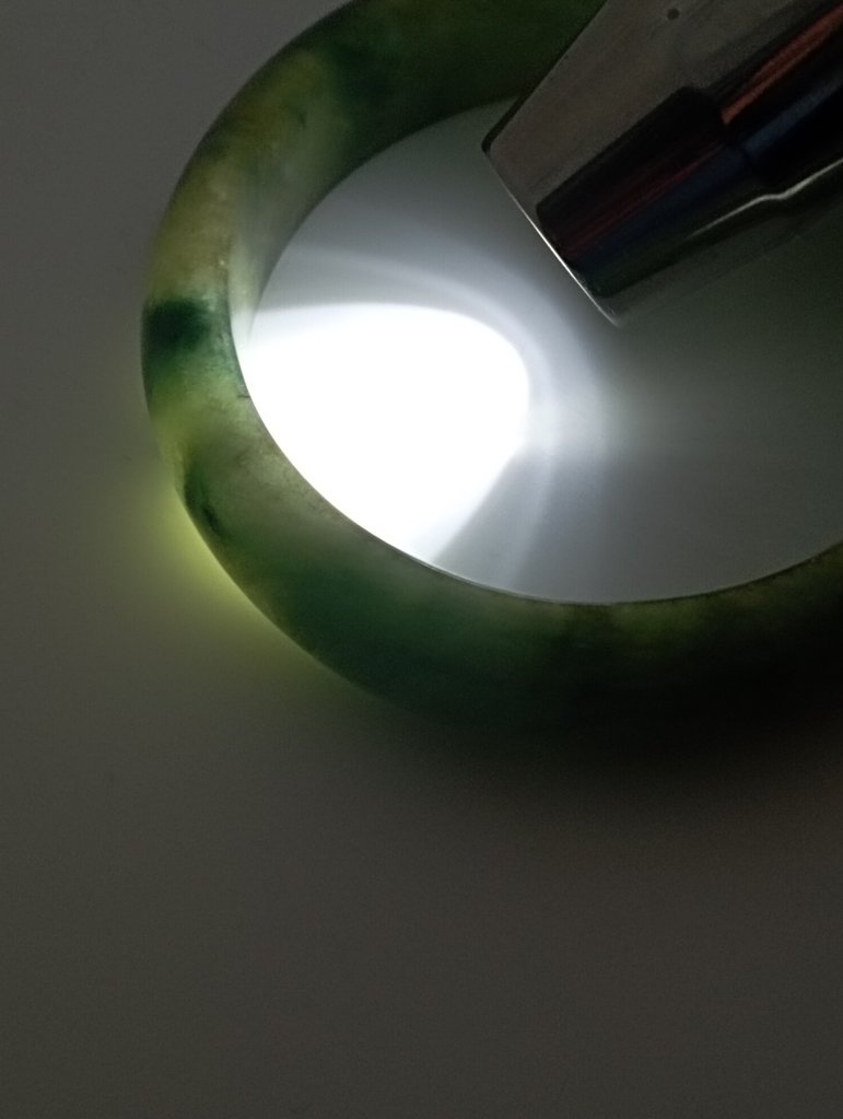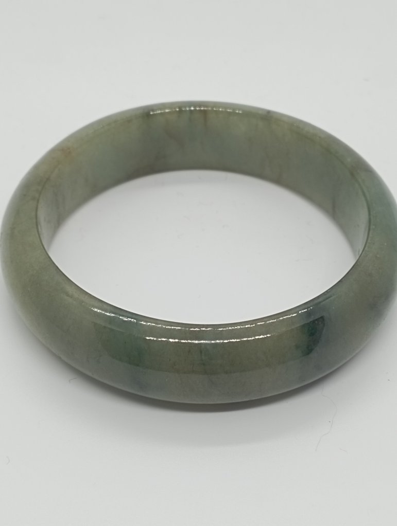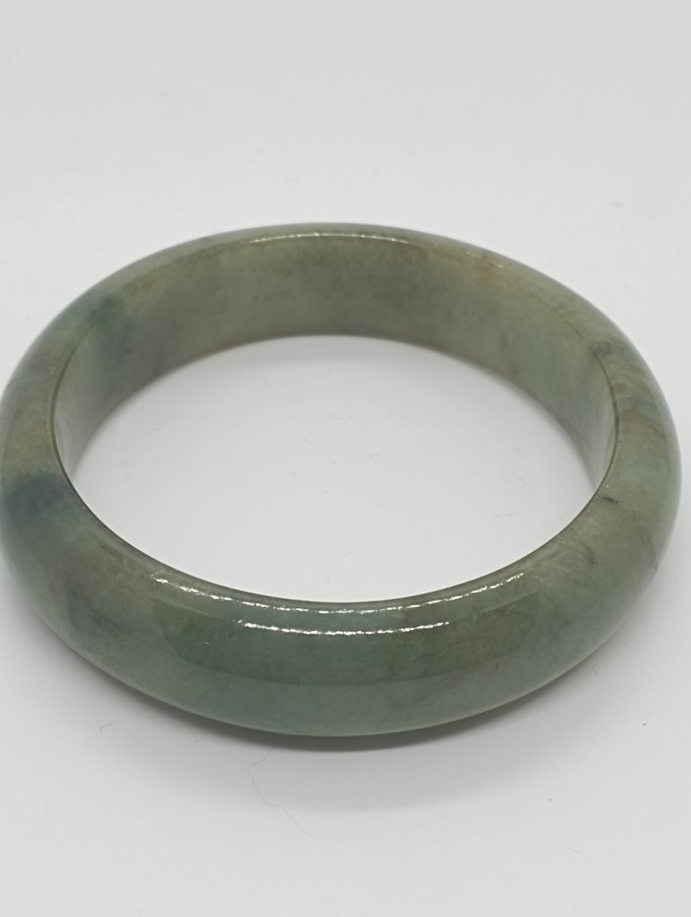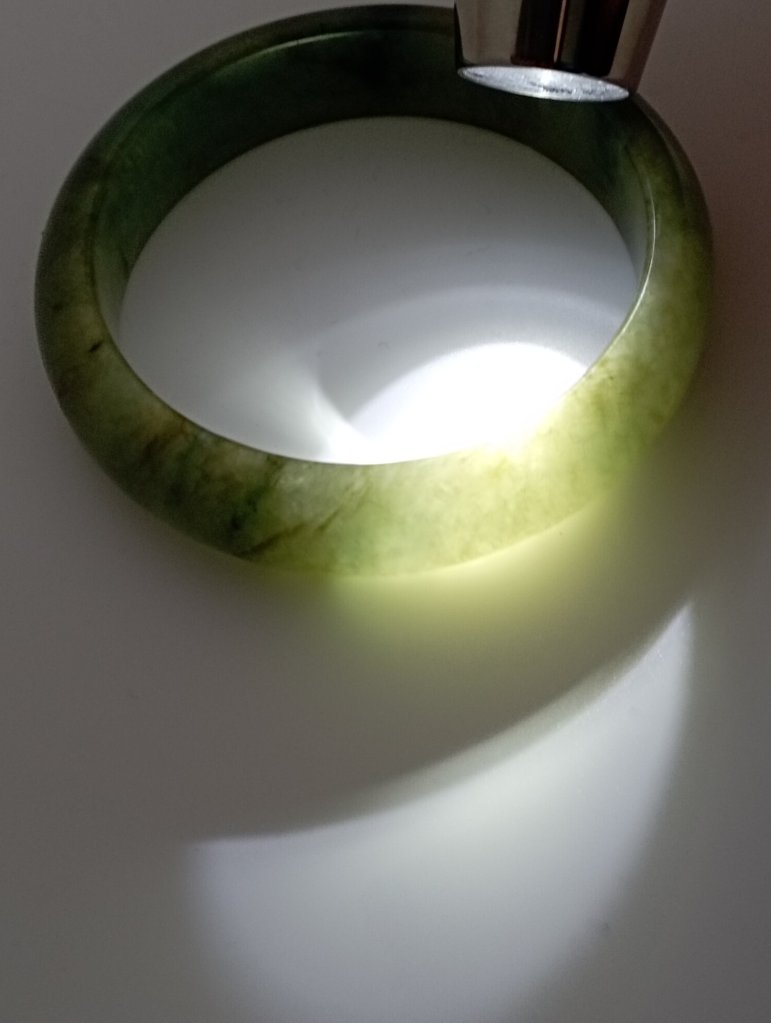 Lovely wide green jadeite bangle measures 56.7 X 15.3 X 9.2mm with gorgeous blooms. Pictures against the wall taken in indoor natural lights. Comes with a certificate of authenticity, £155