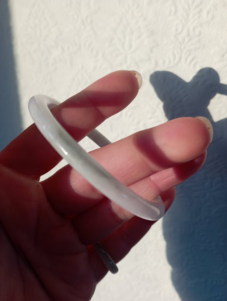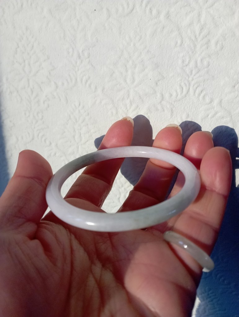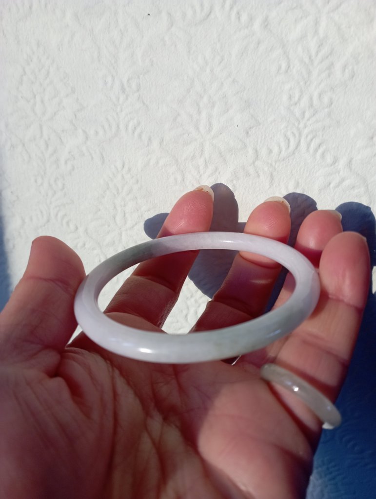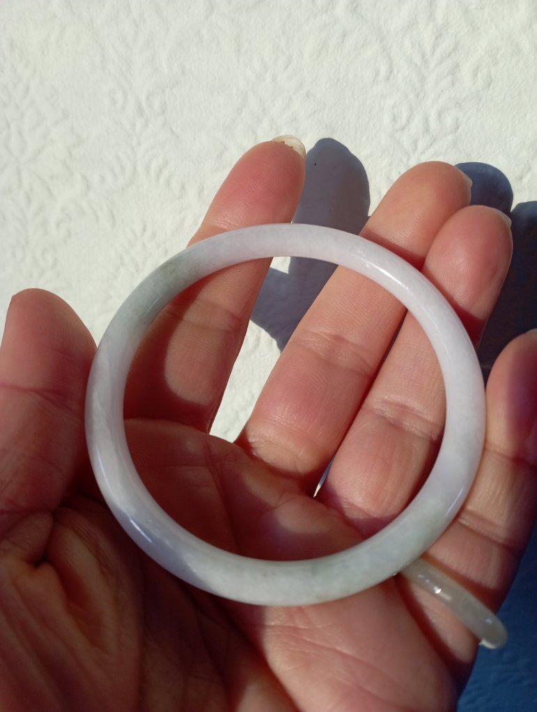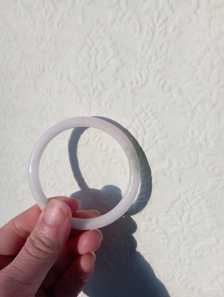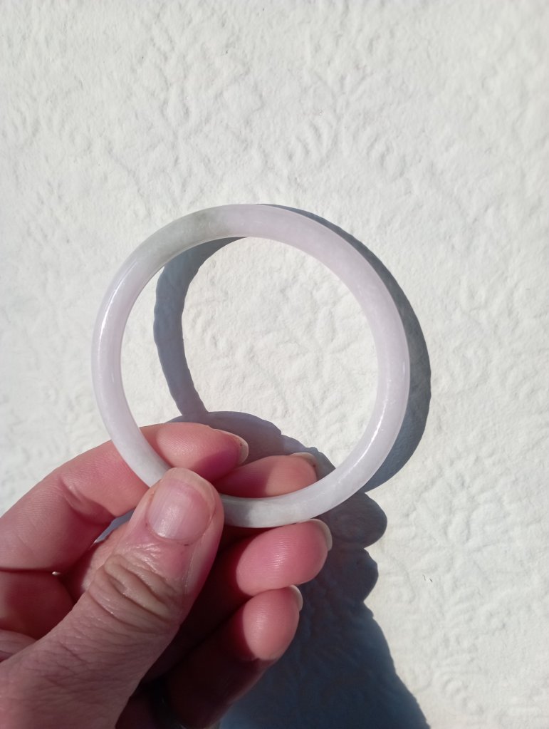 A purple base round bangle with blooms fits 55mm, measures 53.8 X 5.7 X 7.2mm. It has internal cracks hence the price. It does not affect usage. Comes with a certificate of authenticity. £49