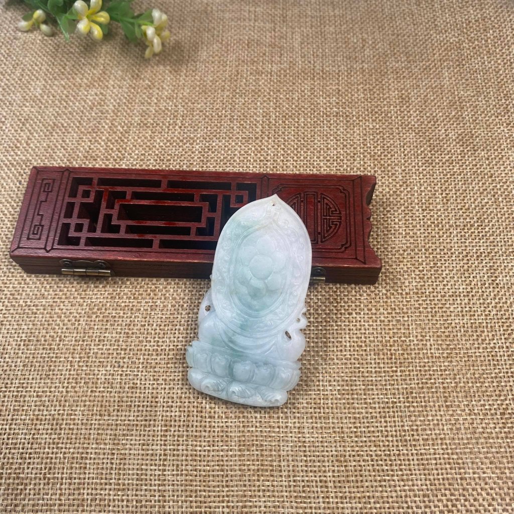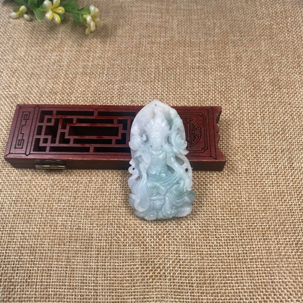 This beautiful Green Tara with blue blossoms is made of Burmese jadeite, look at how beautifully engraved and how serene the features are. It comes with a string chain and a certificate of authenticity. £208