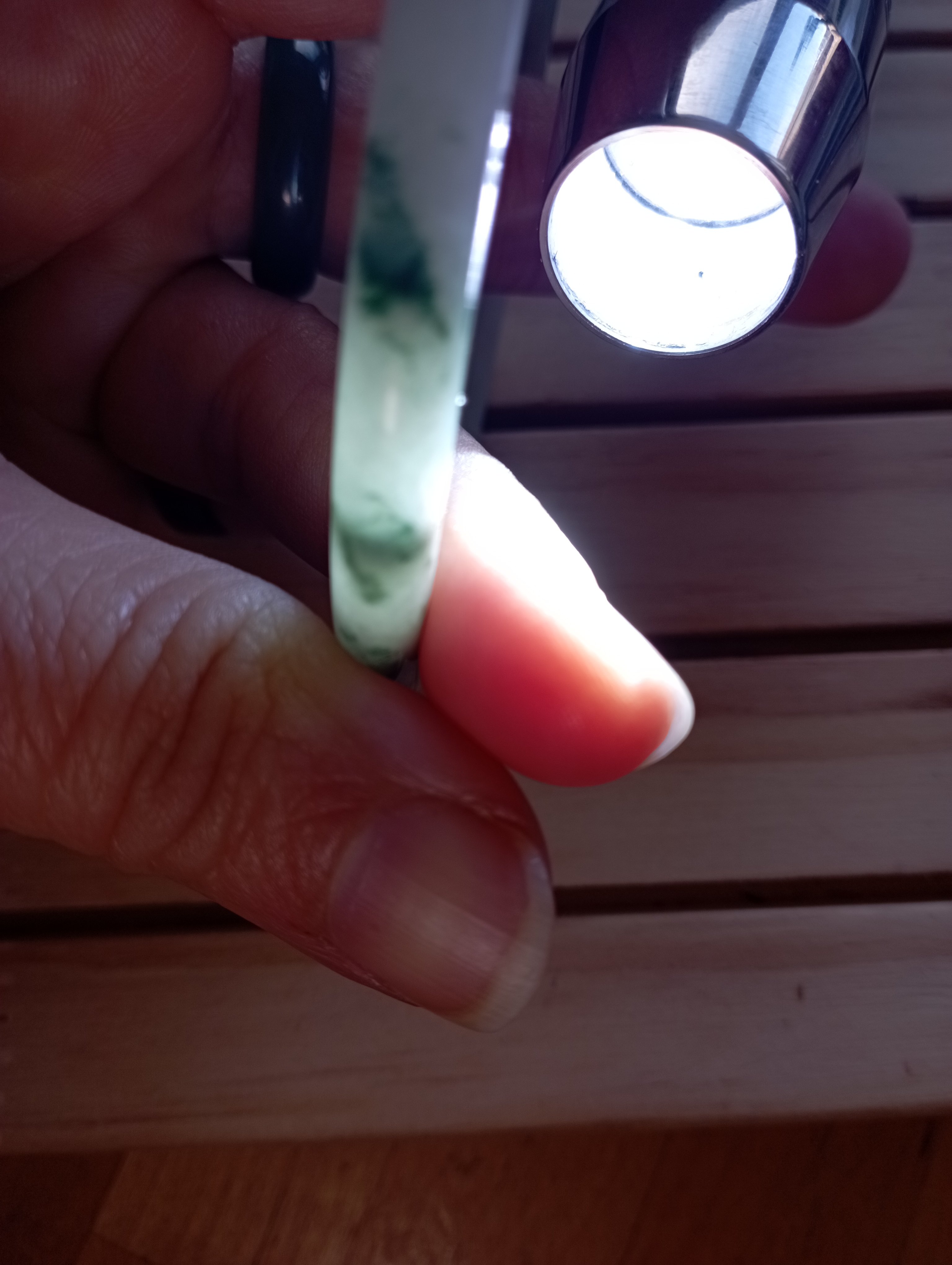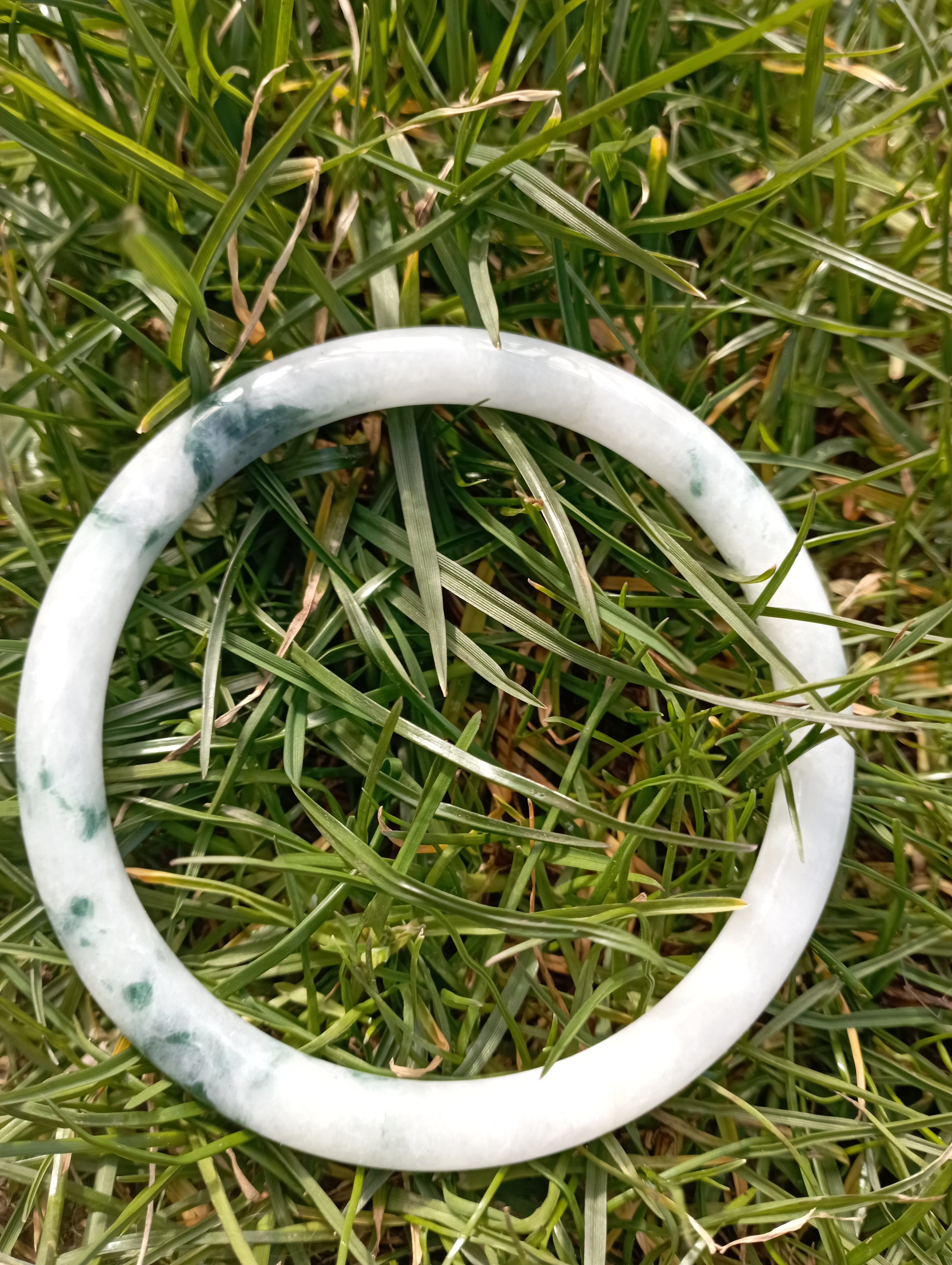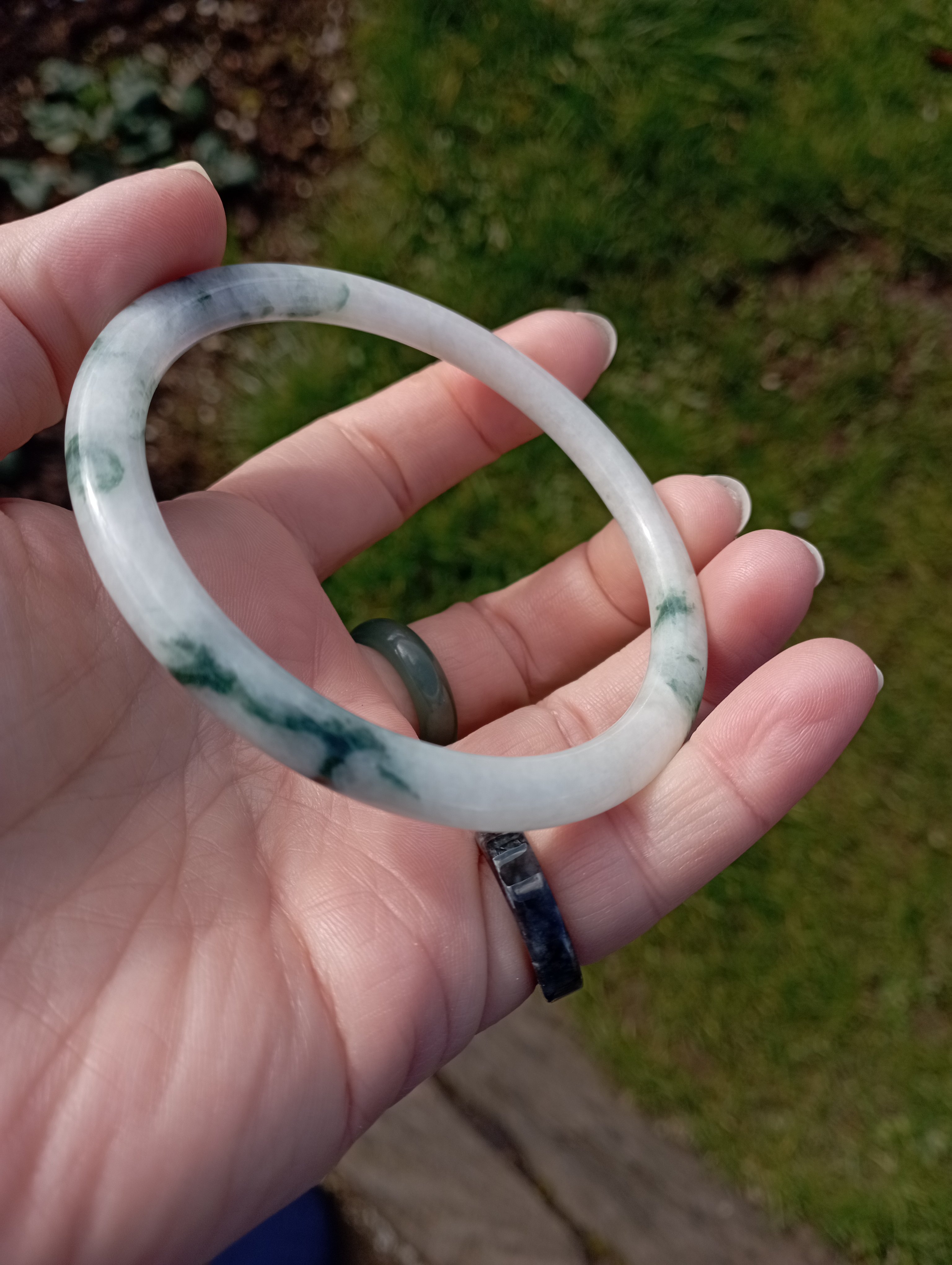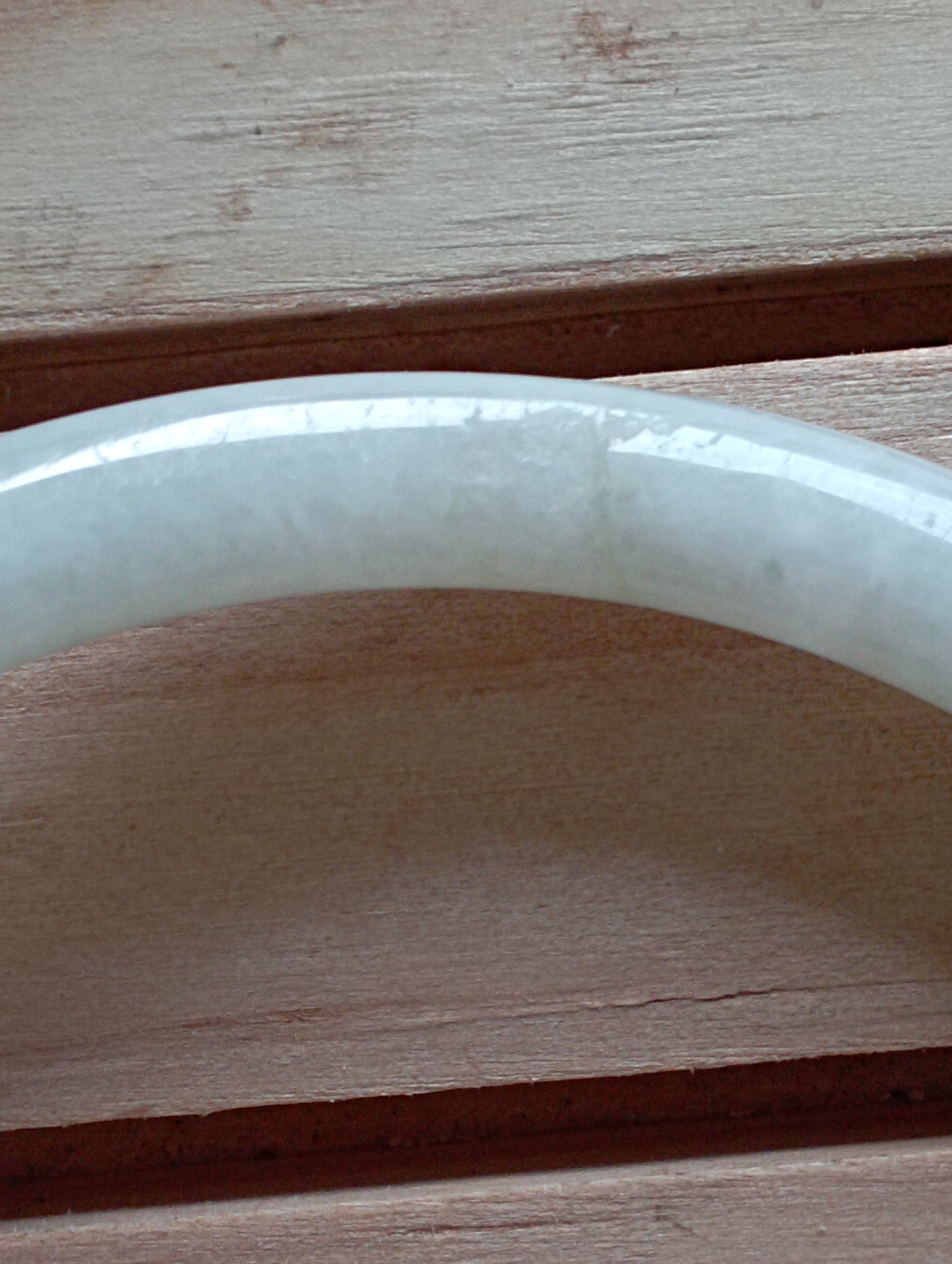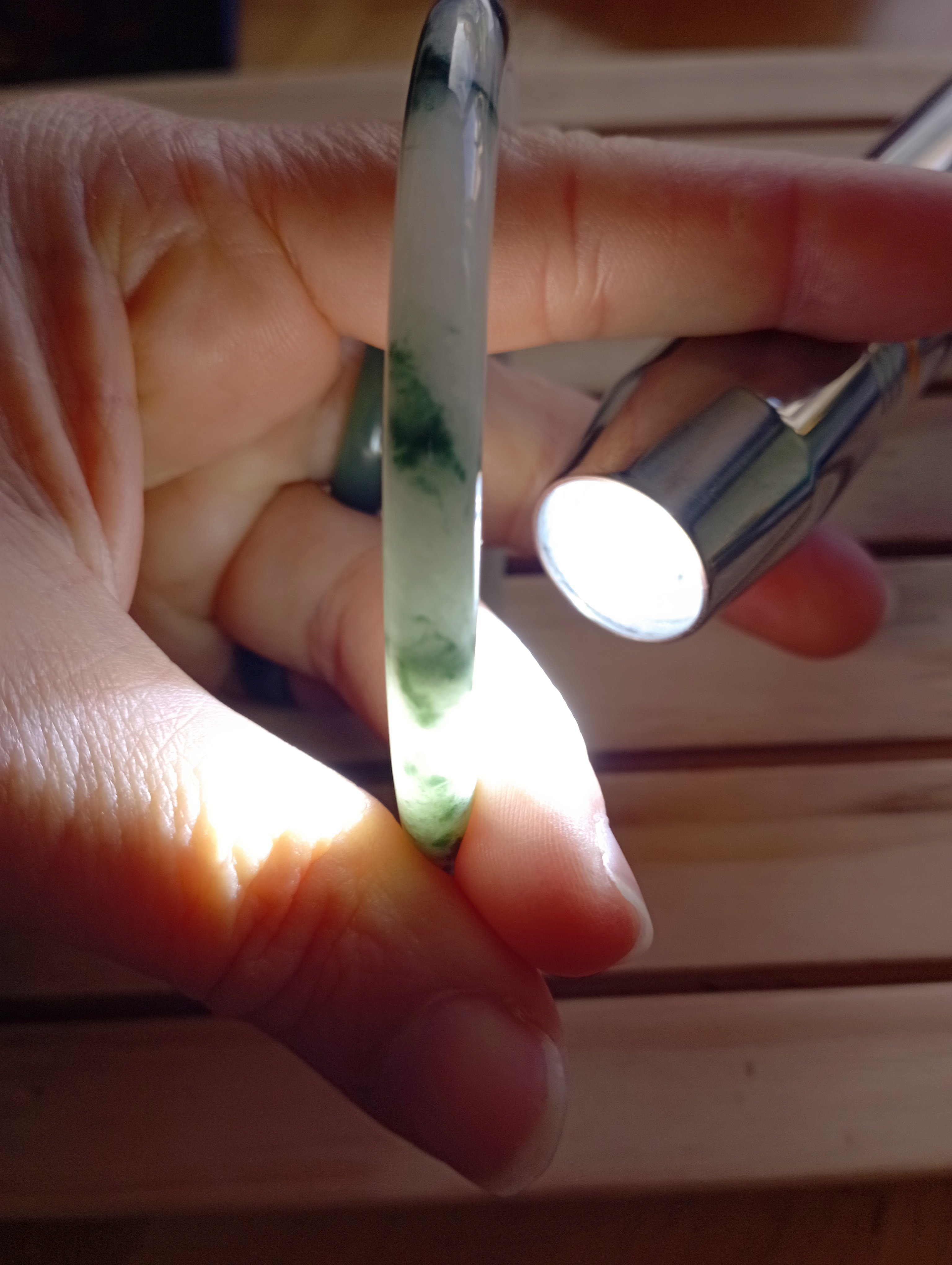 A jade bangle needs to be worn tight on the arm, to minimise wear and tear and to stimulate acupuncture points, as it rattles against your wrist bones day-to-day. The jade becomes energised by the daily contact with your body. It becomes a part of you.