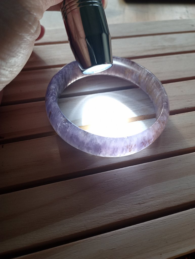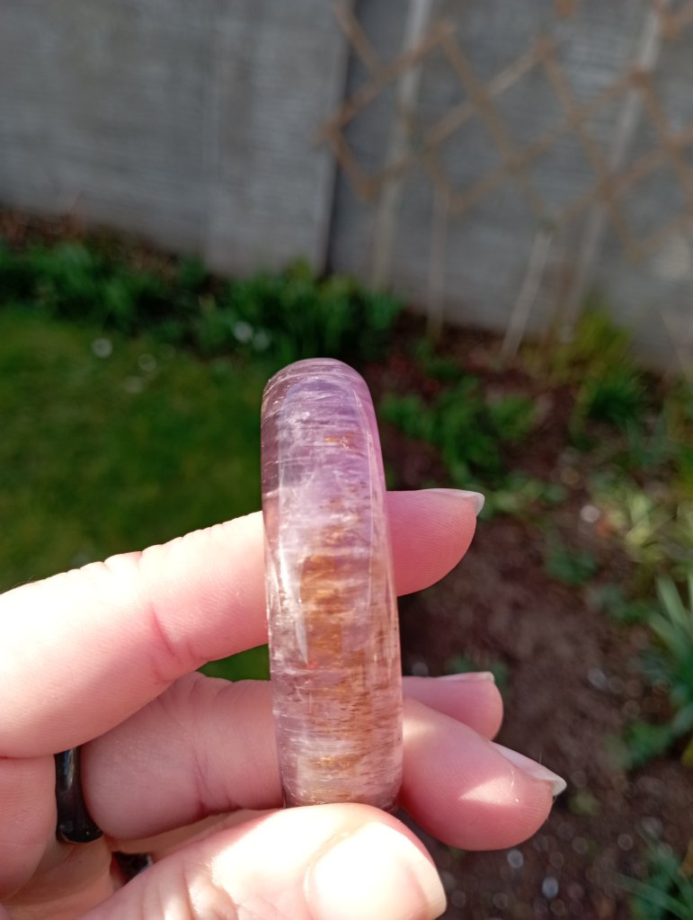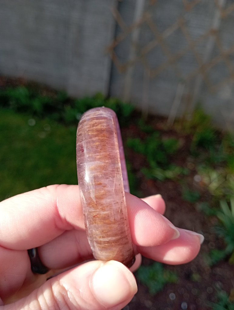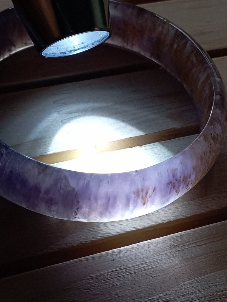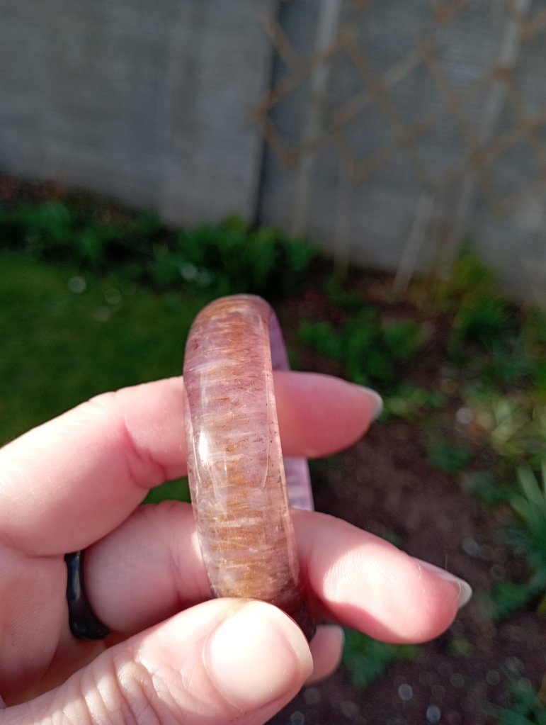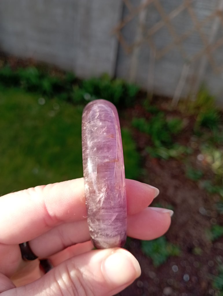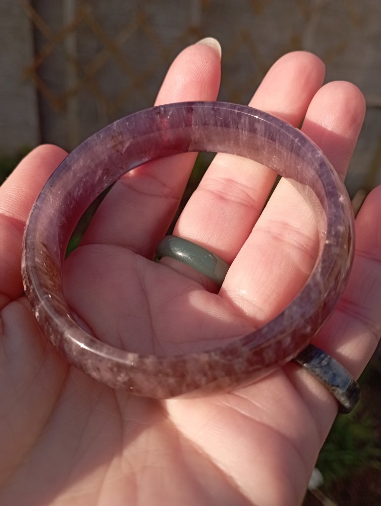 Amethyst and platinum rutilated quartz are easily available but having both grown together in natural surroundings is very rare. This beautiful amethyst and rutilated quartz bangle measures 55.6 x 15 x 7mm, comes with a certificate of authenticity.