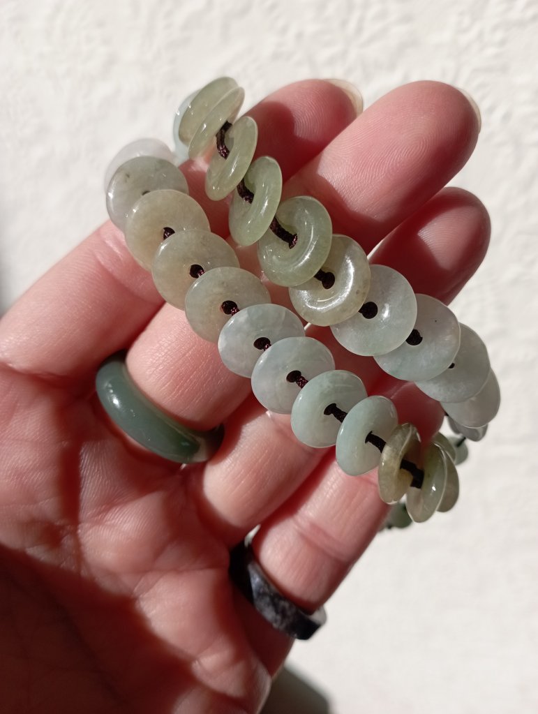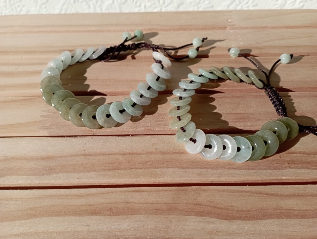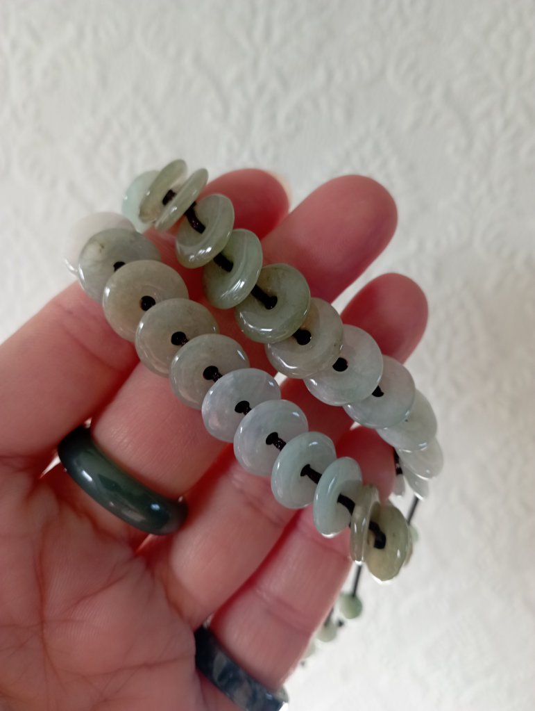 Lovely macabre bracelets that are adjustable. Each bracelet is made up of 20 mini Burmese jadeite donuts, each measures 11 x 2.2mm. big enough to fit a medium size man’s wrist. £28