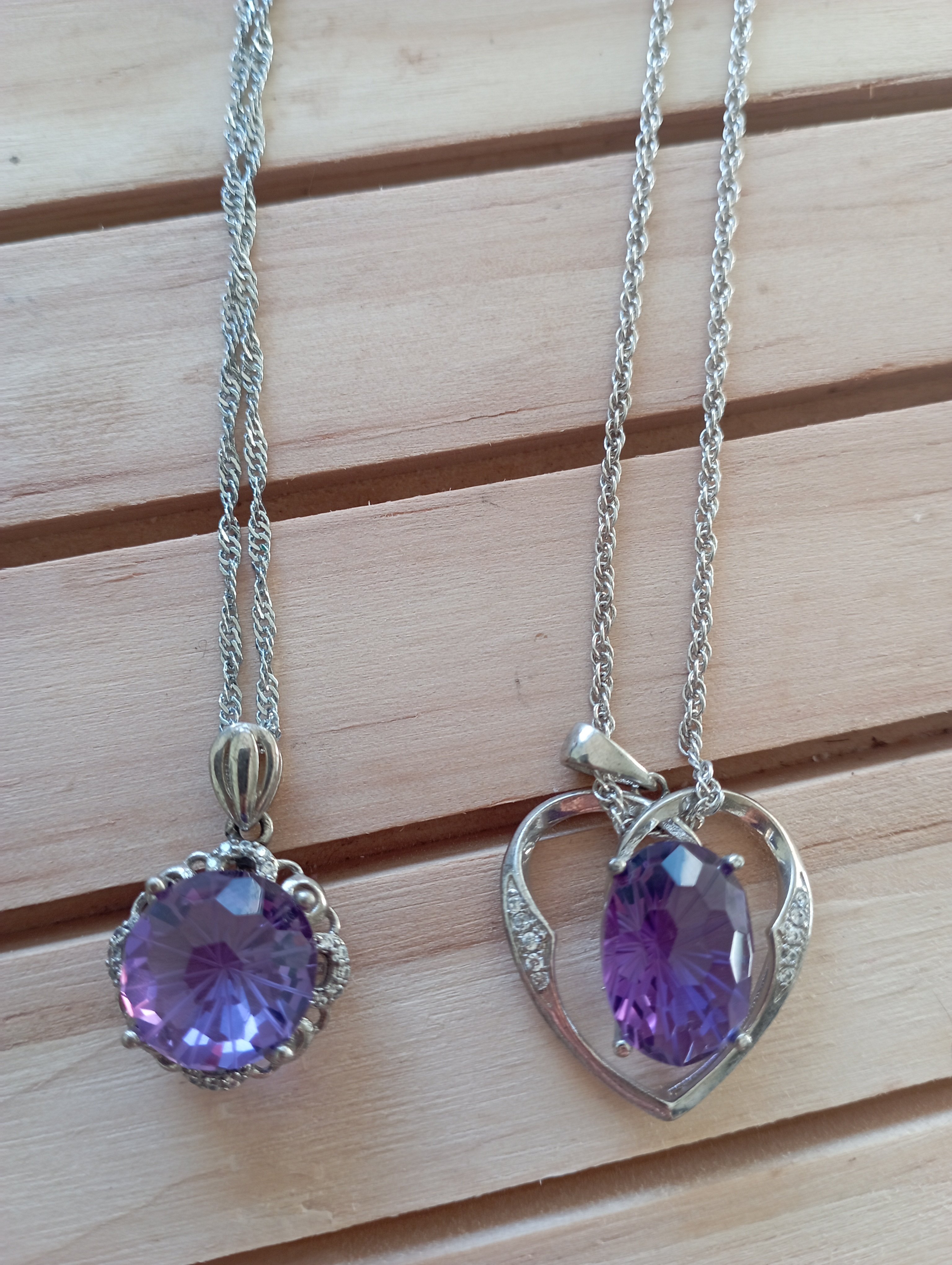 The one on the left is 11mm whereas the one on the right is 14 x 10mm, they are set in sterling silver and comes with a silver plated chain. £35( sold) for the round one and £40 for the heart one