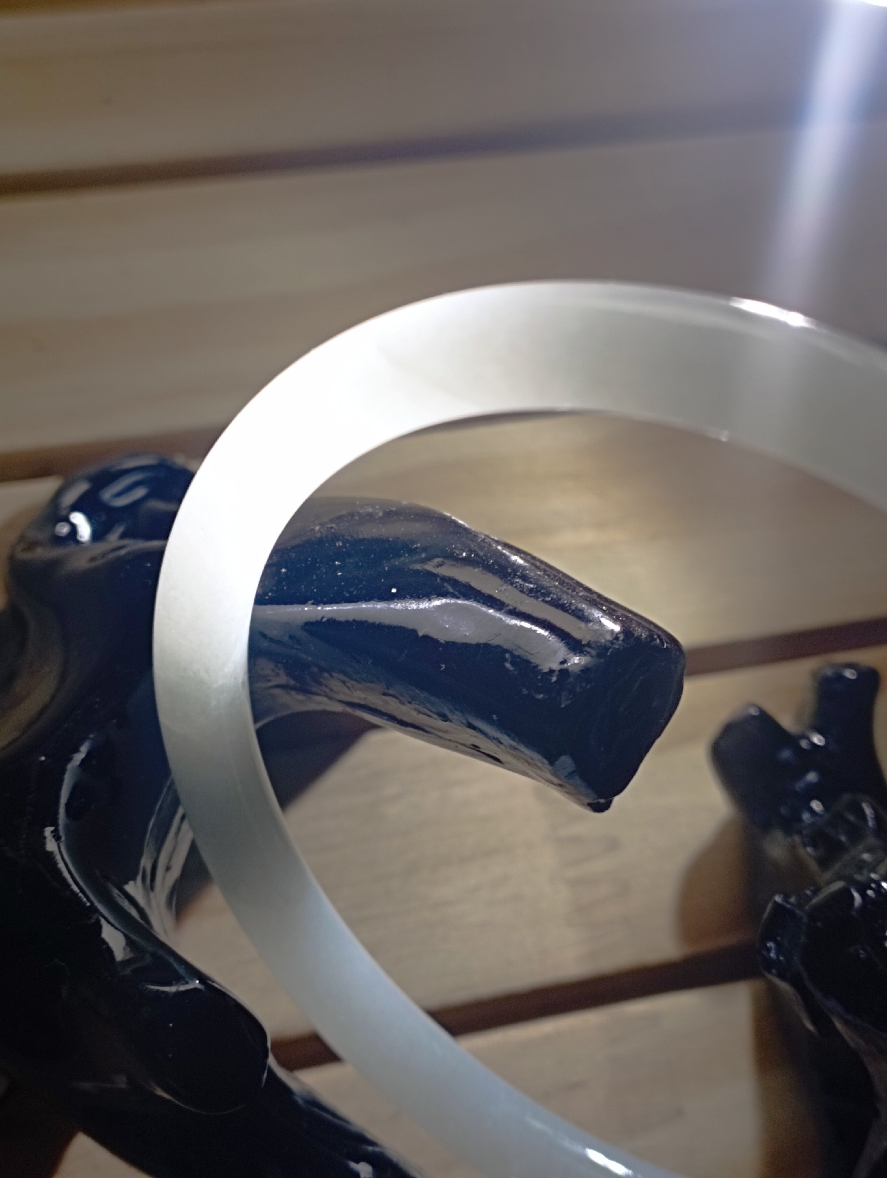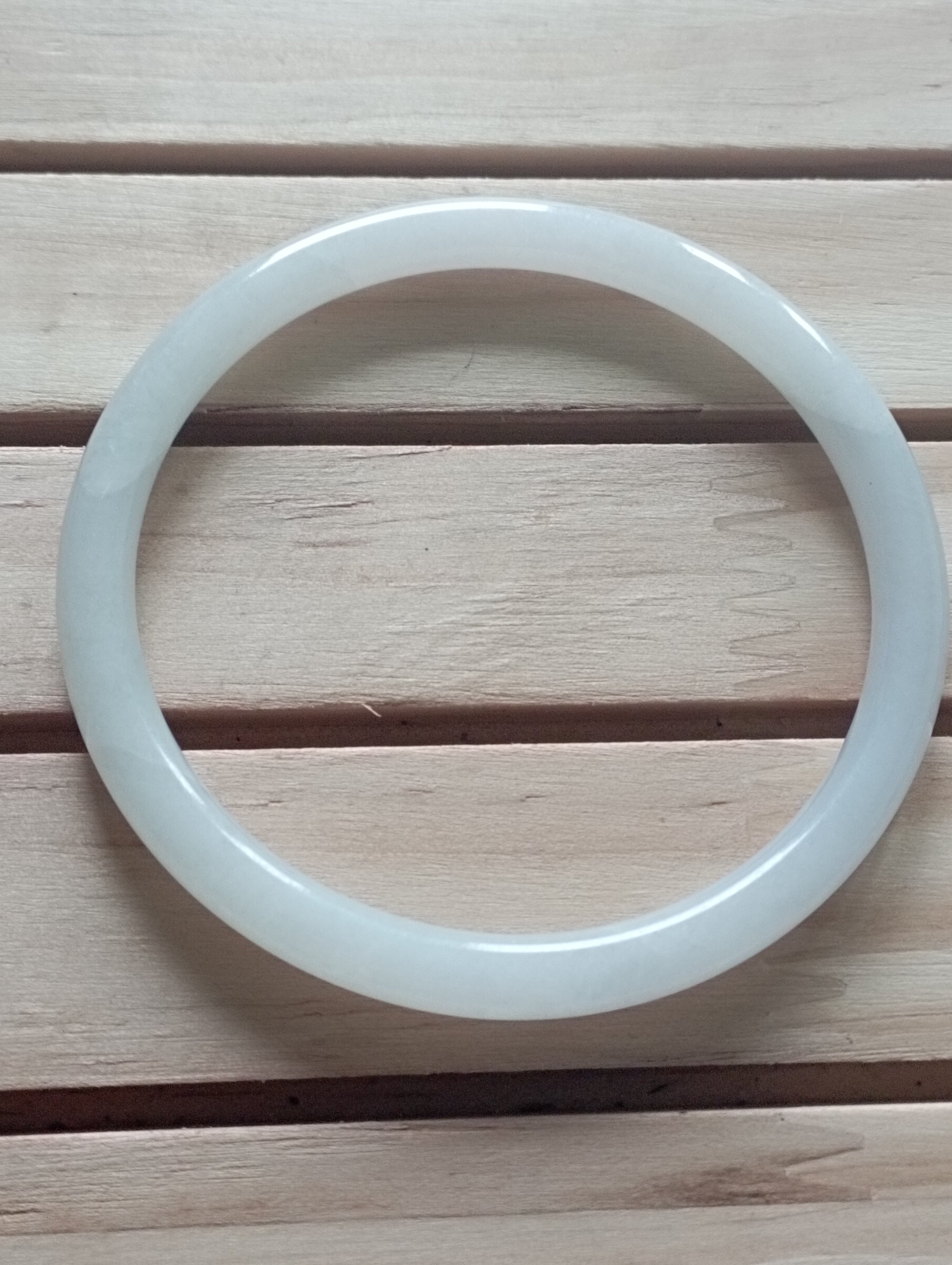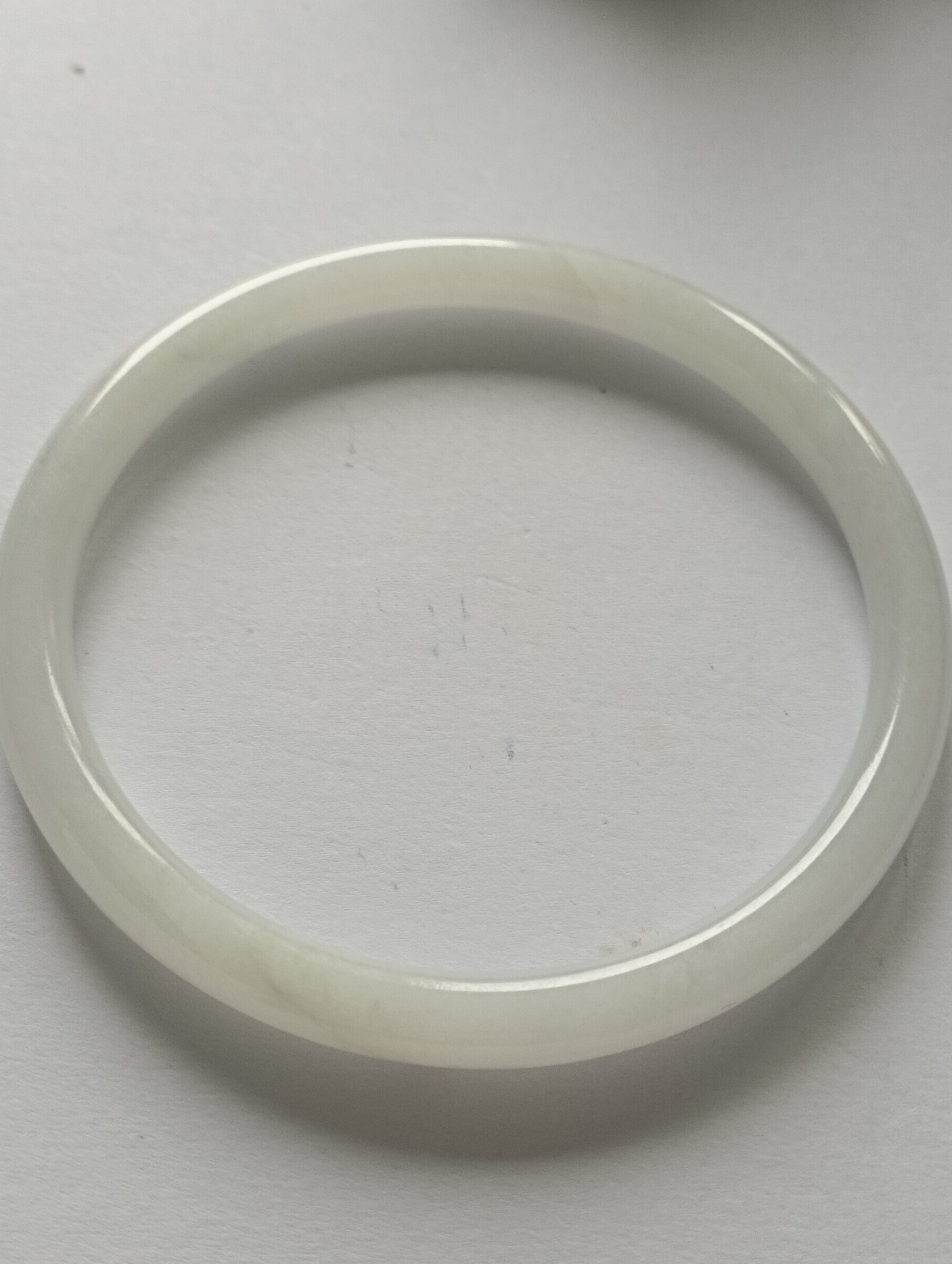 A beautiful round bangle that fits up to 57mm, it is a moonstone colour with 2 formations as per pictures. Measures 55.6 X 5.8 X 6mm, will make a pair of ding dang( referring to the sound they makes , the tinkle when two bangles bang together)