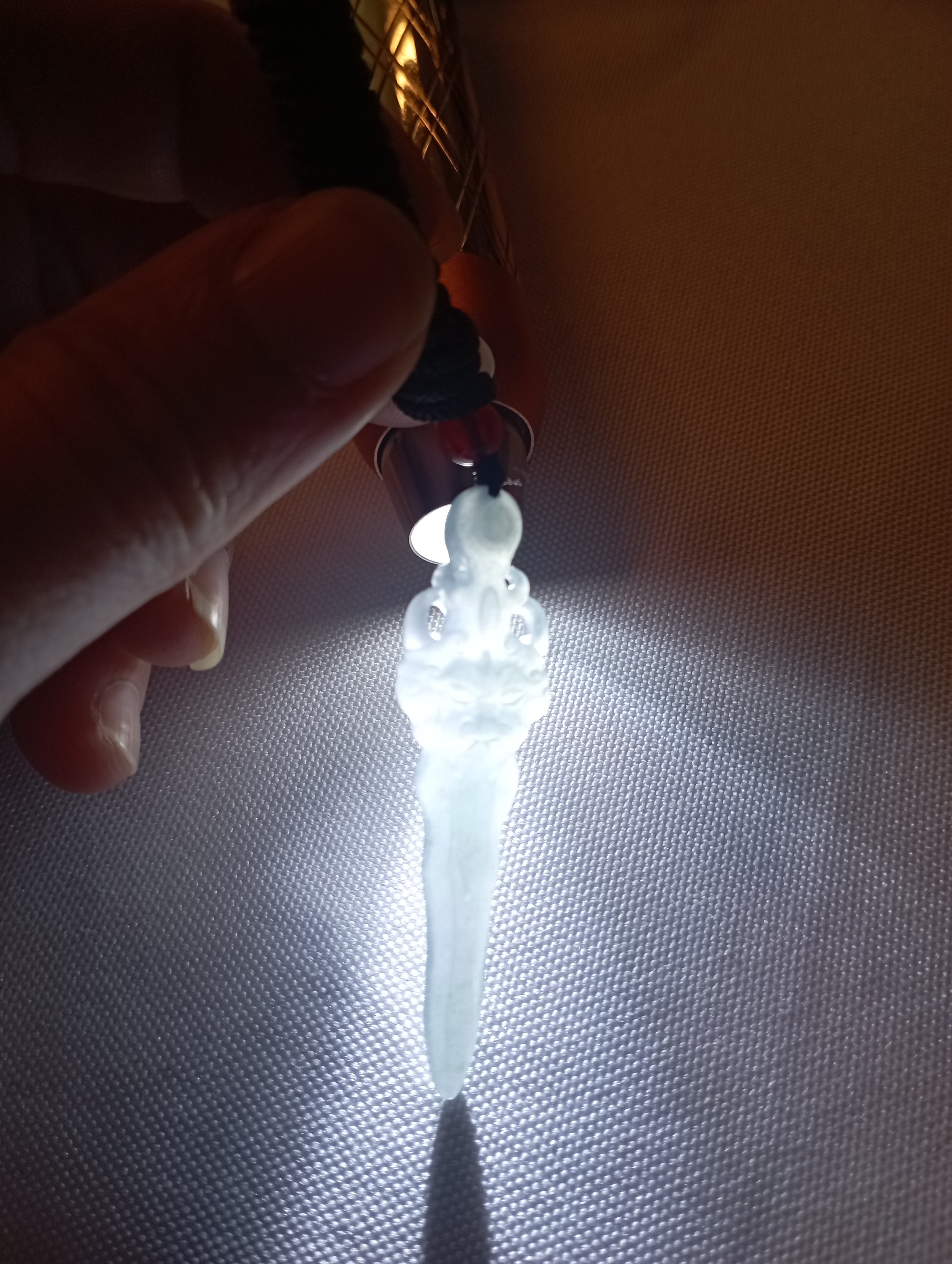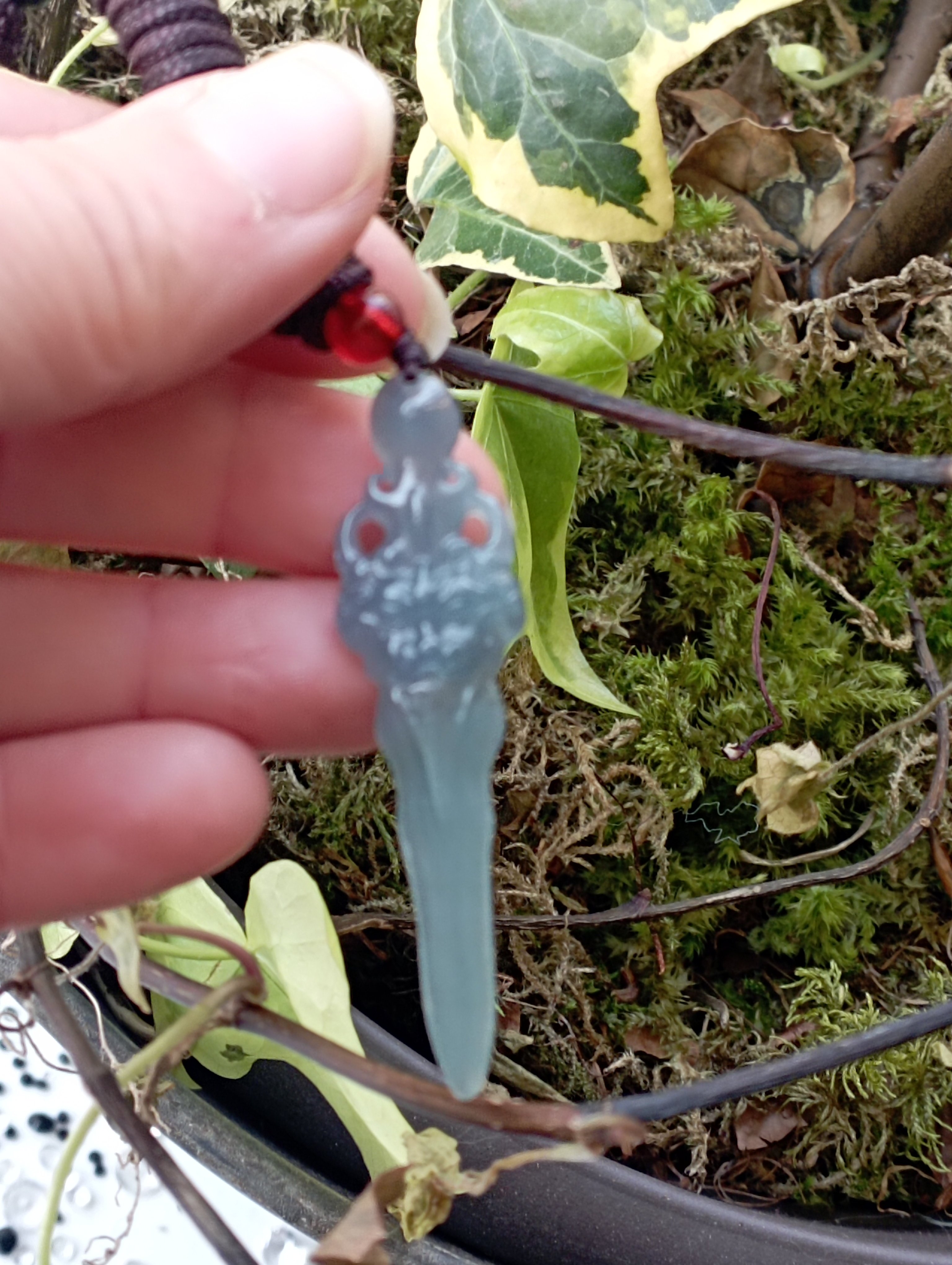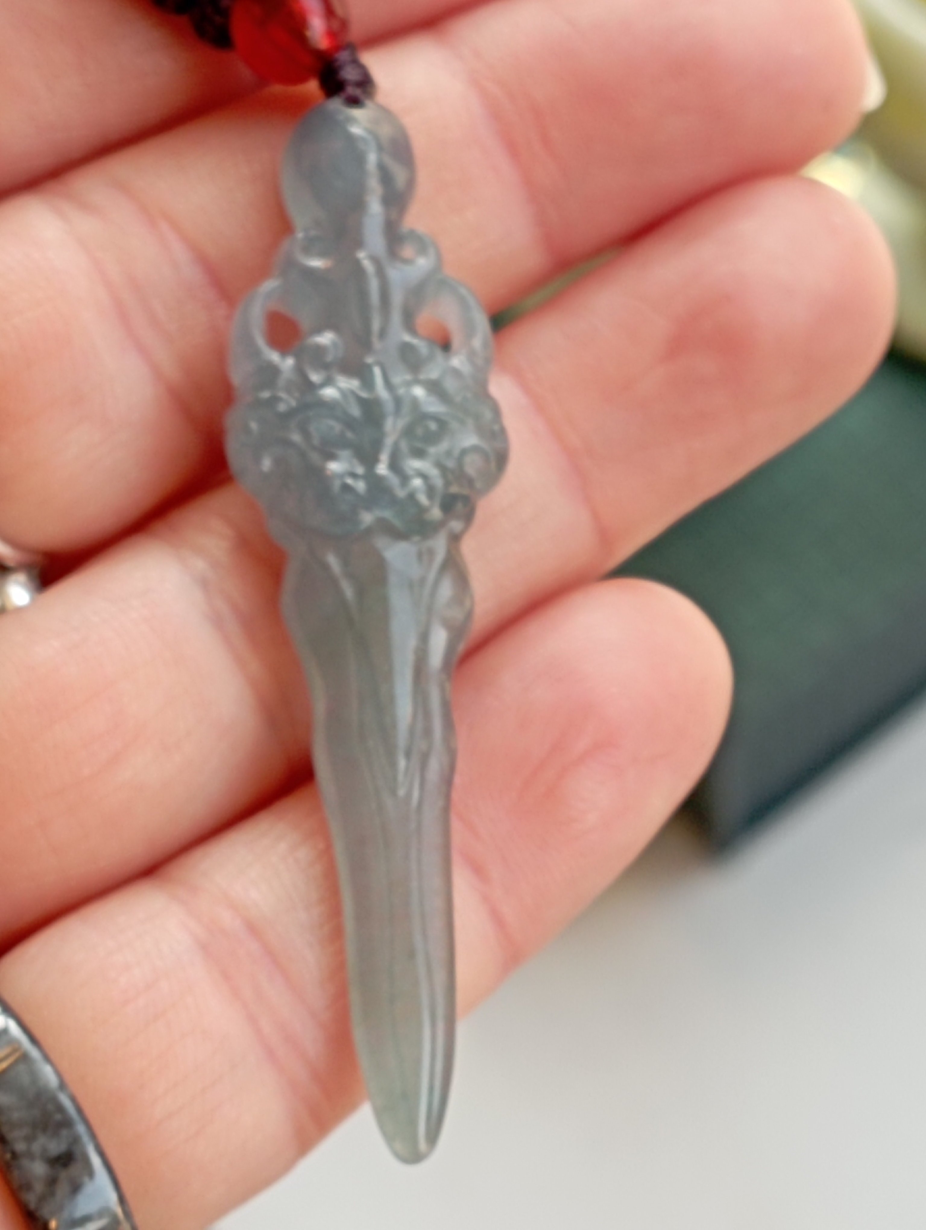 Measures approx 55 X 9 x 5mm, it is a lovely bluish colour, adjustable on a brown string necklace. £42