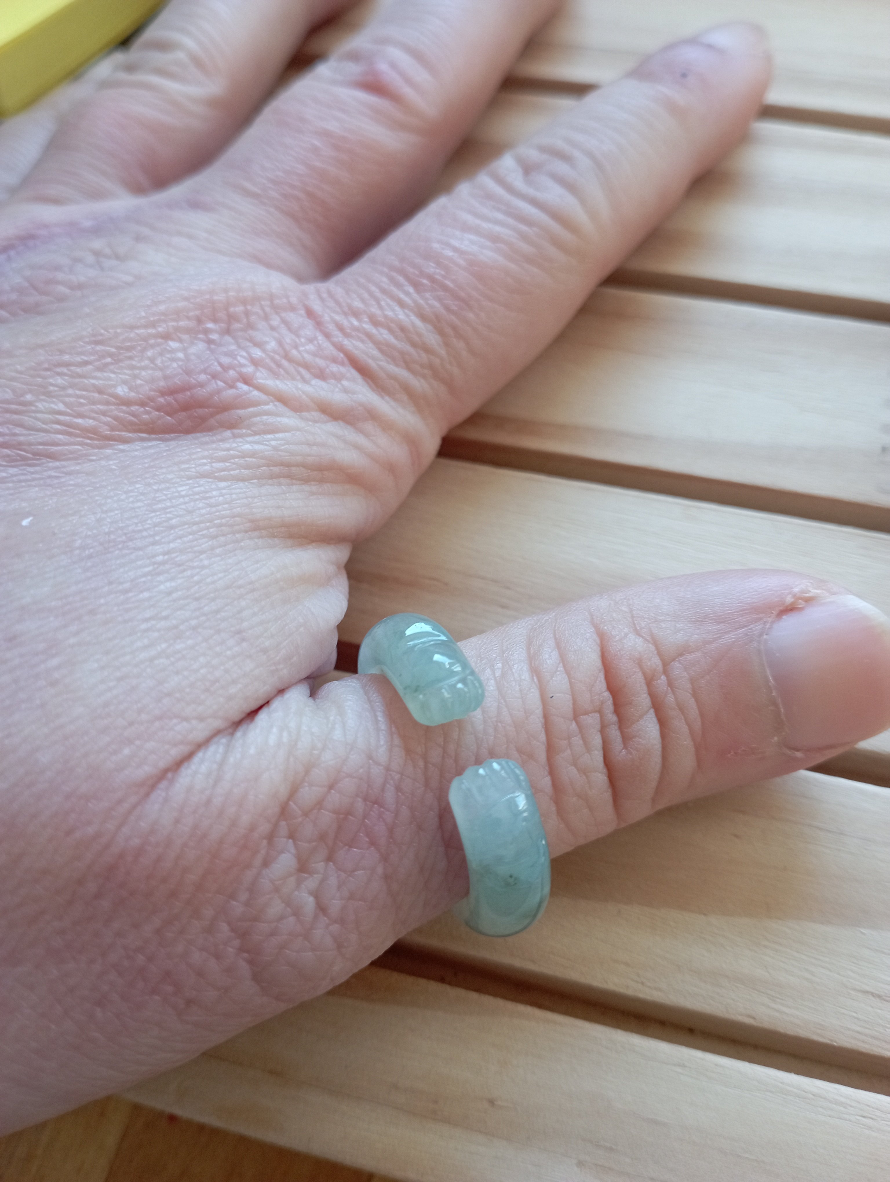 Jadeite ring with an opening in the shape of two cat paws that look as though it is hugging your finger.