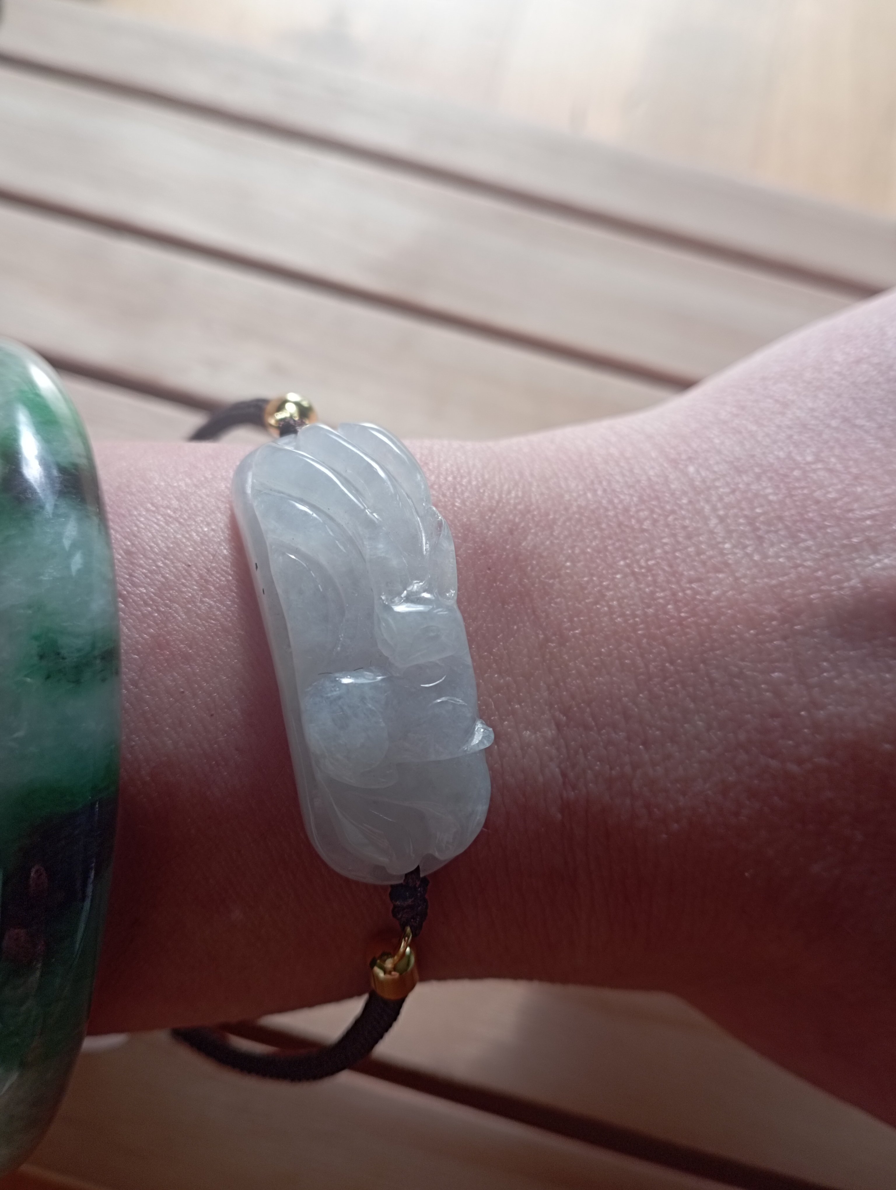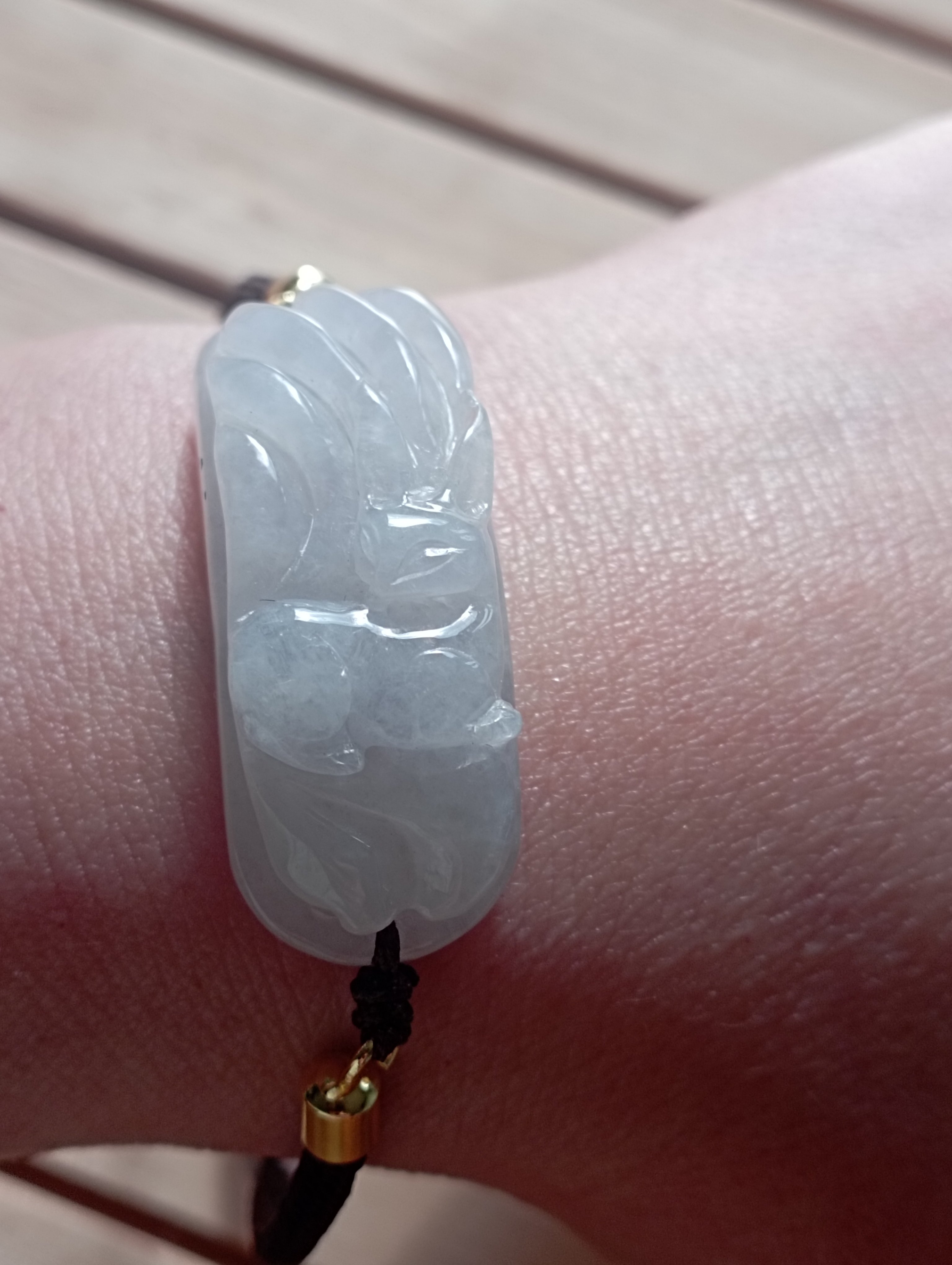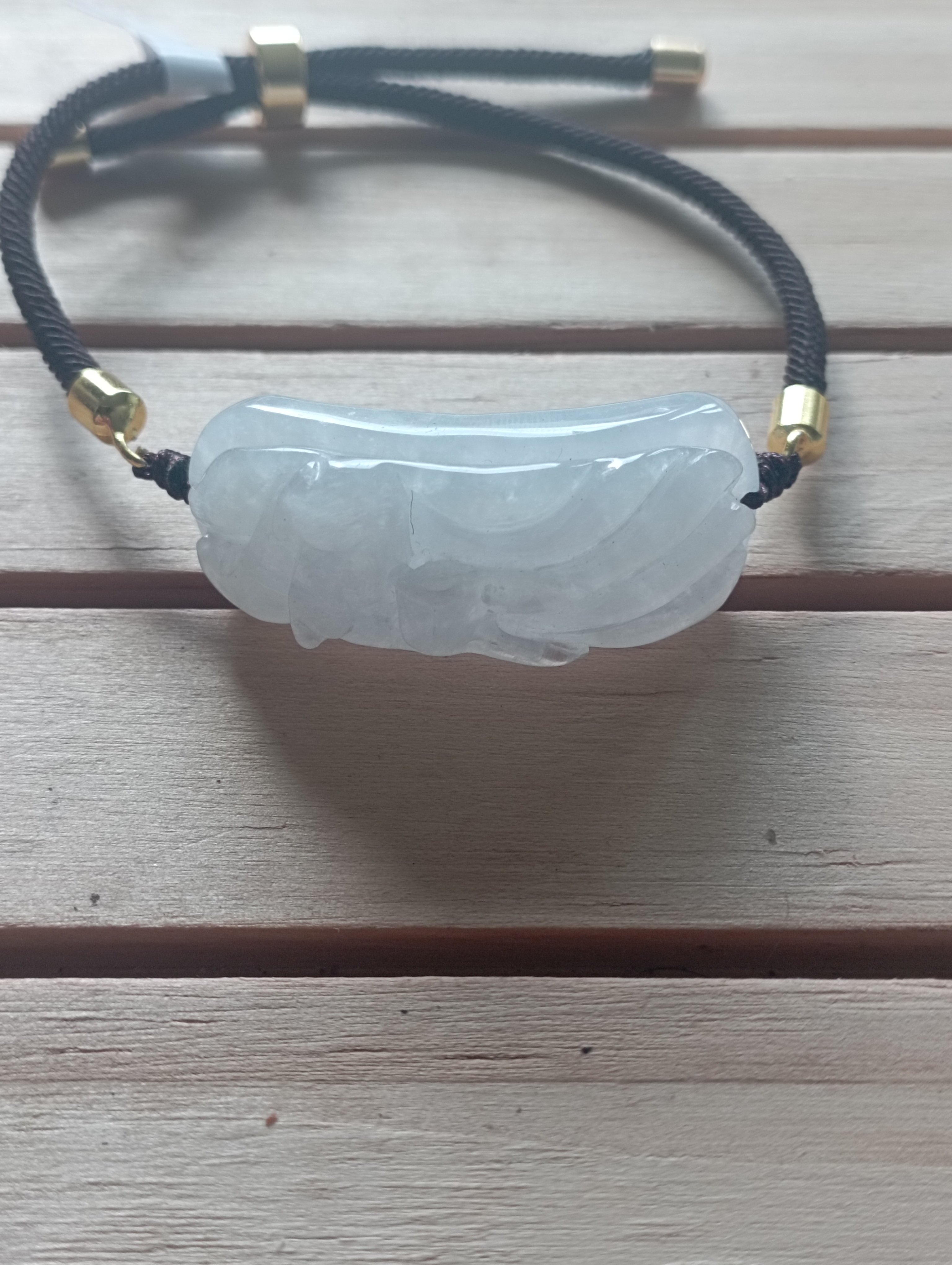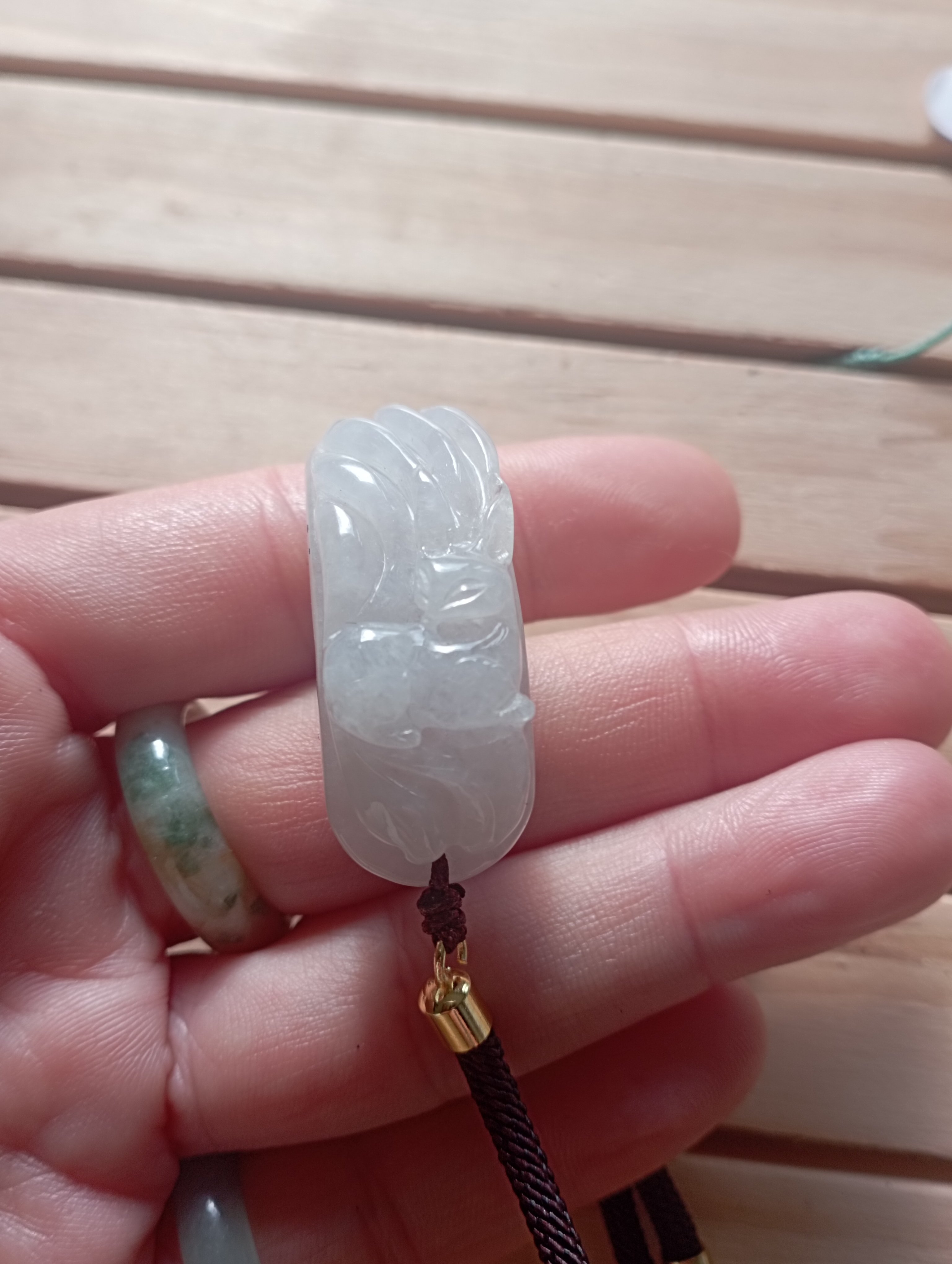 This lovely Burmese opaque jadeite is engraved with a fox seated in a relaxing manner, that signifies tranquility. Measures 36.1 X 14.6 X 9.7mm, £68