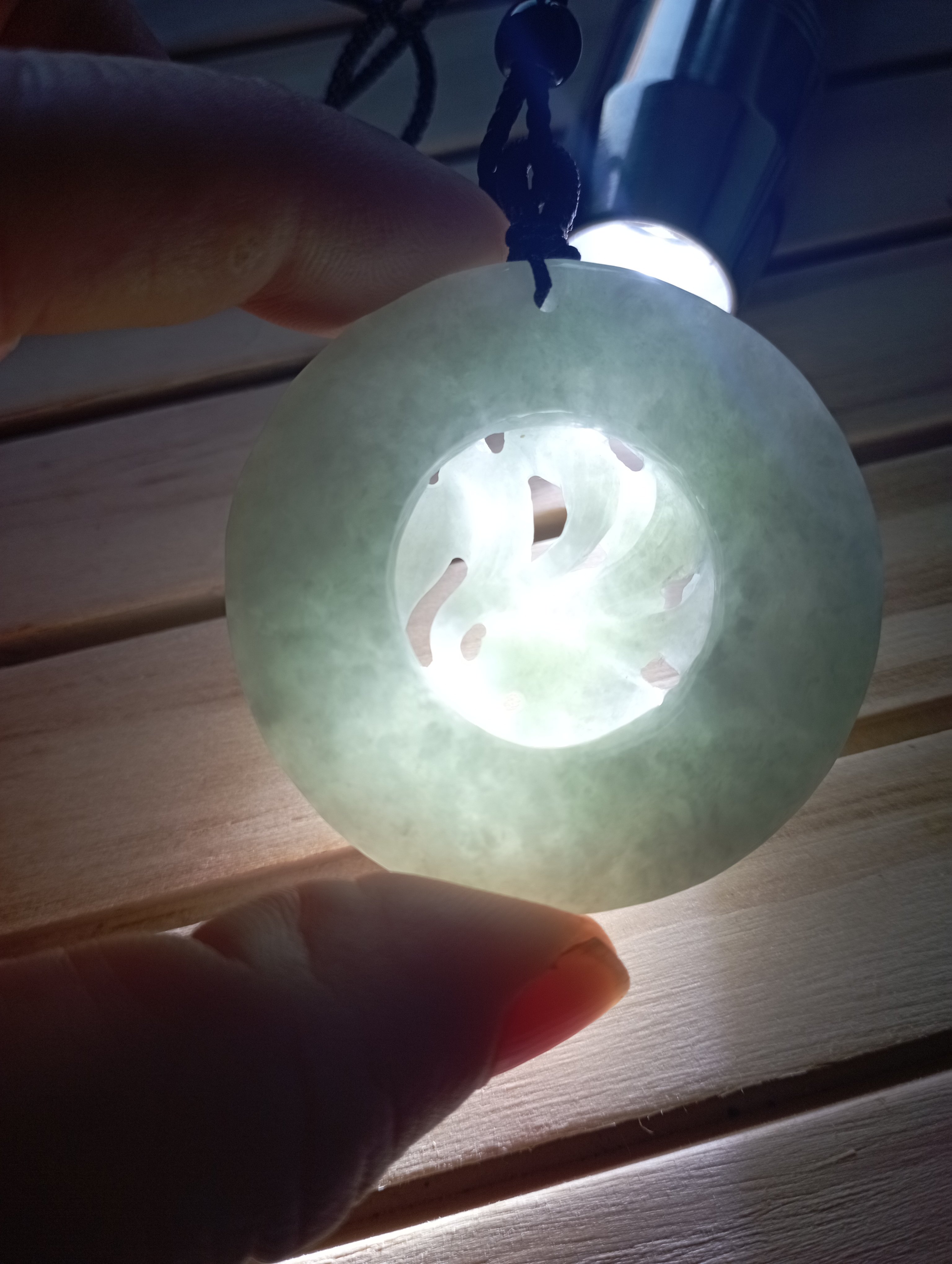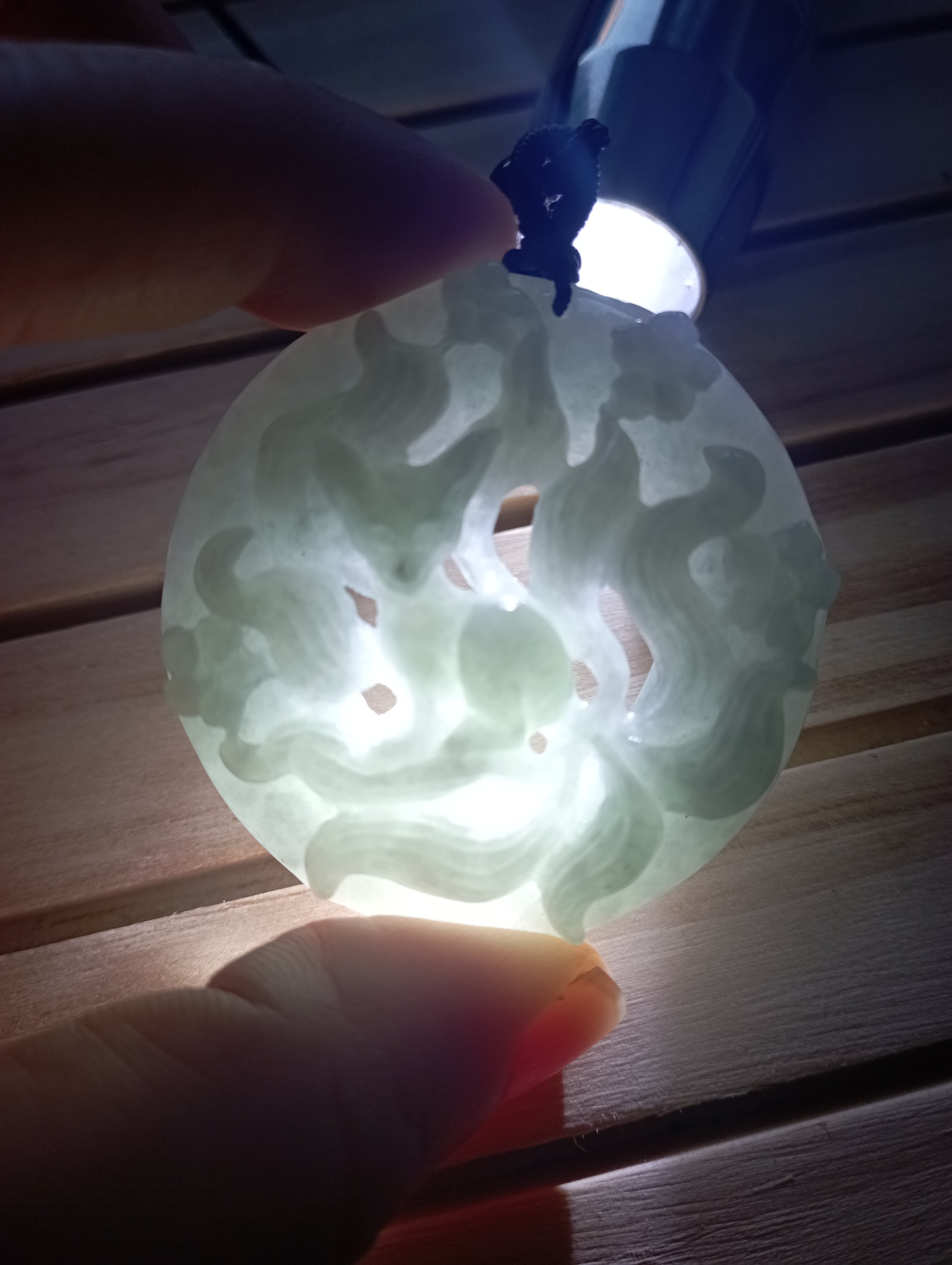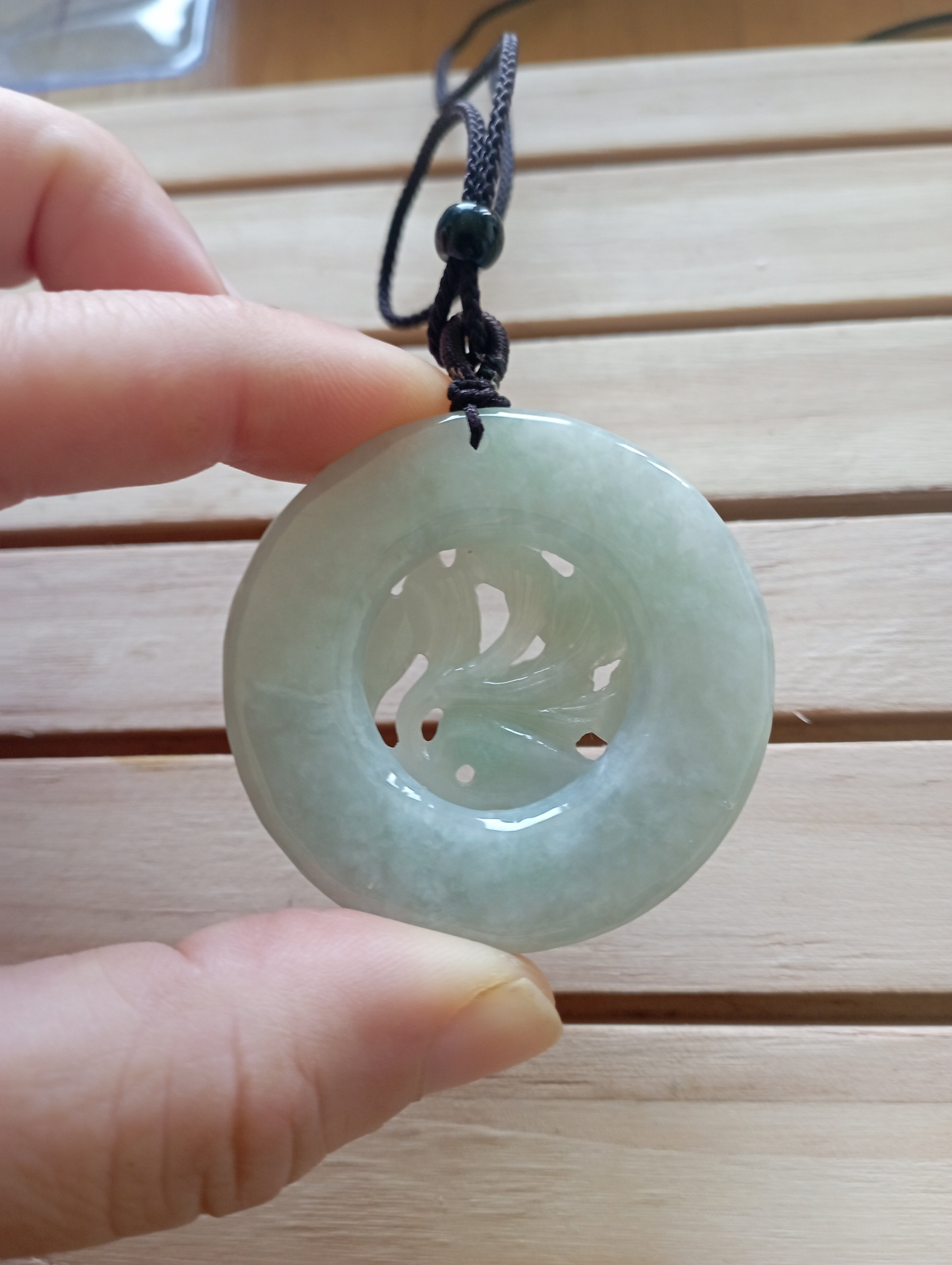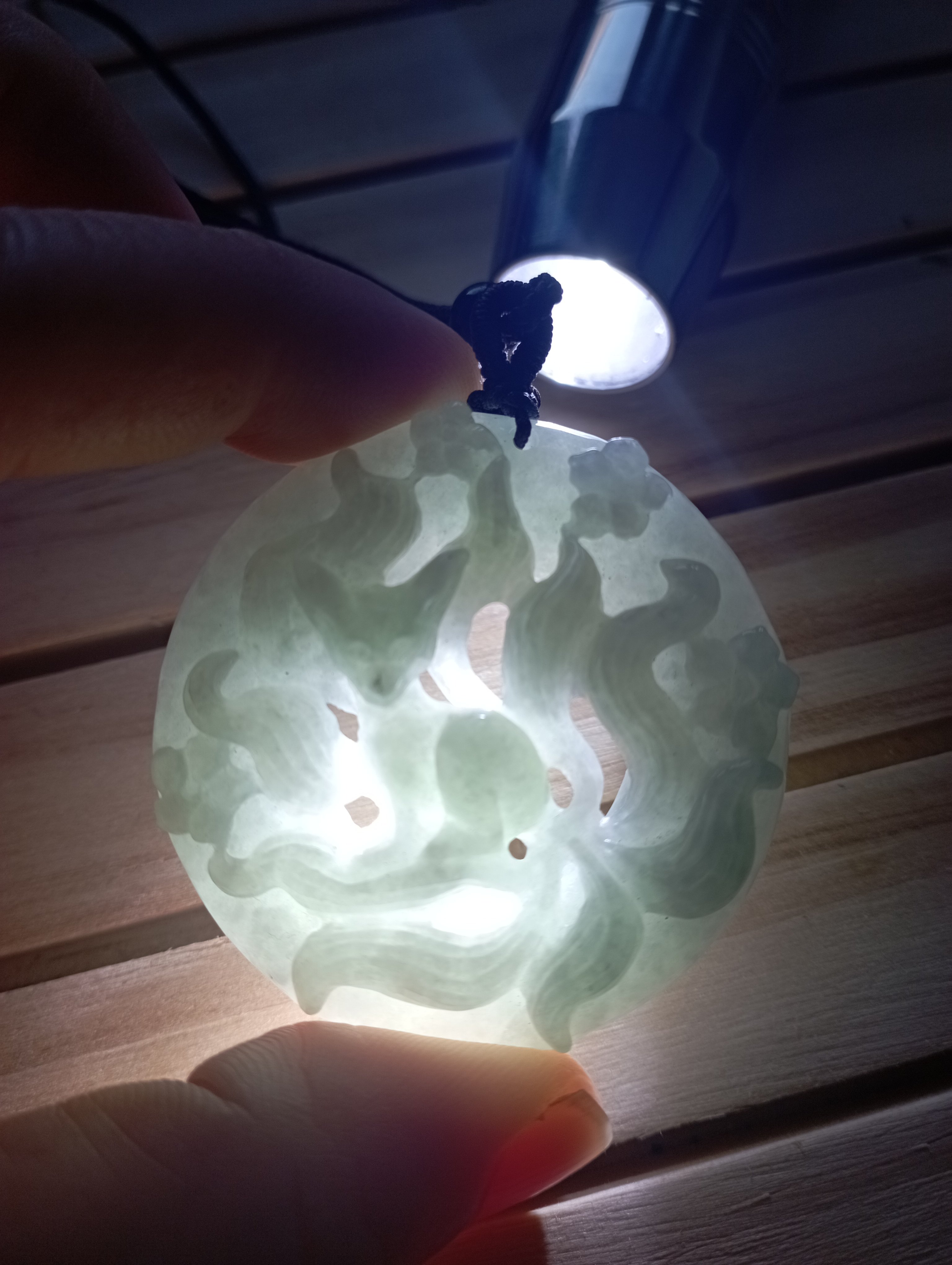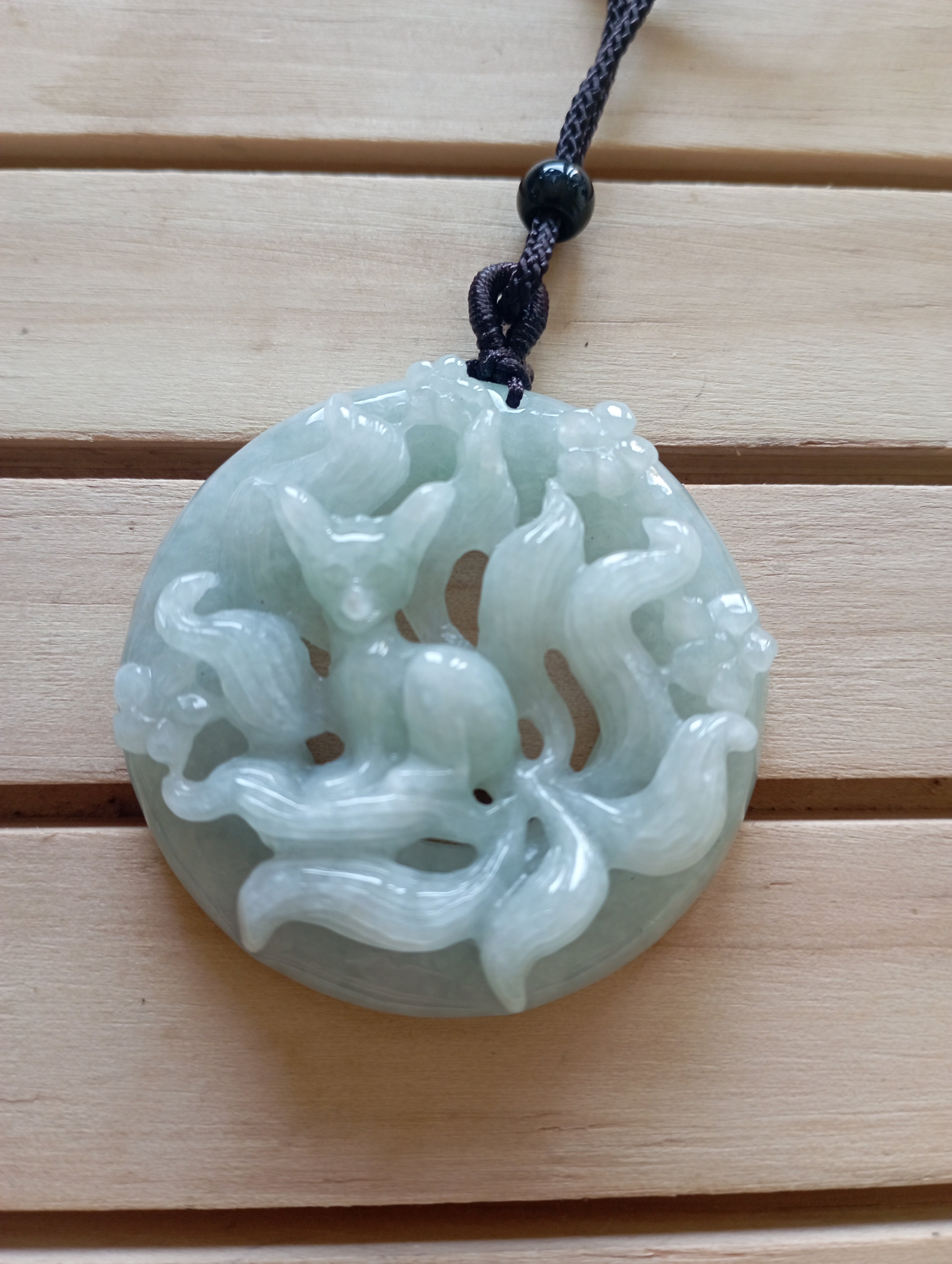 Lovely round pendant with a carving of 9-tailed fox. The quality and carving is lovely, very icy and clear. Measures 44.6 X 11.5mm, comes with a certificate of authenticity. £120