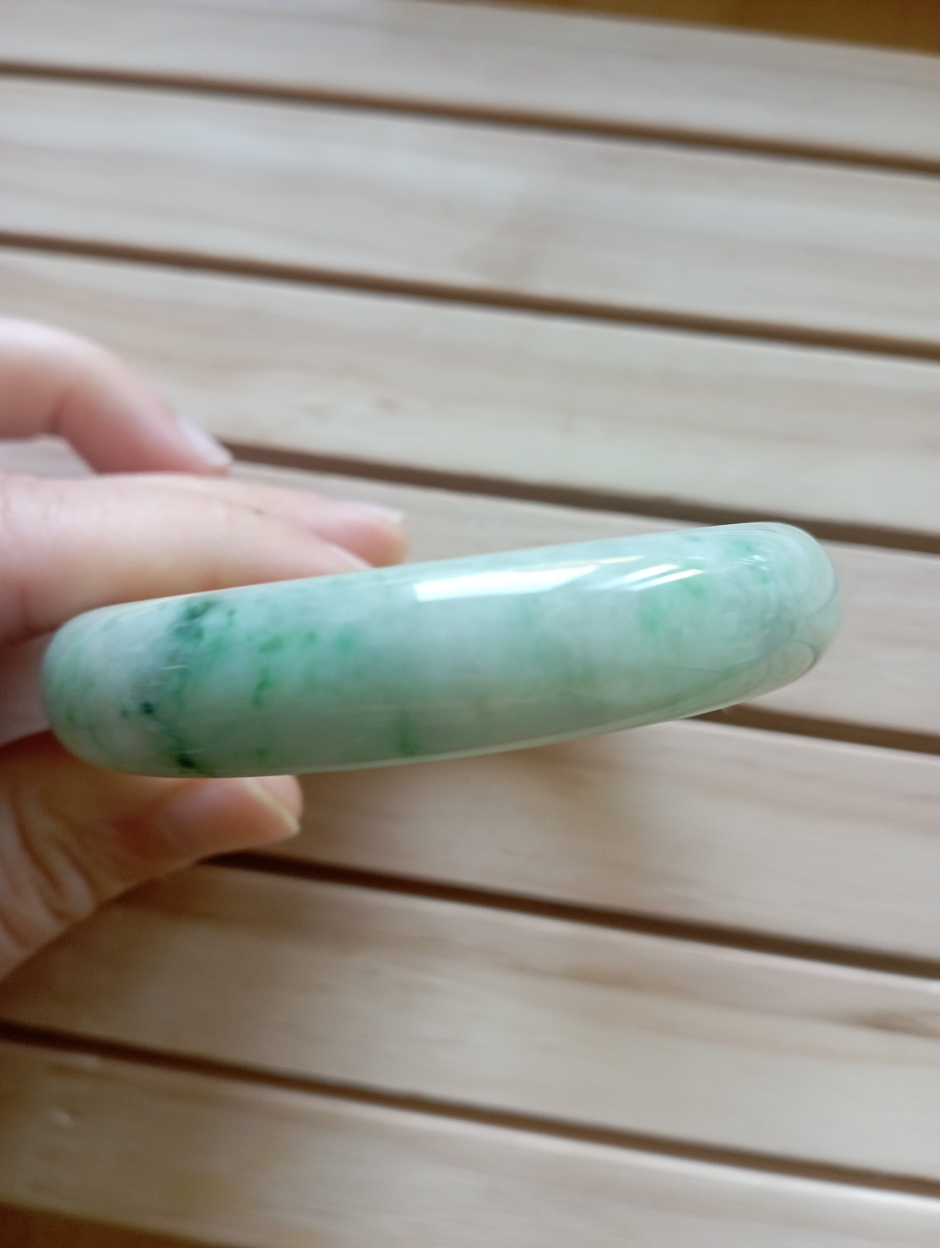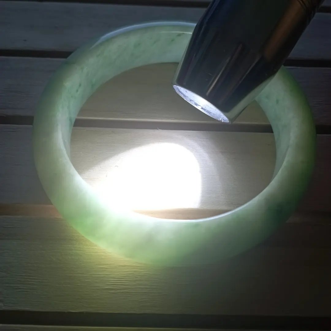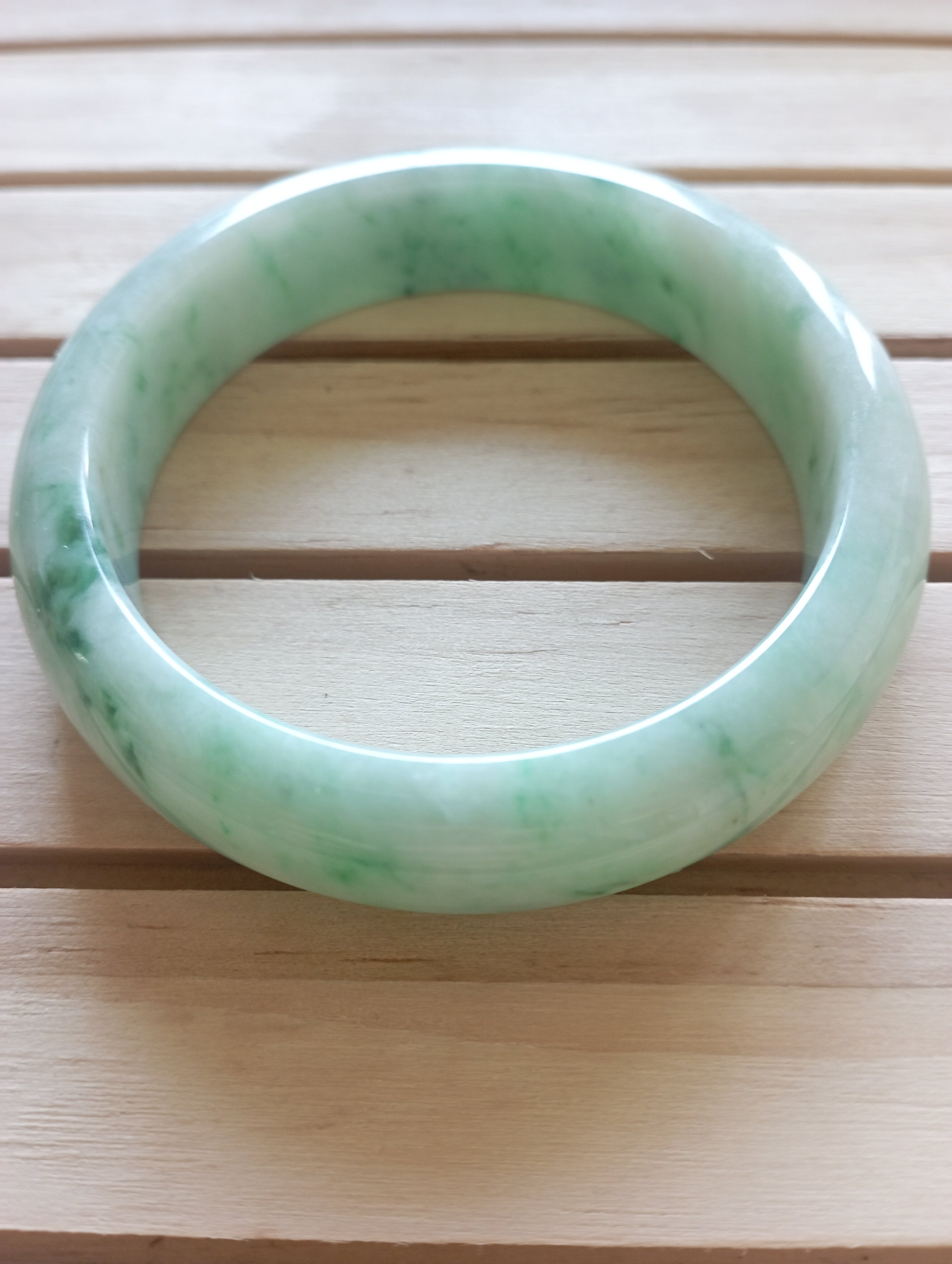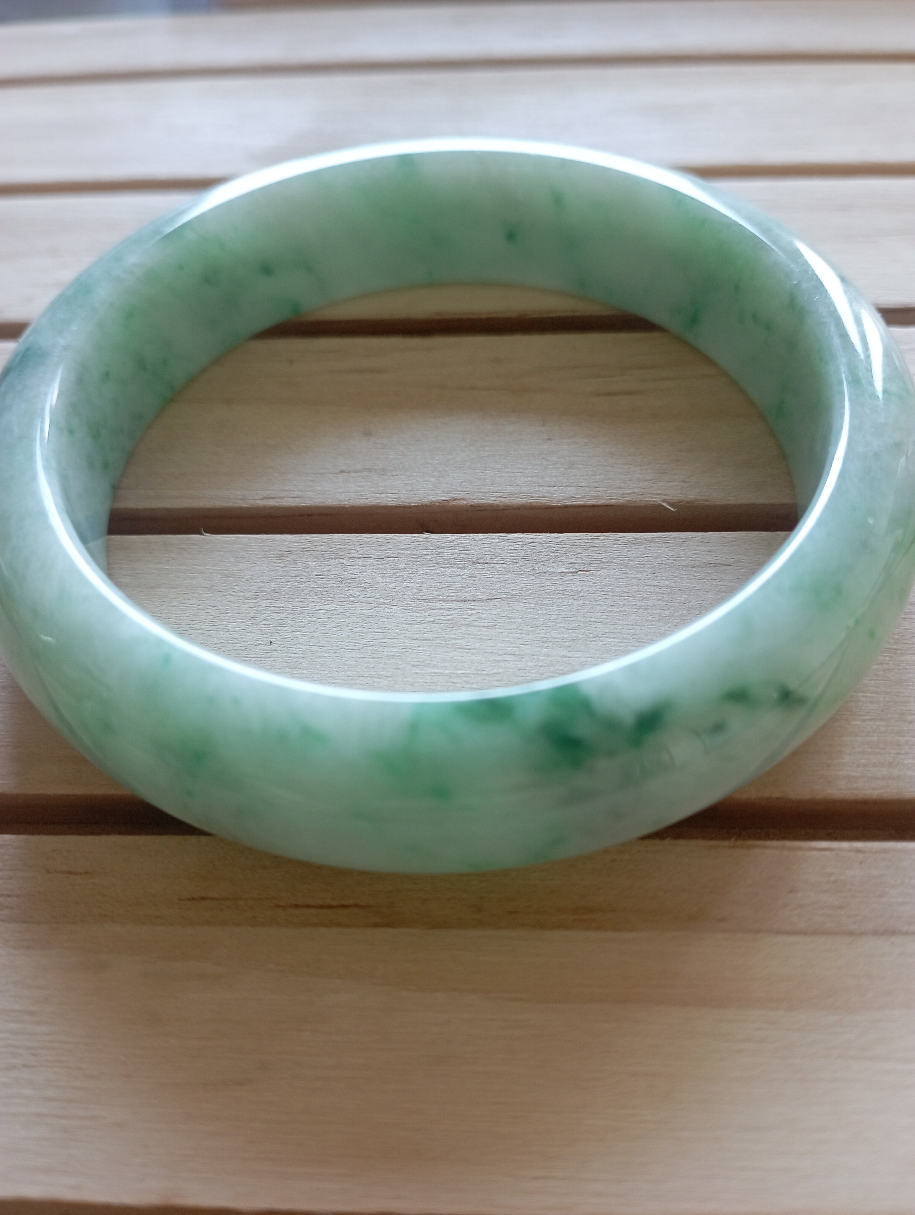 Beautiful apple green jadeite bangle measures 56.3 X 13.5 X 8.3mm, it has lovely darker green blooms scattered all over, the colour is gorgeous when the light shines through, it comes with a certificate of authenticity. £428