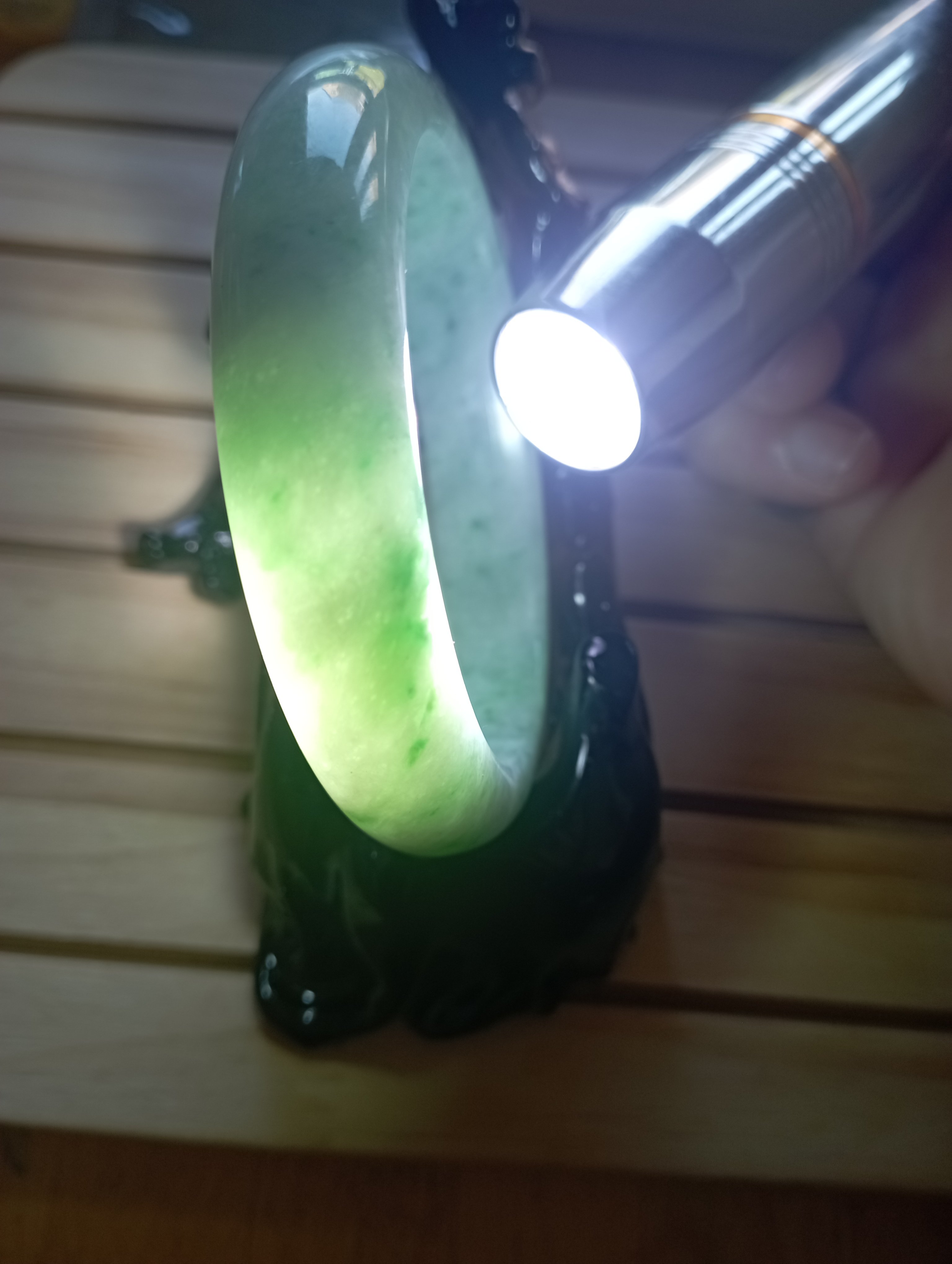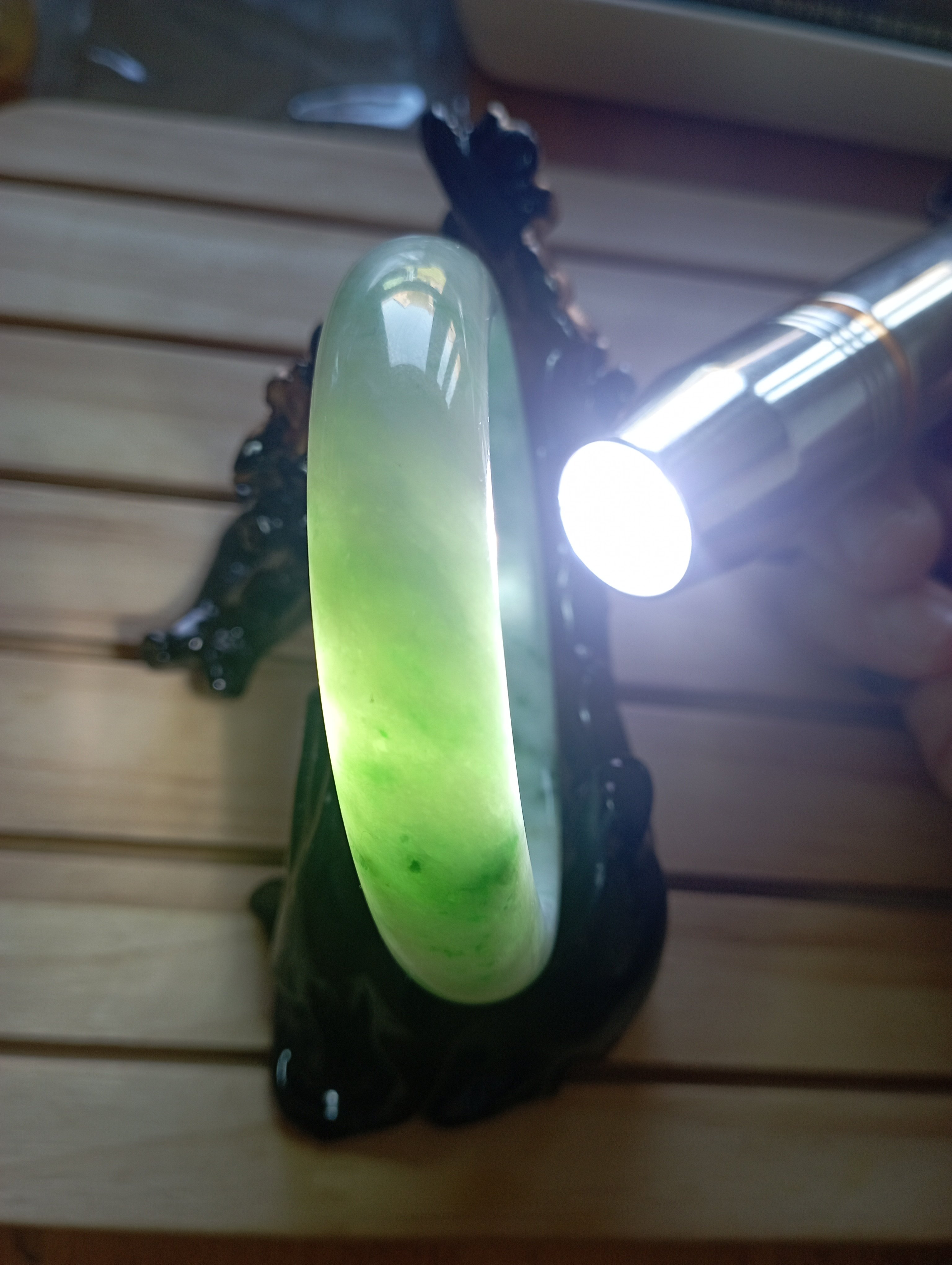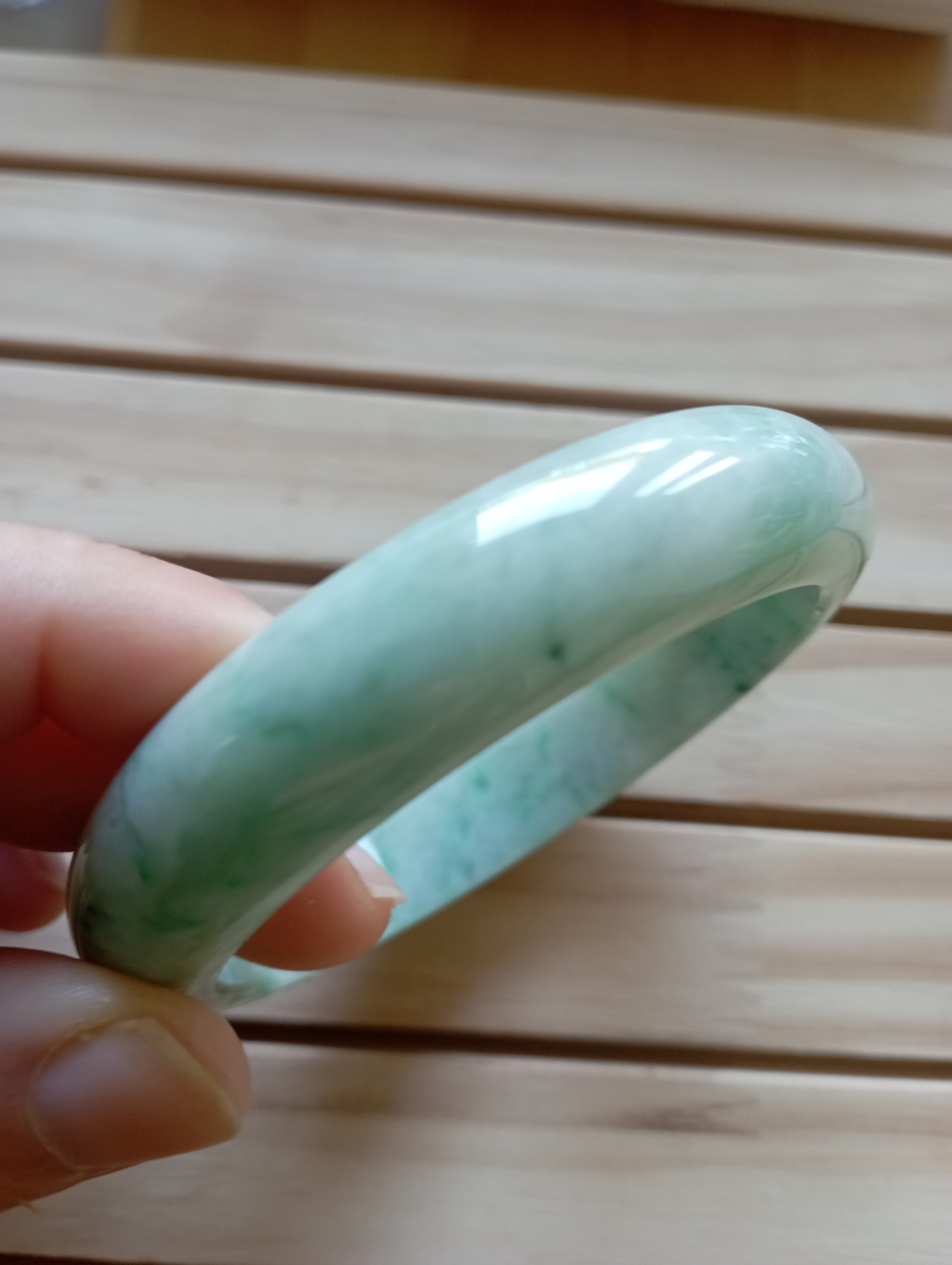 Beautiful apple green jadeite bangle measures 56.3 X 13.5 X 8.3mm, it has lovely darker green blooms scattered all over, the colour is gorgeous when the light shines through, it comes with a certificate of authenticity. £428