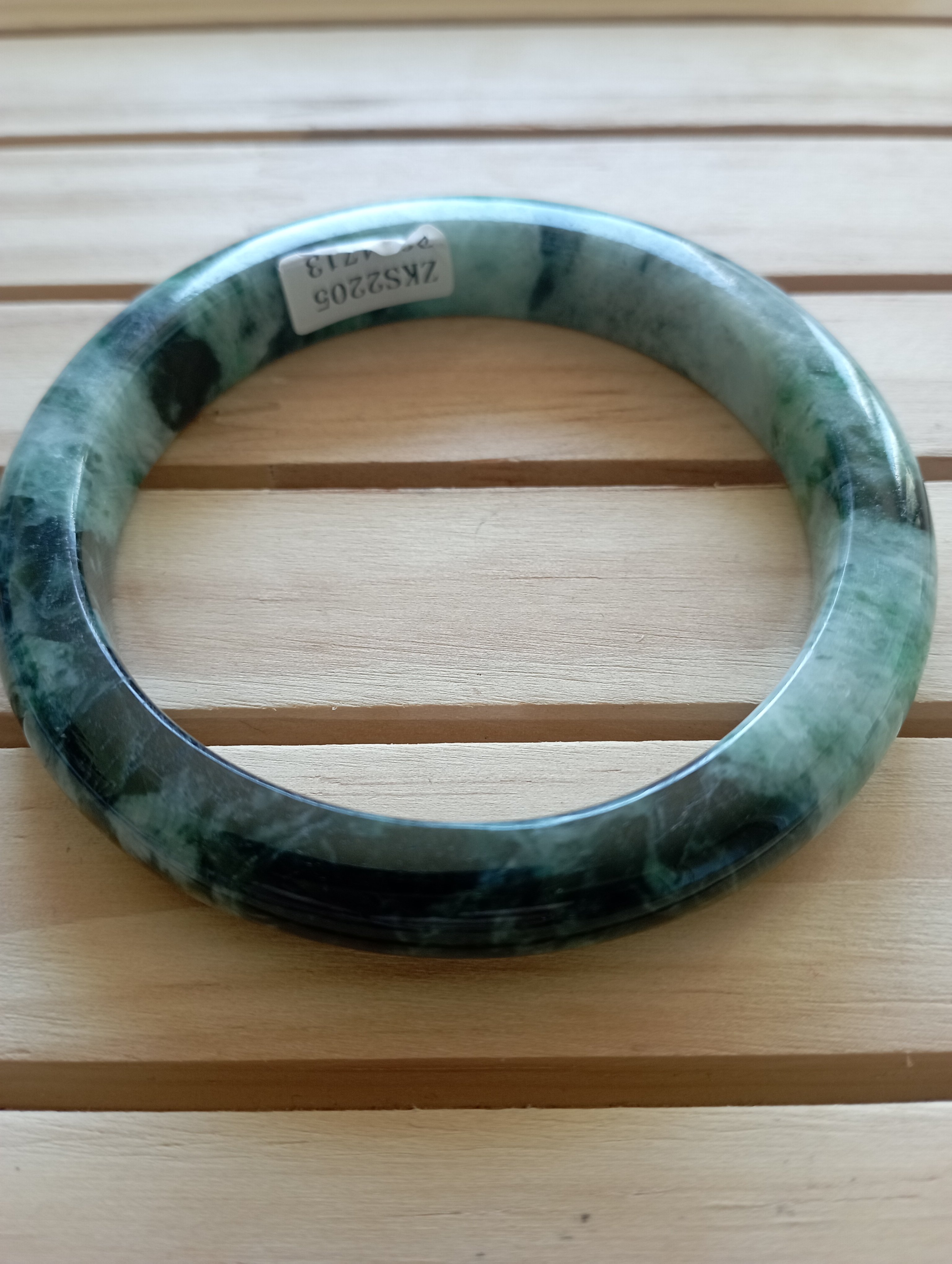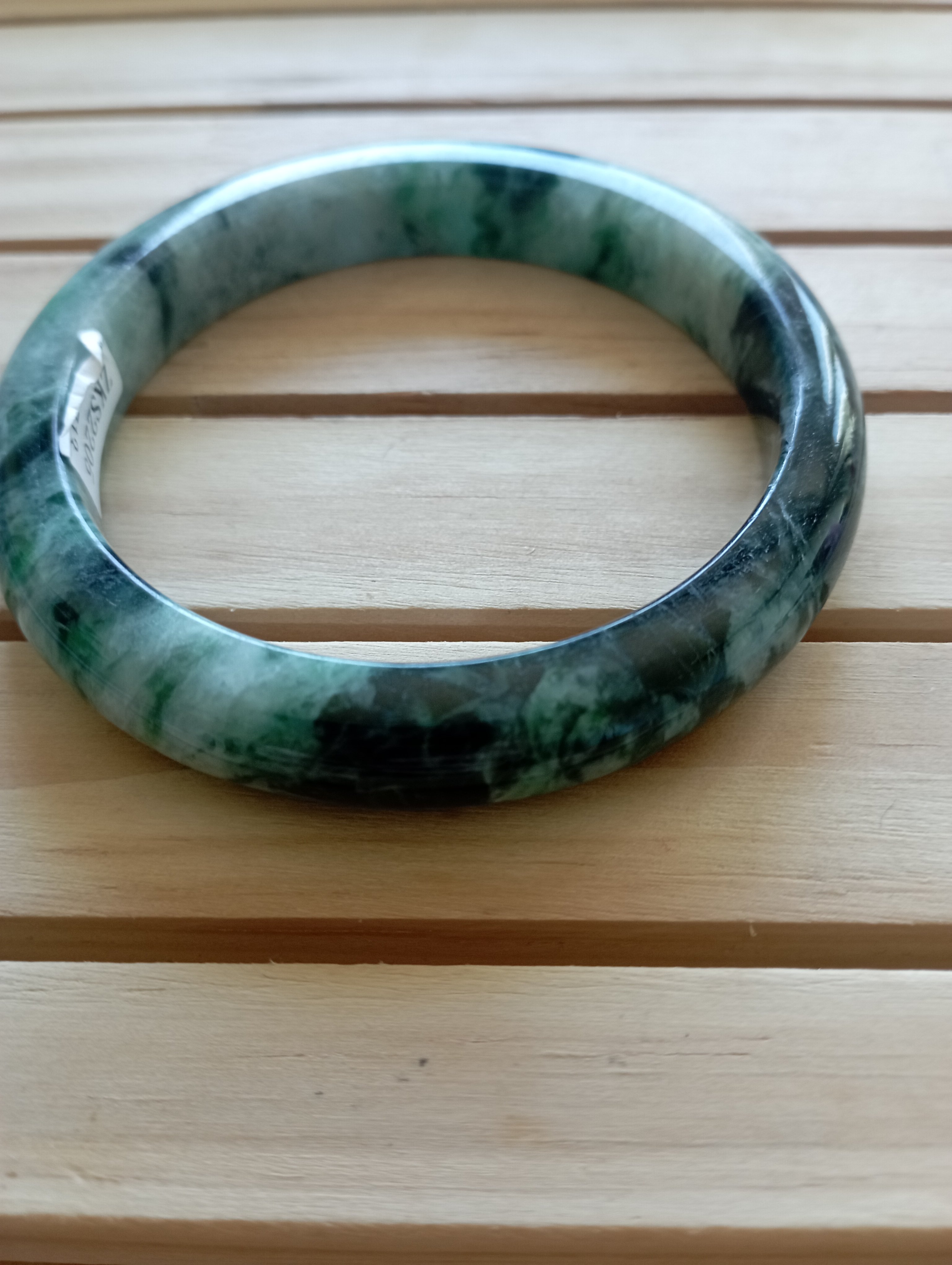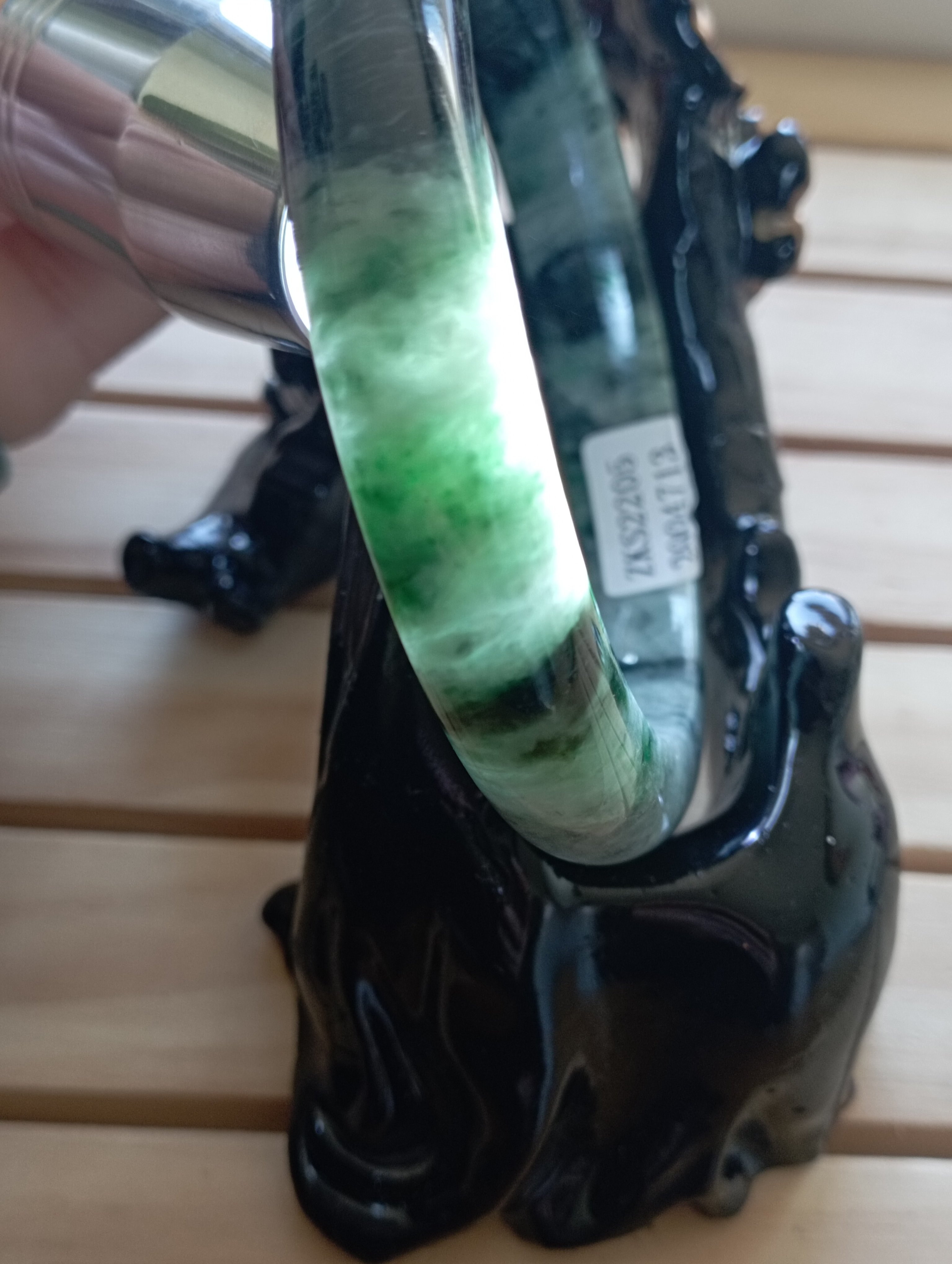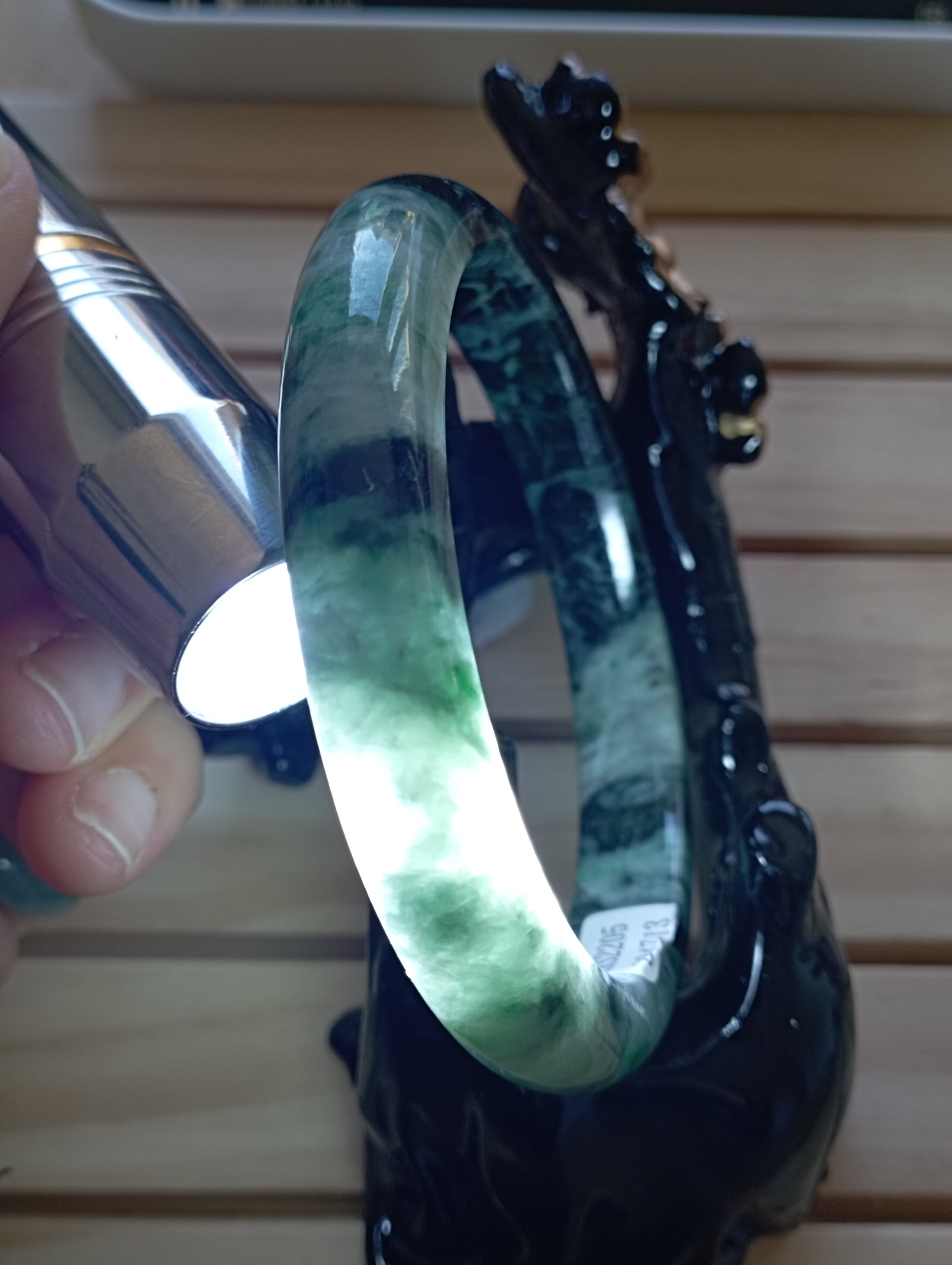 Lovely jadeite full green bangle with dark blooms. The lights can shine through the light green area but not the darker blooms. The dark area has surface lines but smooth to the touch. There are no obvious cracks. Bargain for this quality at £149 measures 57.8 X 10.6 X 9.2mm. comes with a certificate of authenticity.