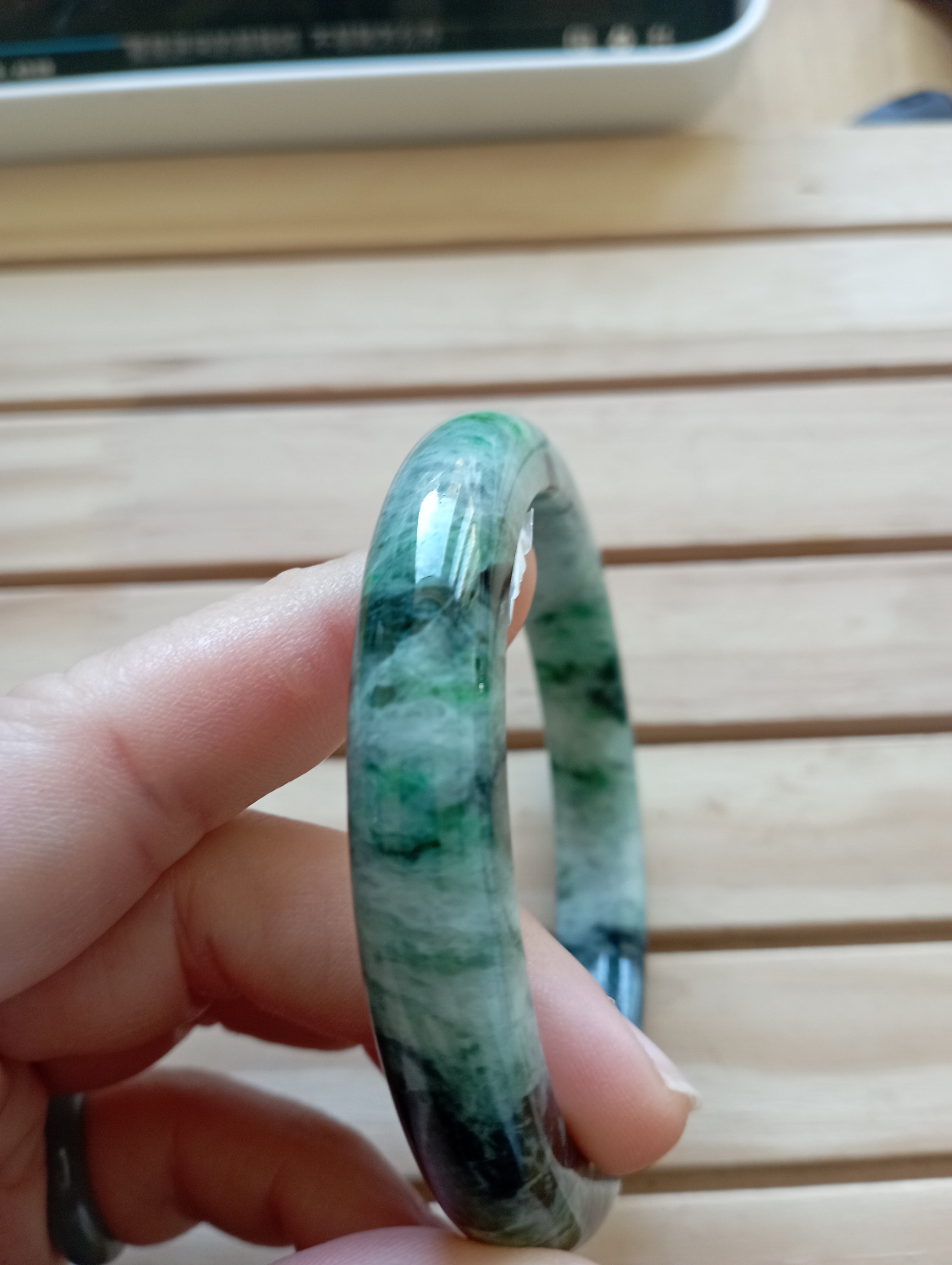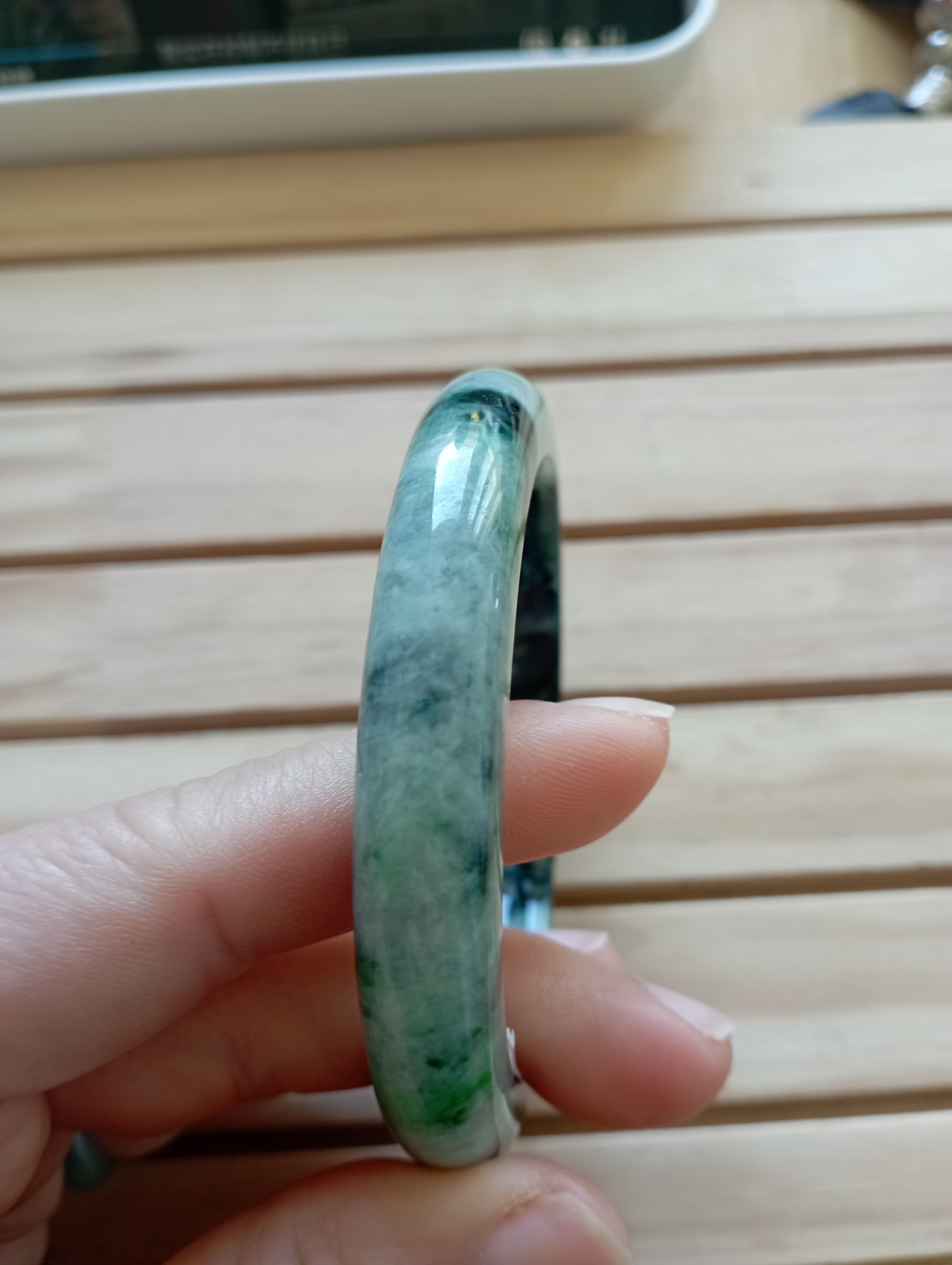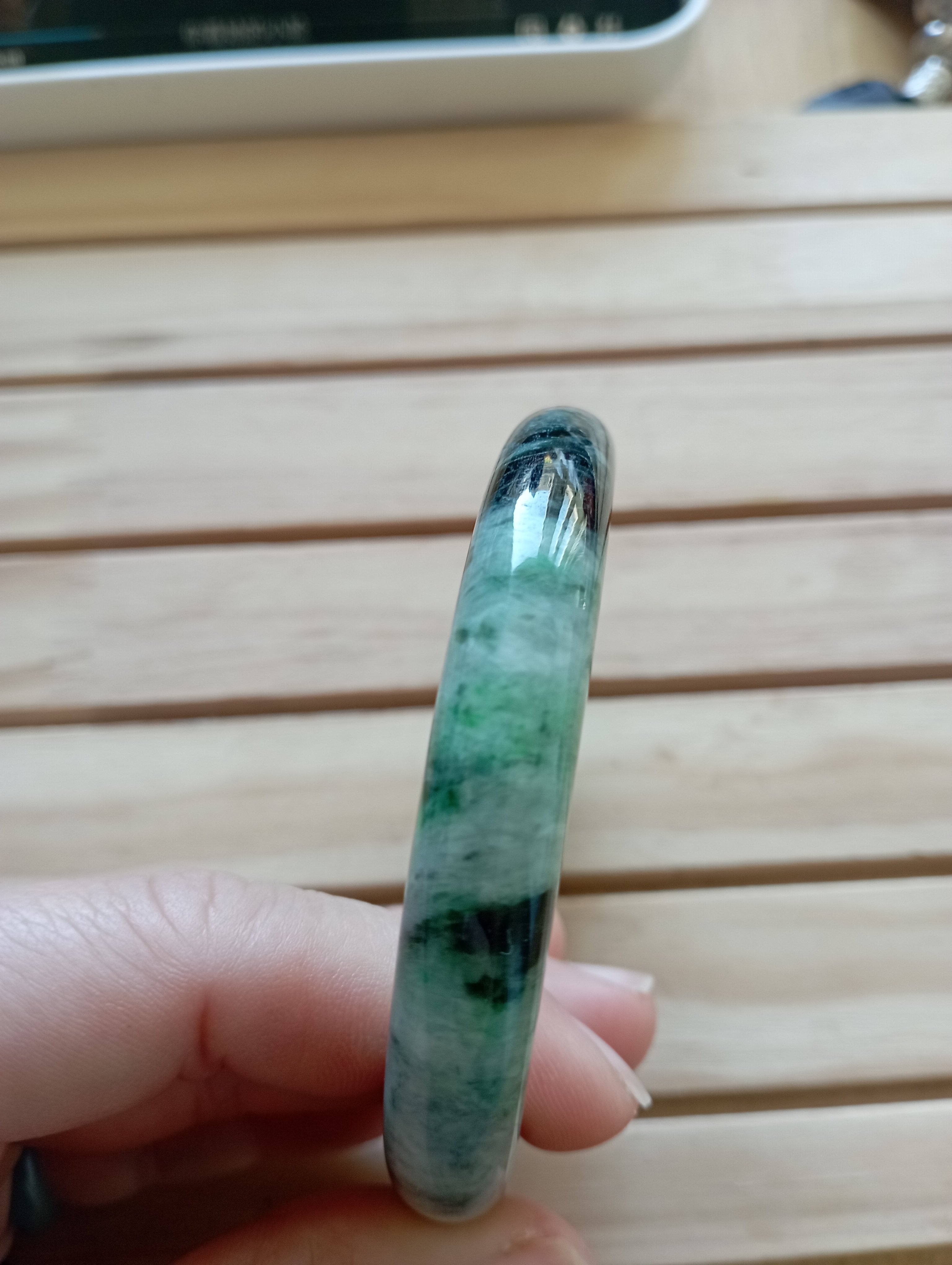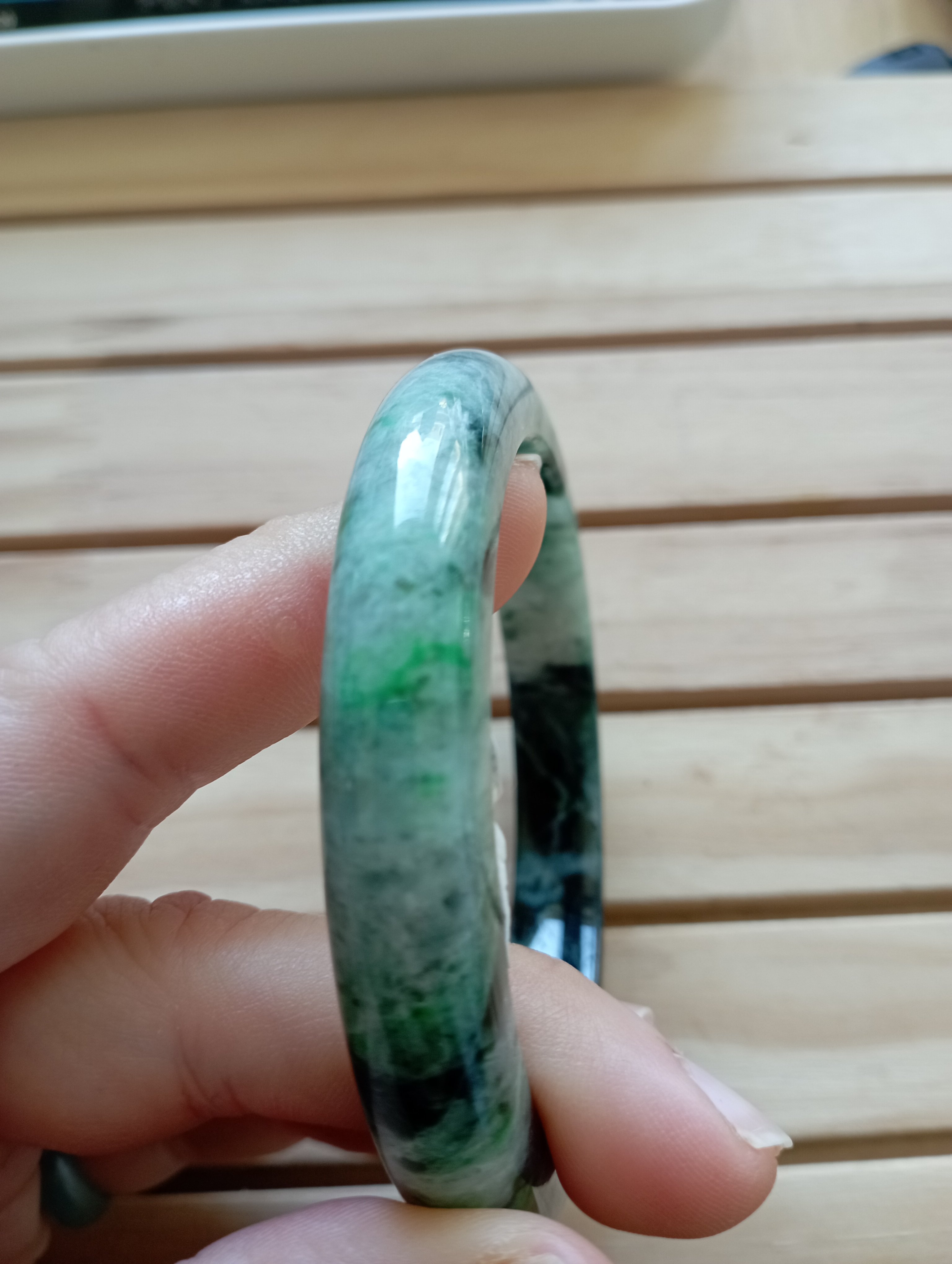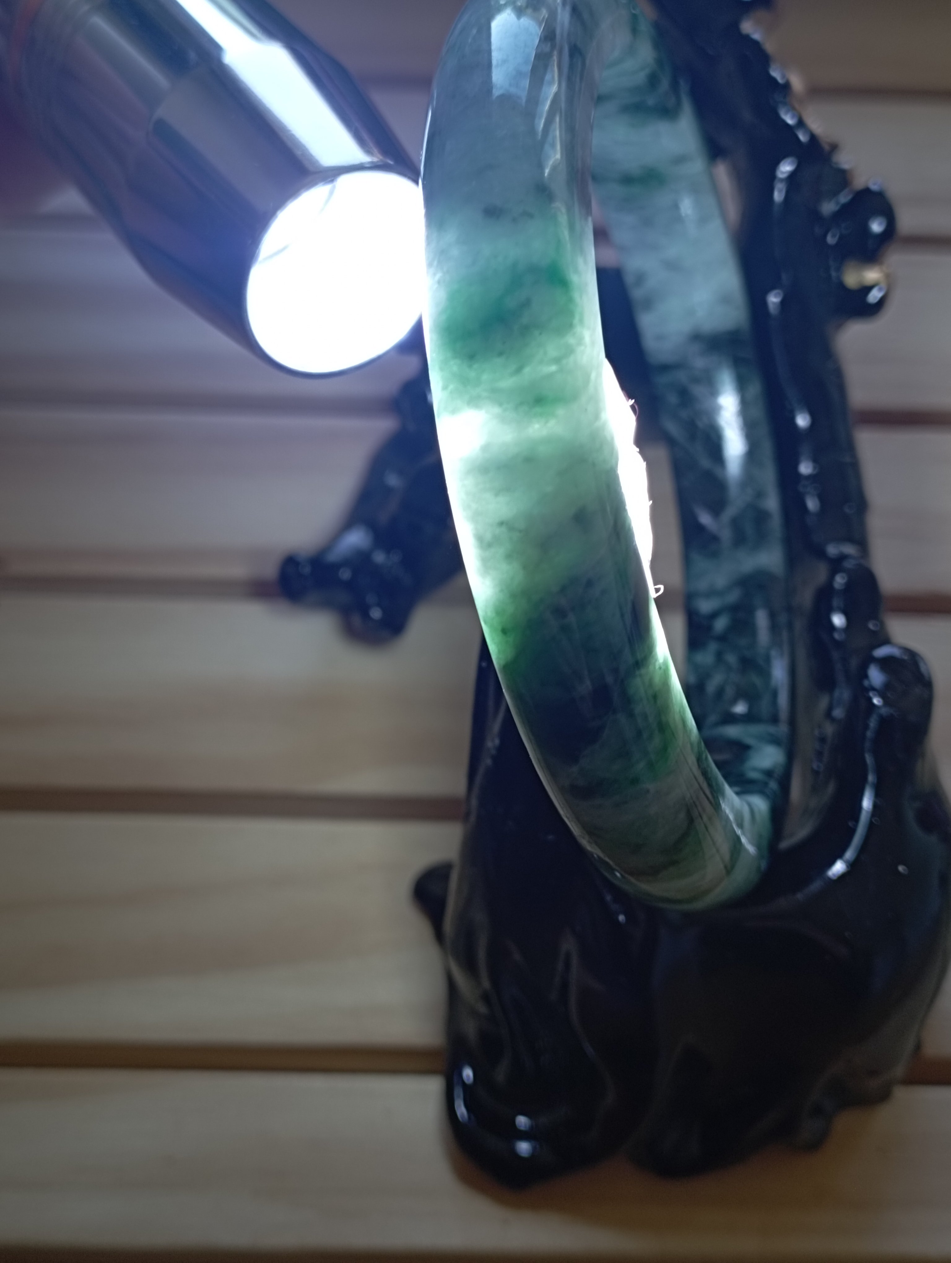 Lovely jadeite full green bangle with dark blooms. The lights can shine through the light green area but not the darker blooms. The dark area has surface lines but smooth to the touch. There are no obvious cracks. Bargain for this quality at £149 measures 57.8 X 10.6 X 9.2mm. comes with a certificate of authenticity.