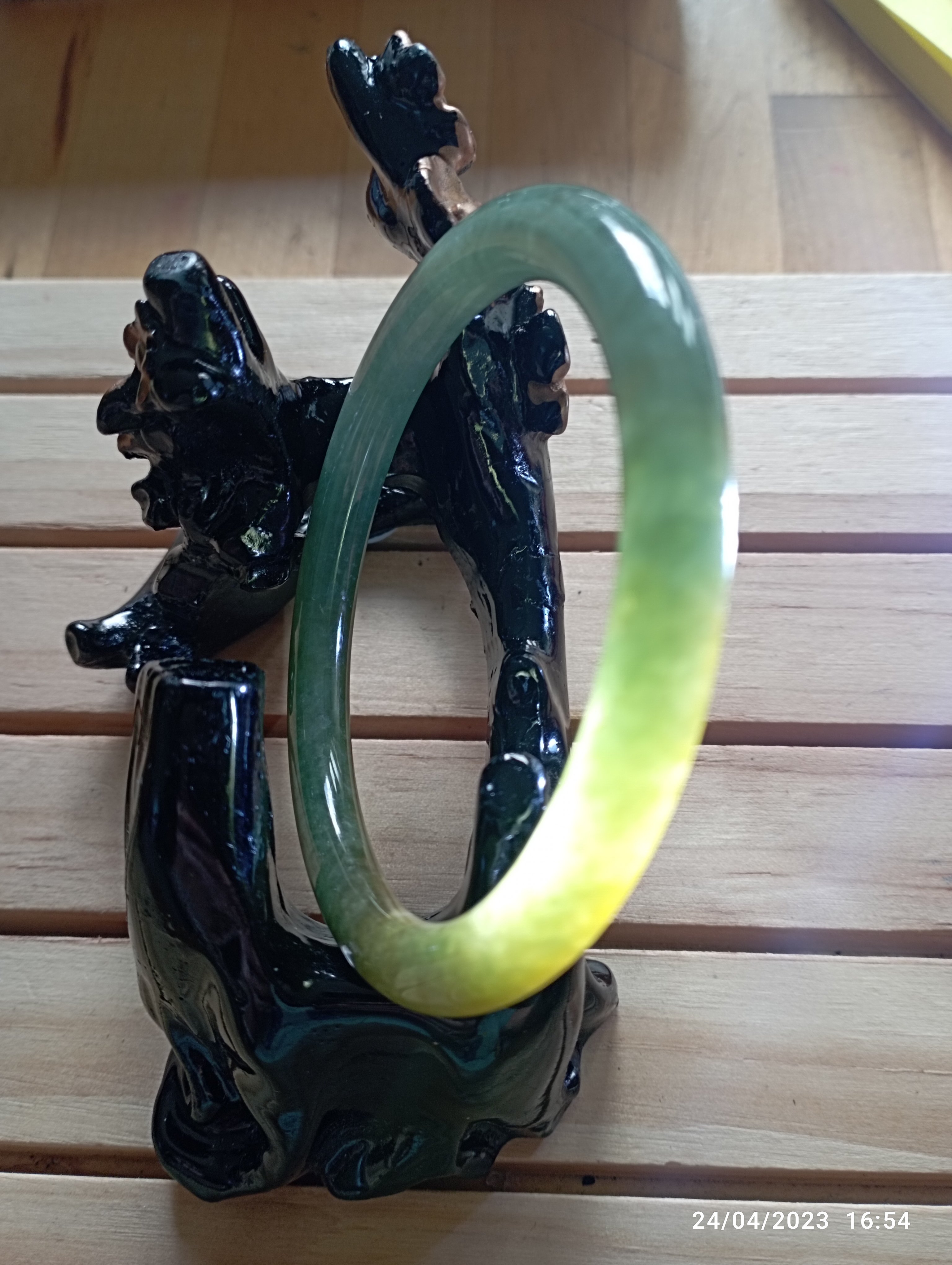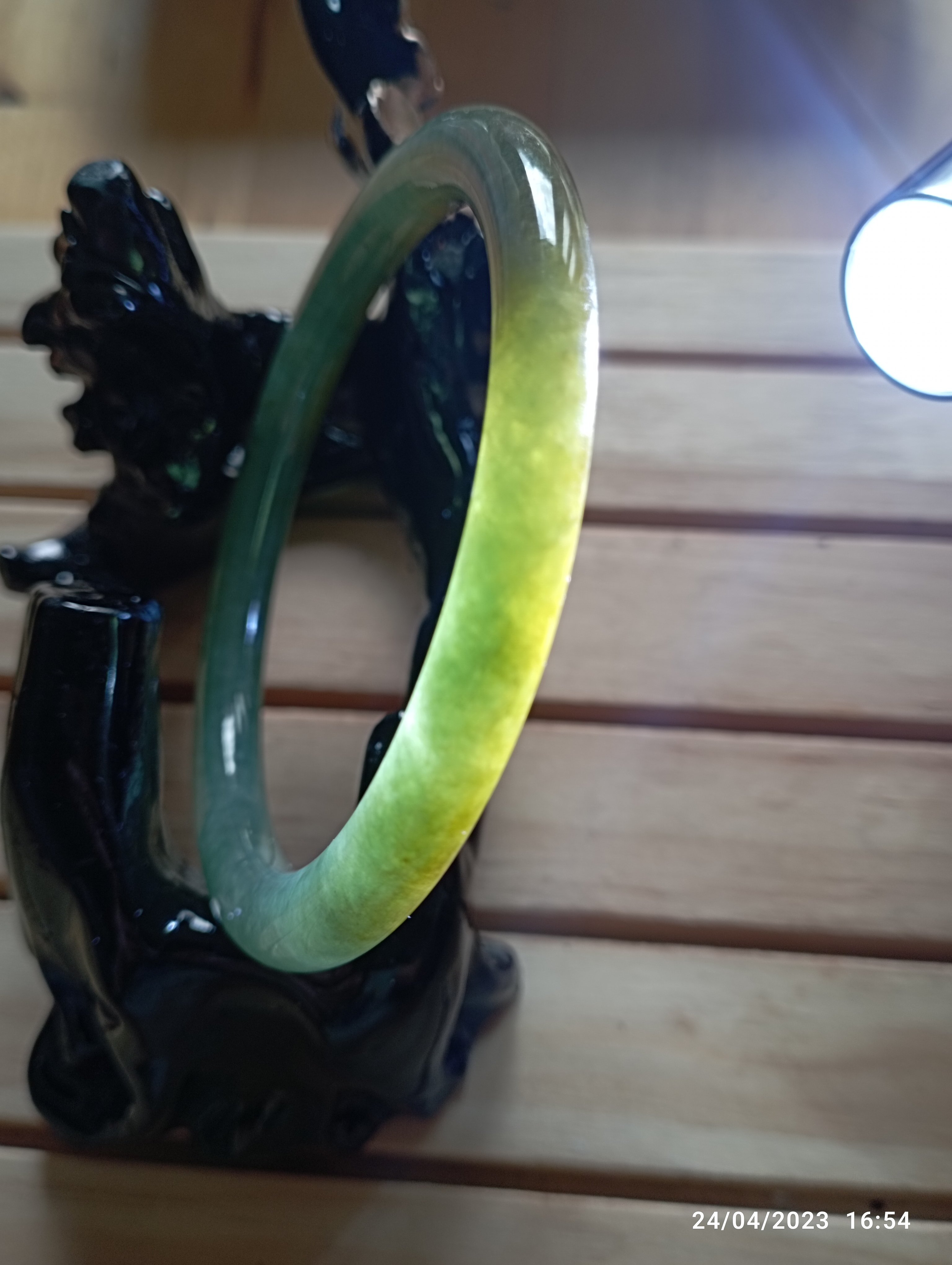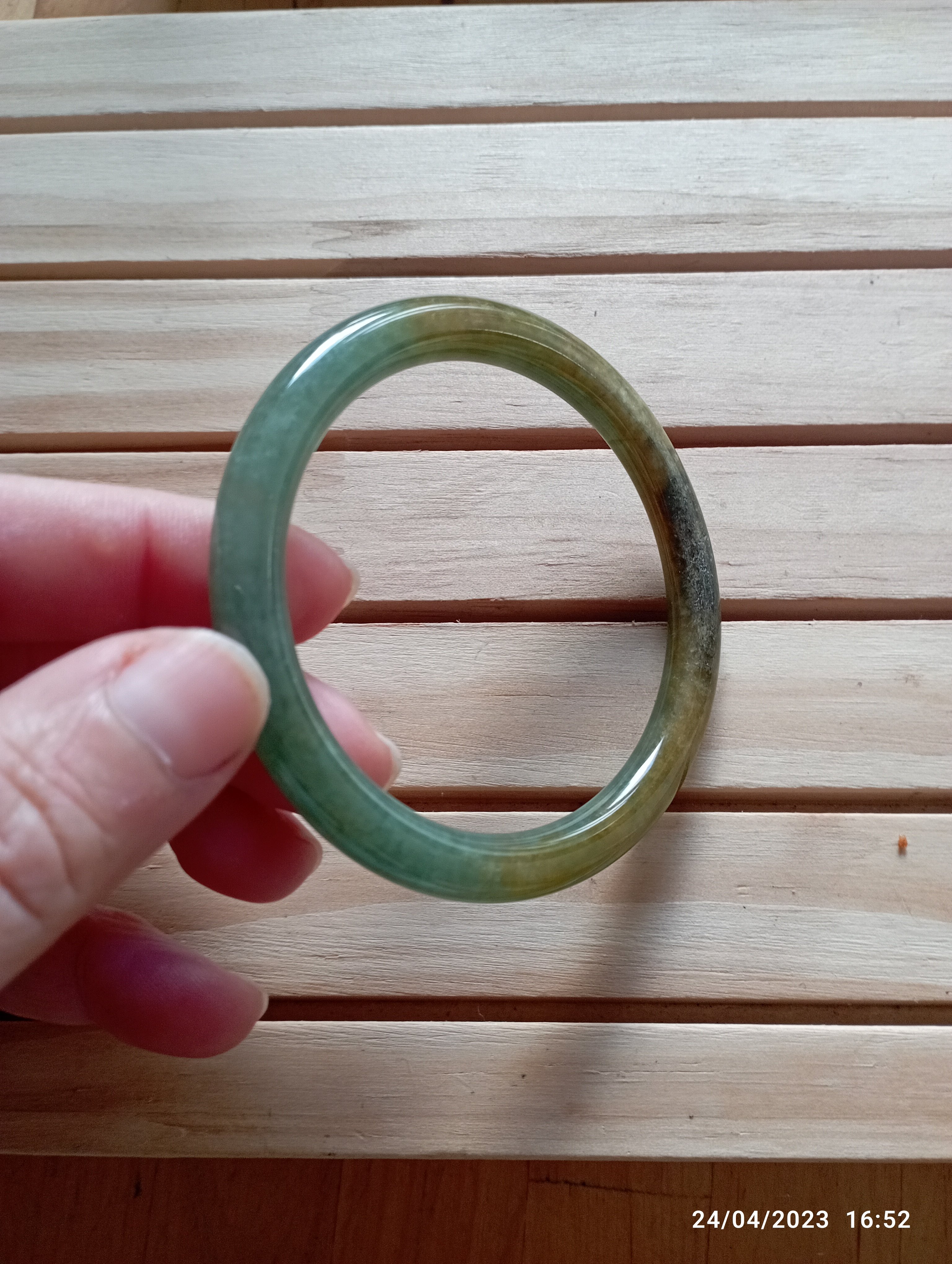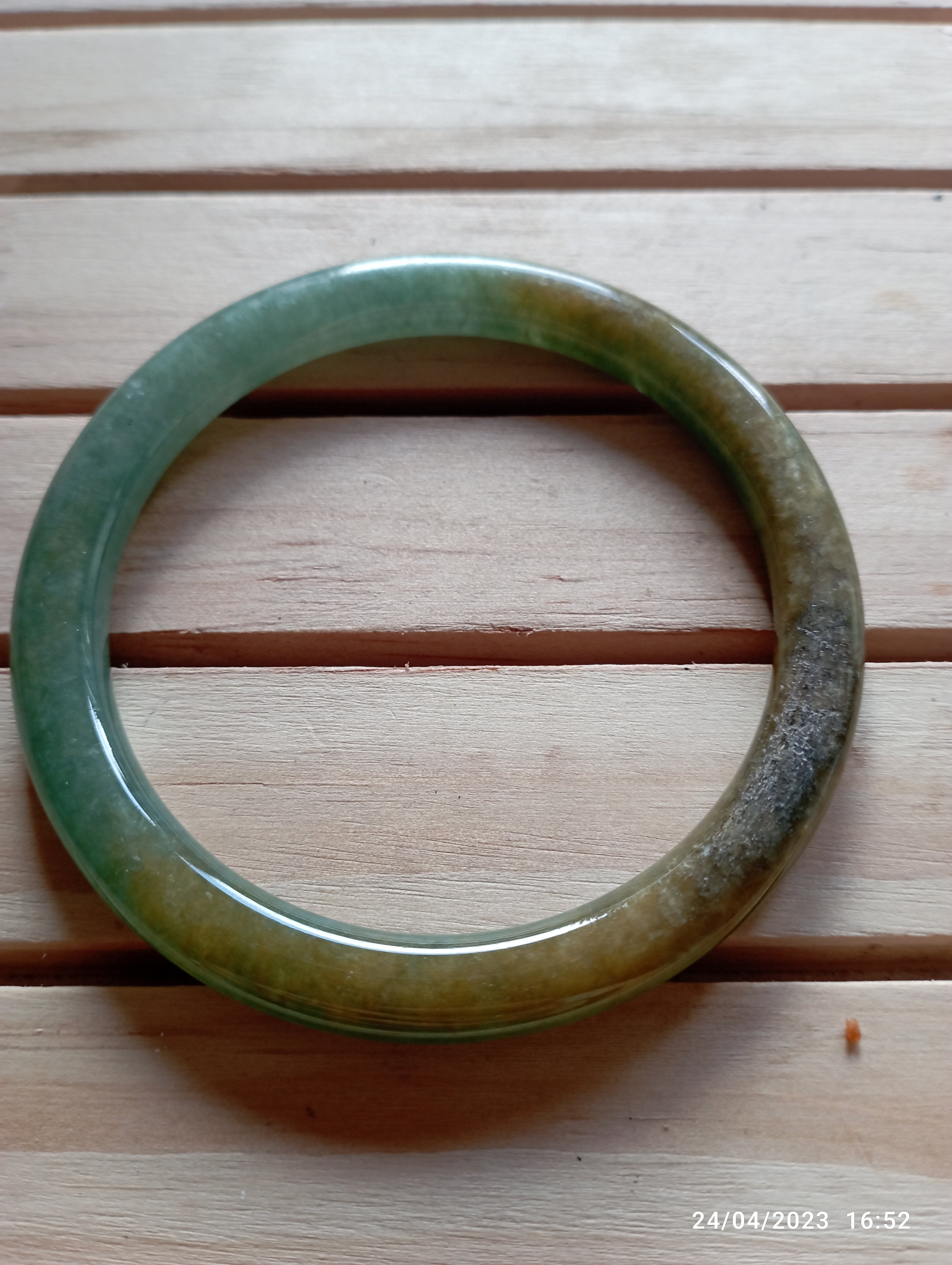 Fits up to 57mm, this round jadeite bangle is half green and half yellow. It is quite translucent as you can see from the picture. The roughness on the surface is from the skin of the stone and limited to one area only. Lovely green colour as well as the colour of gold. Measures 55.4 X 6.5 X 8mm, comes with a certificate of authenticity £150