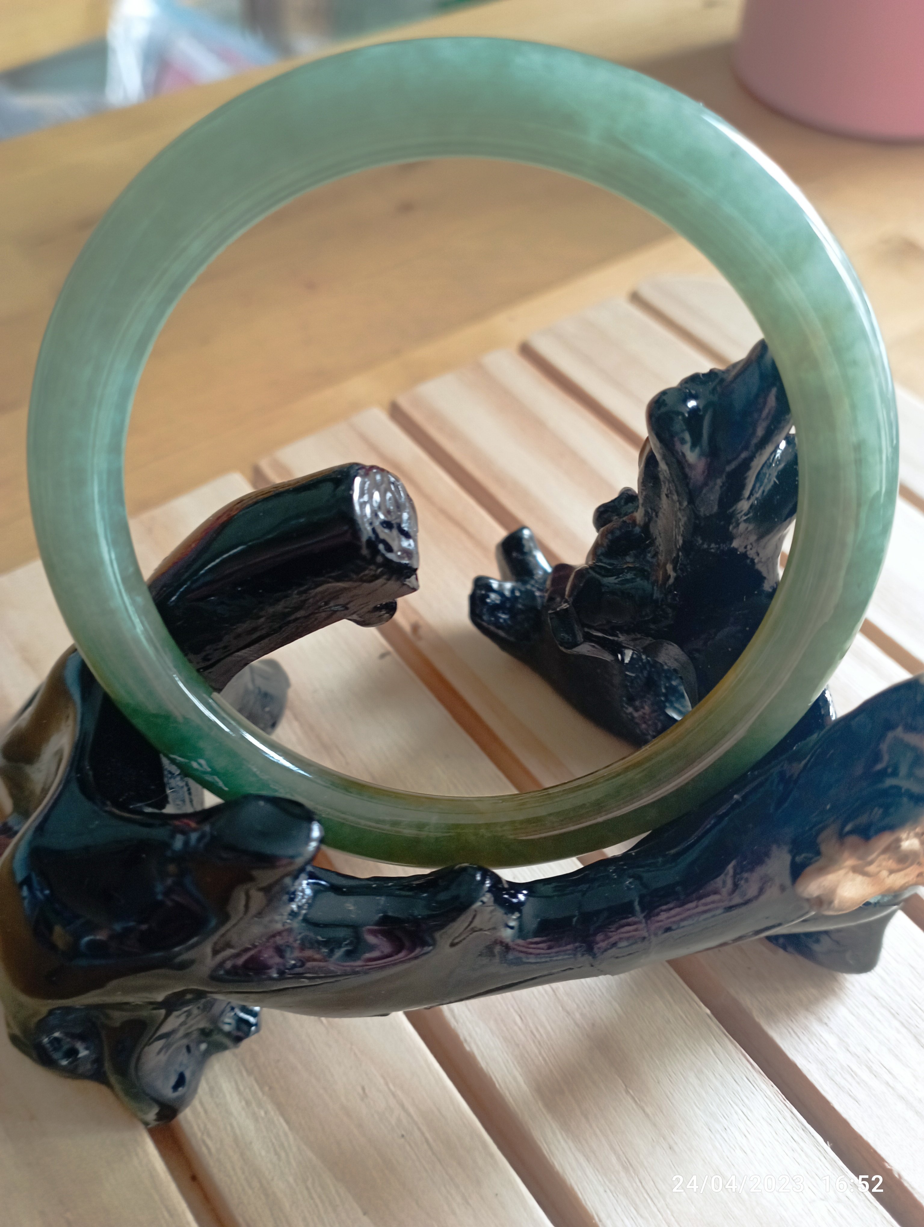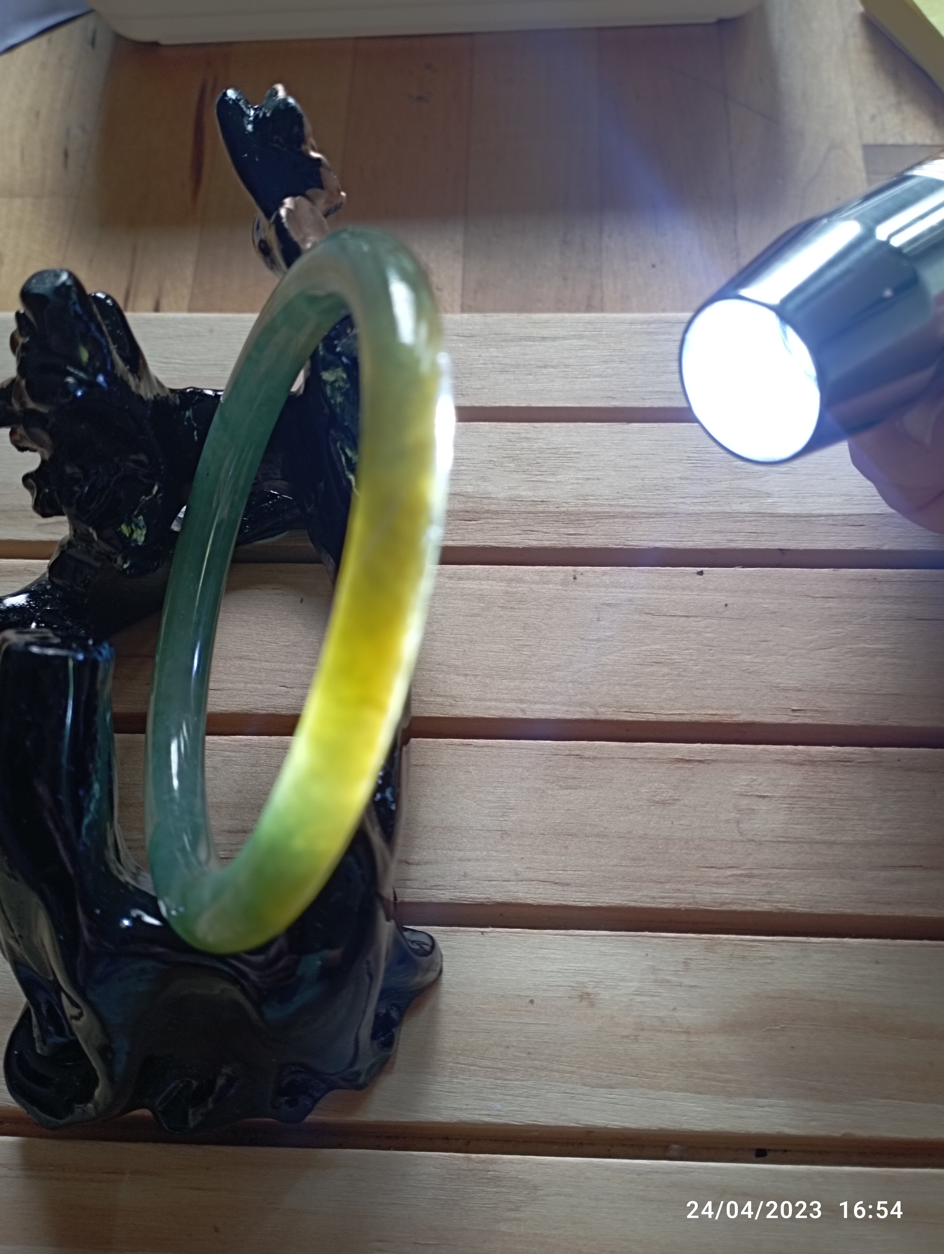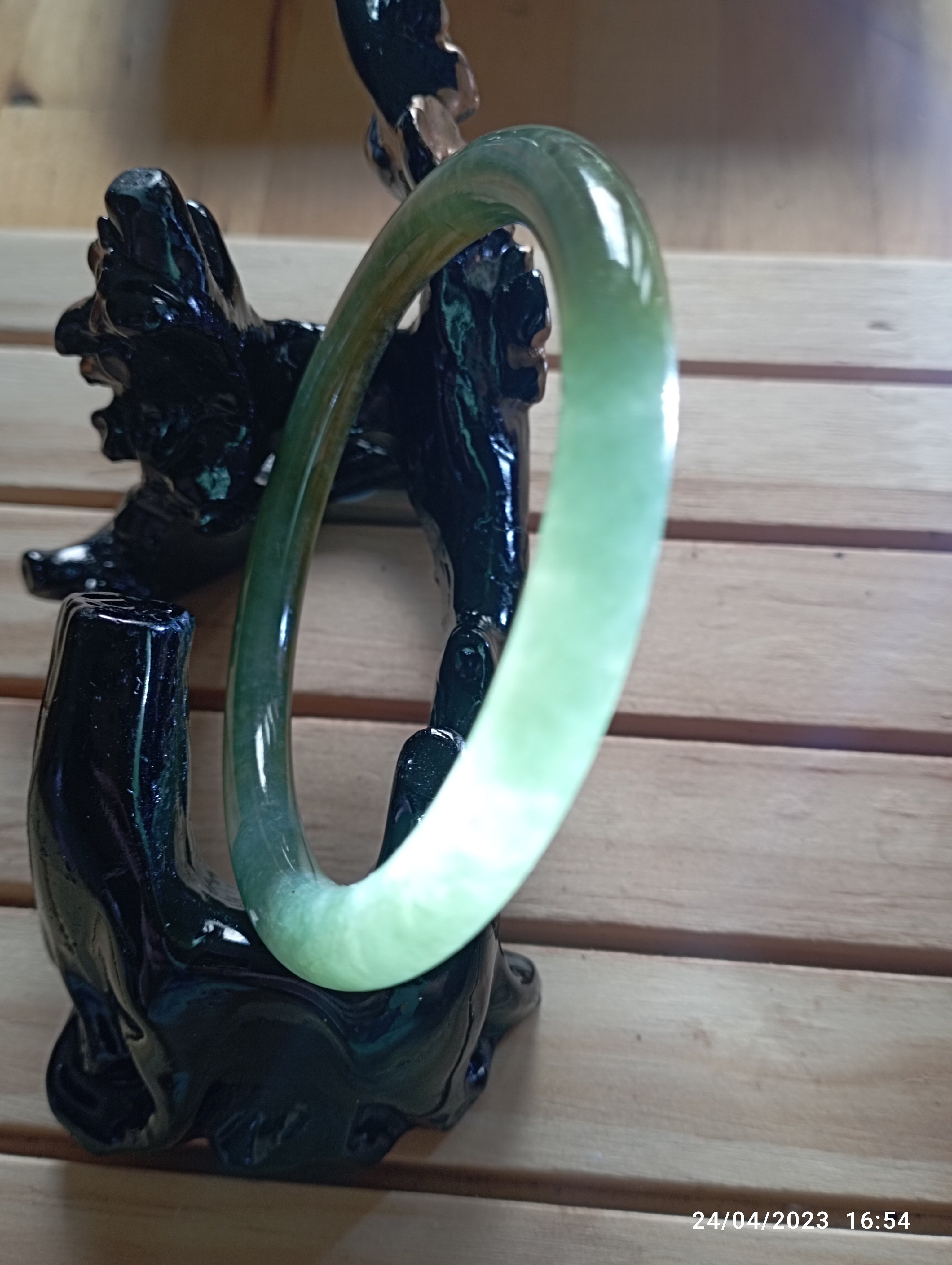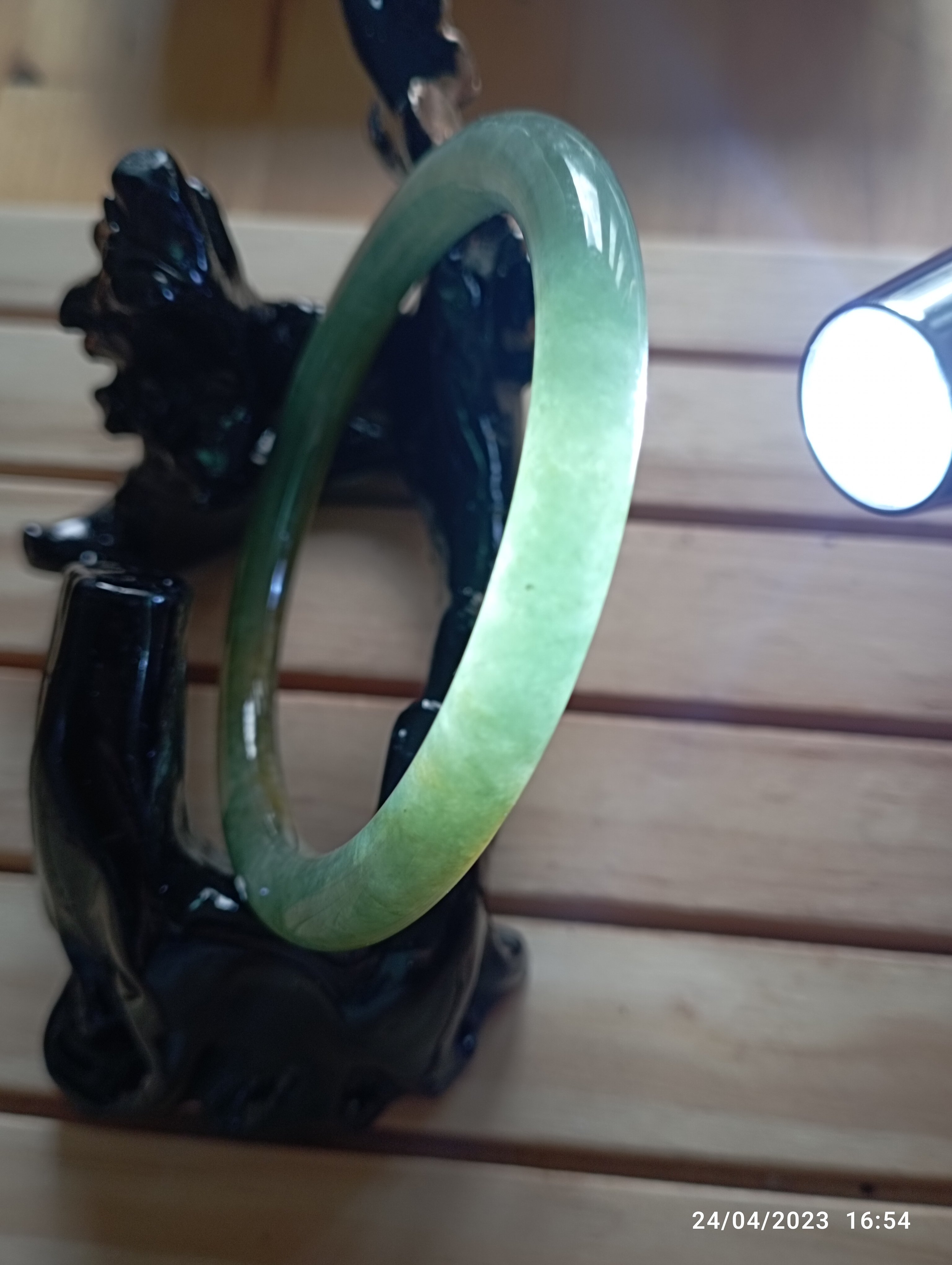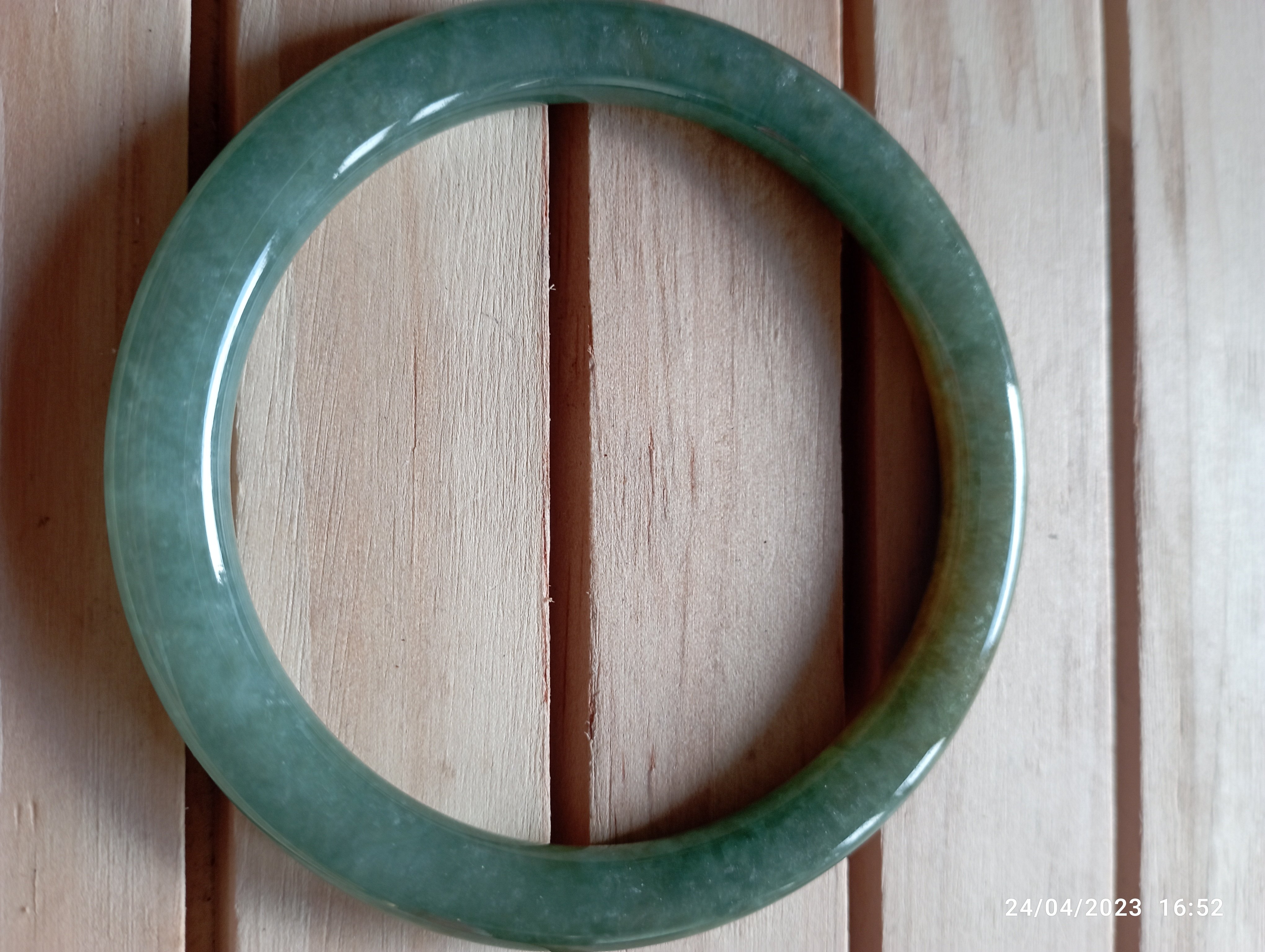 Fits up to 57mm, this round jadeite bangle is half green and half yellow. It is quite translucent as you can see from the picture. The roughness on the surface is from the skin of the stone and limited to one area only. Lovely green colour as well as the colour of gold. Measures 55.4 X 6.5 X 8mm, comes with a certificate of authenticity £150