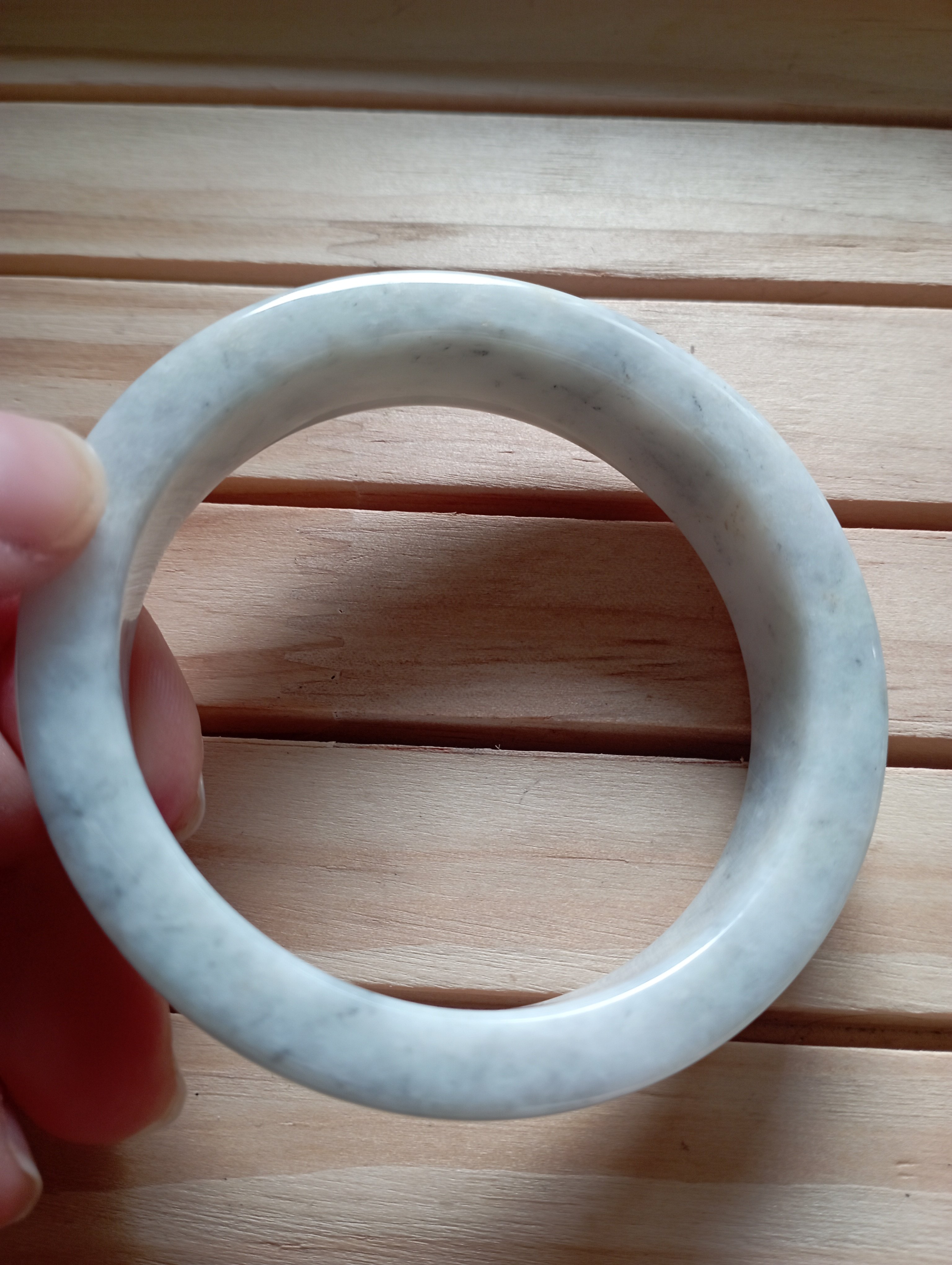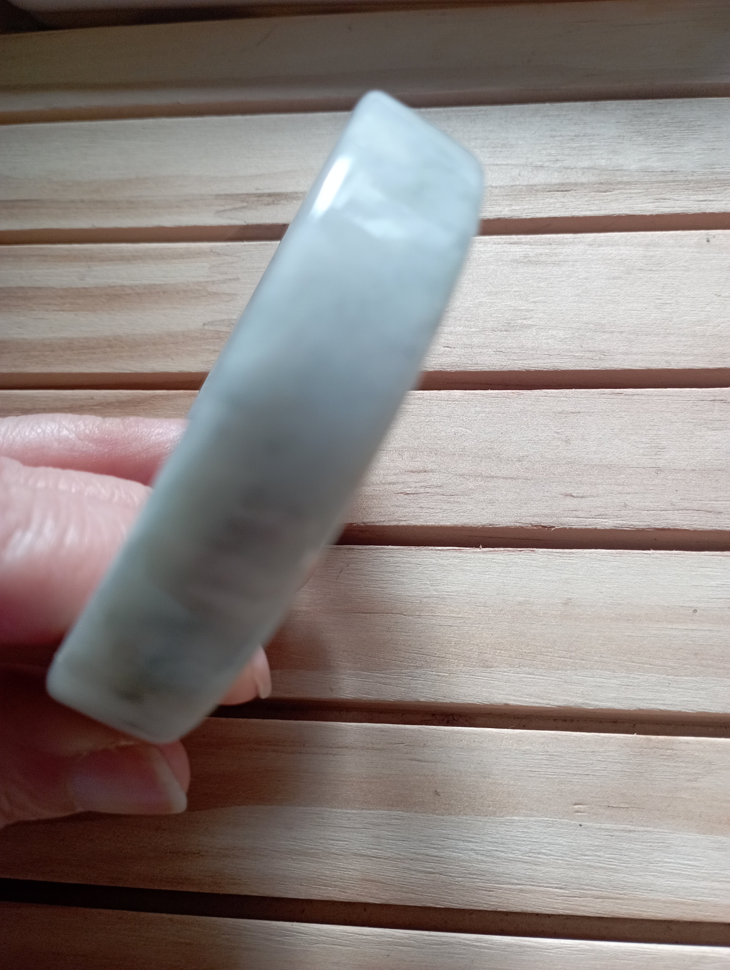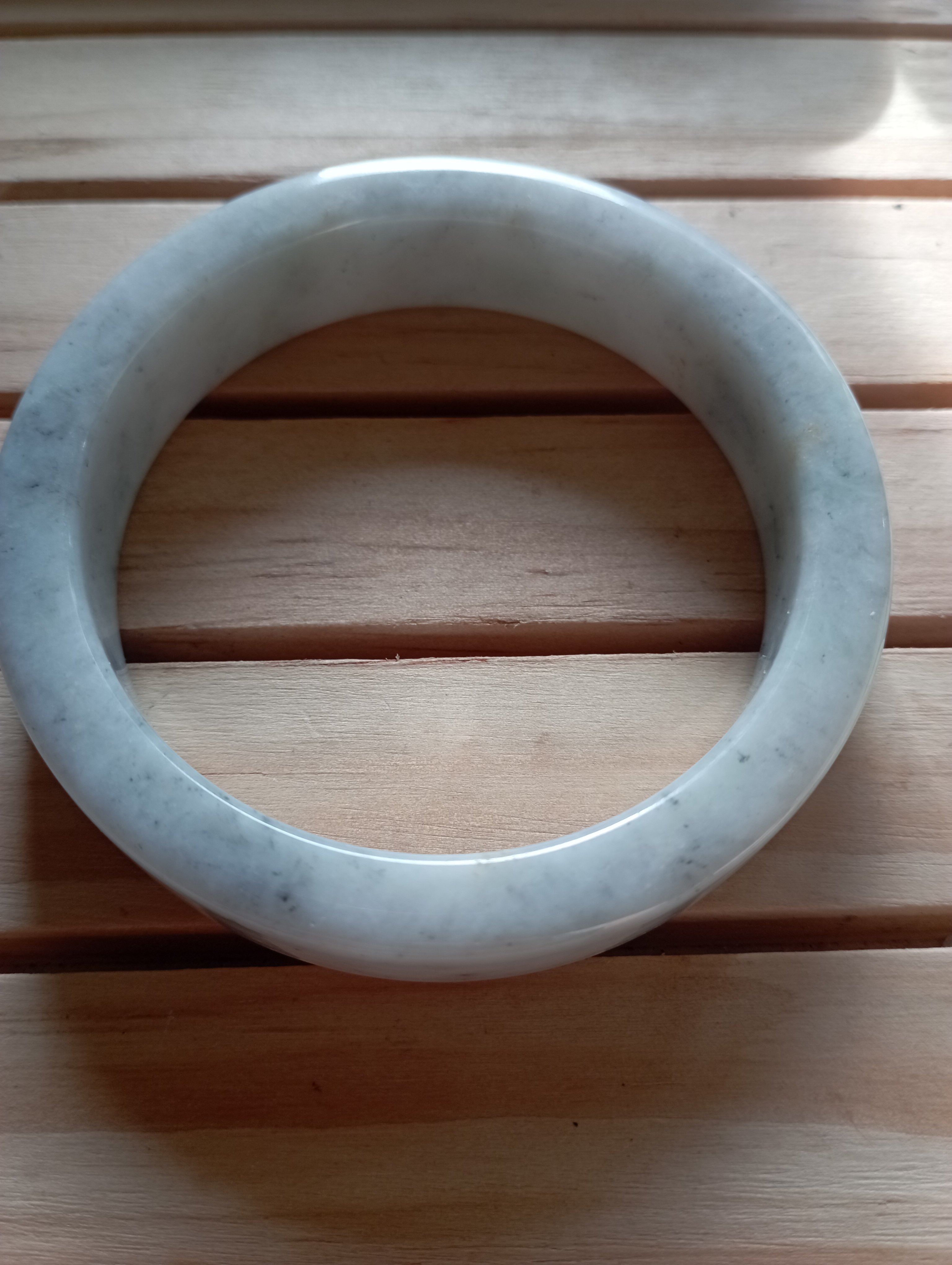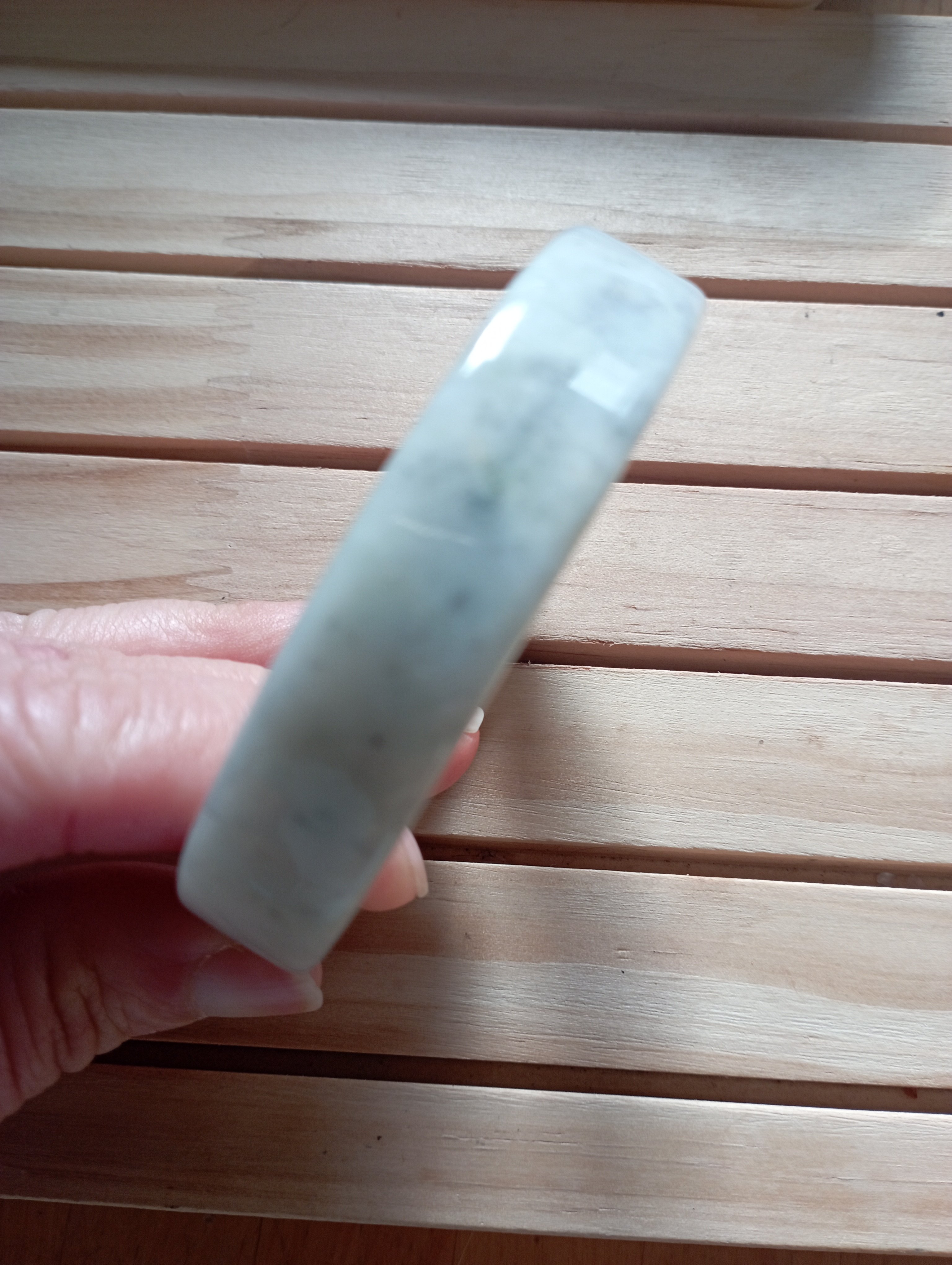 Unusual shape, with a width of 12.9mm thickness of 8.3mm with a diameter of 57.4mm, this lovely pales green bangle weighs 68.95g, comes with a certificate of authenticity. £188