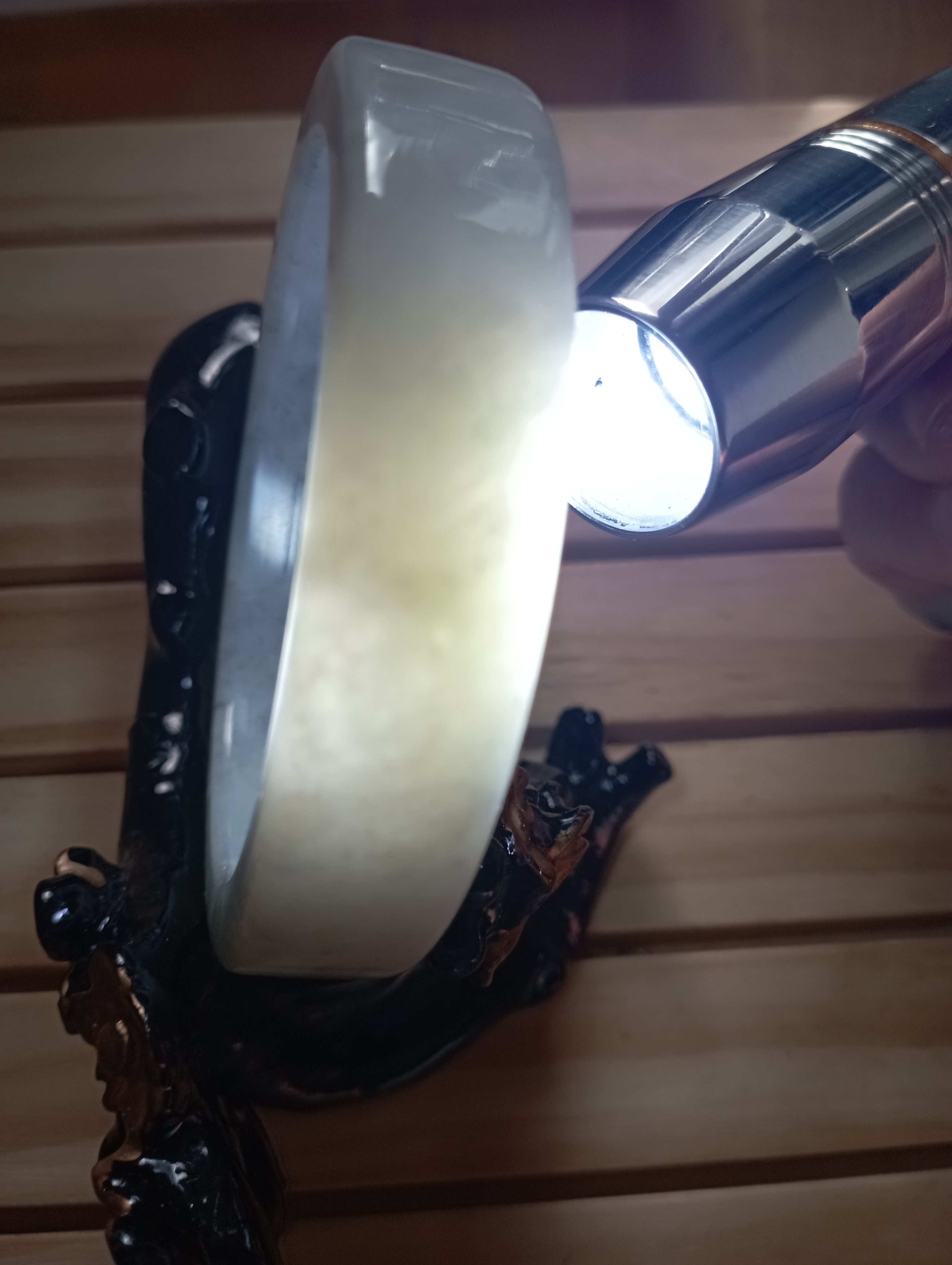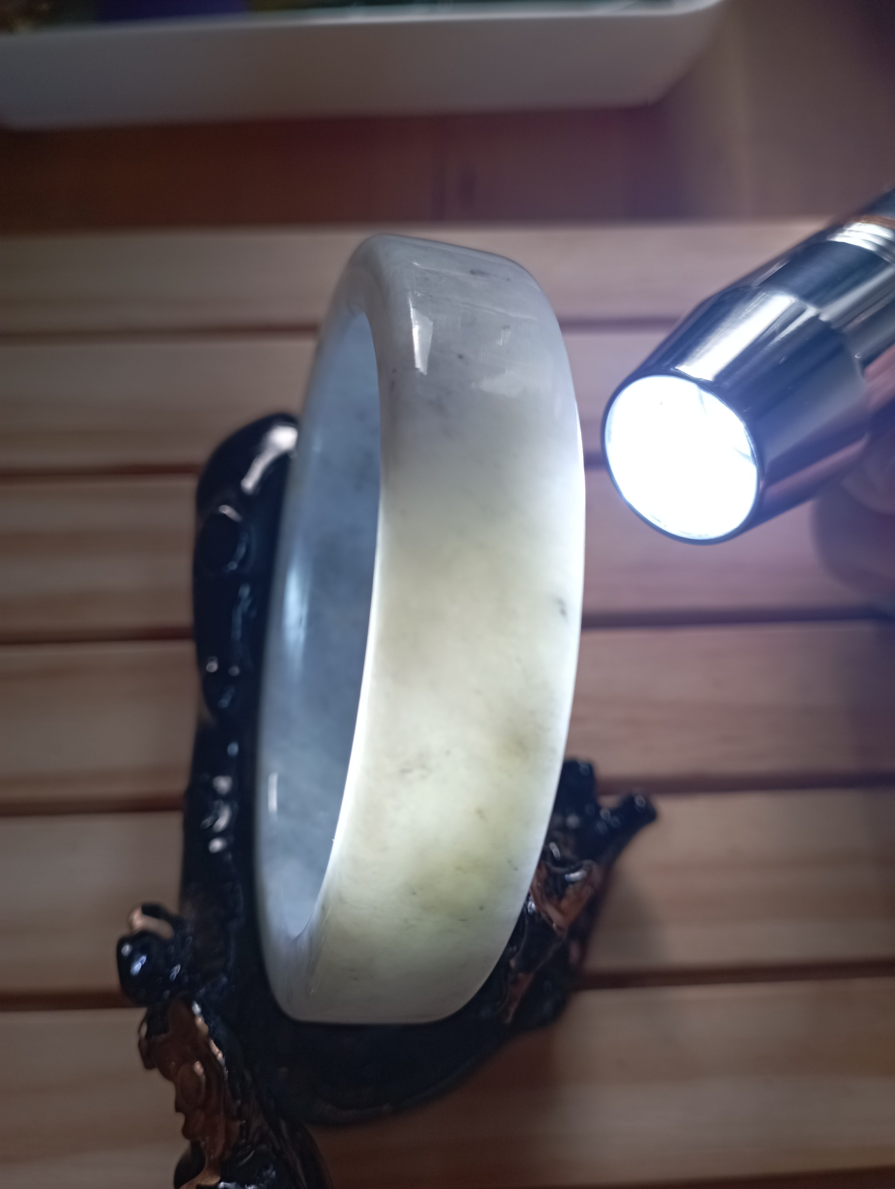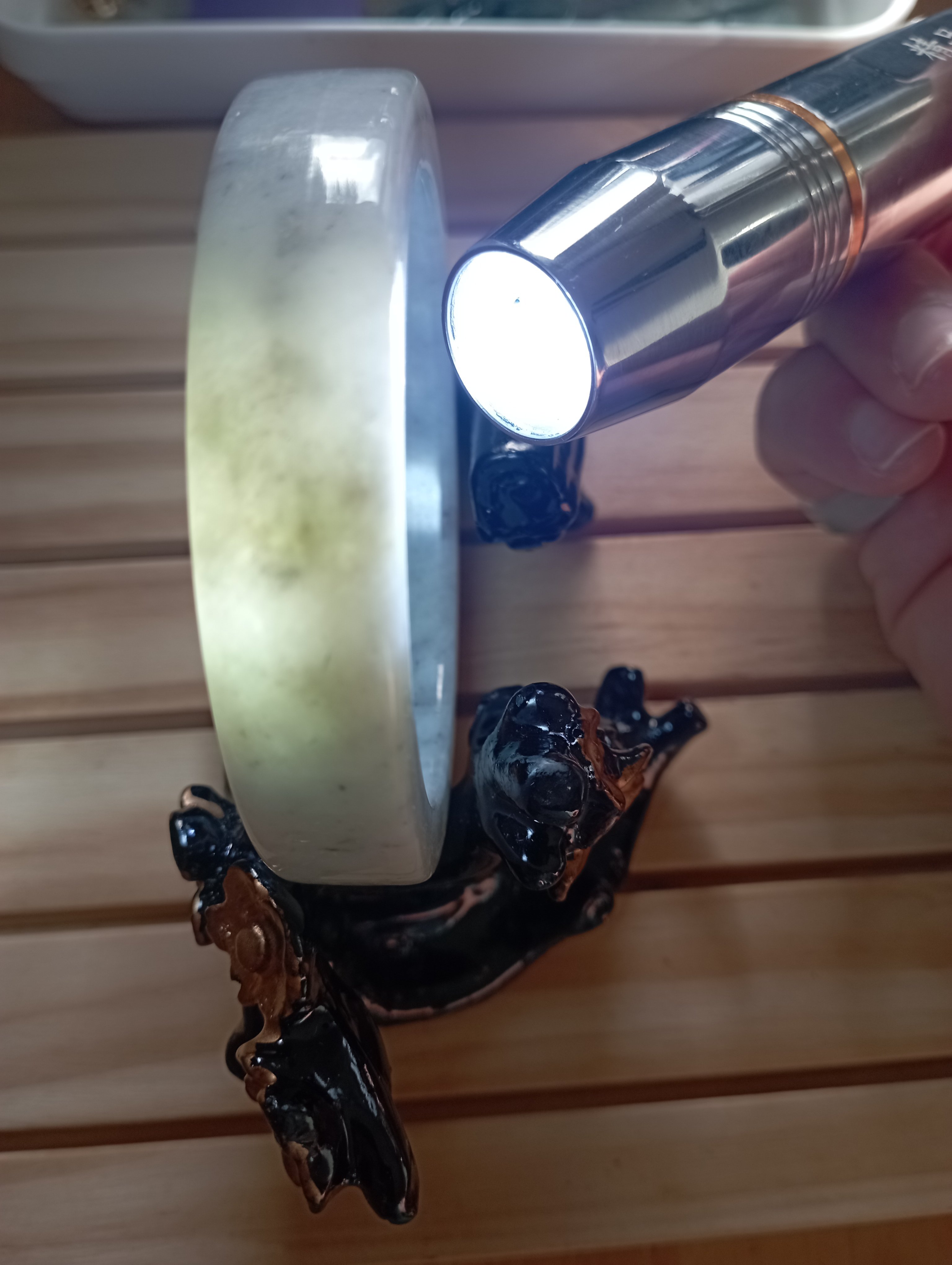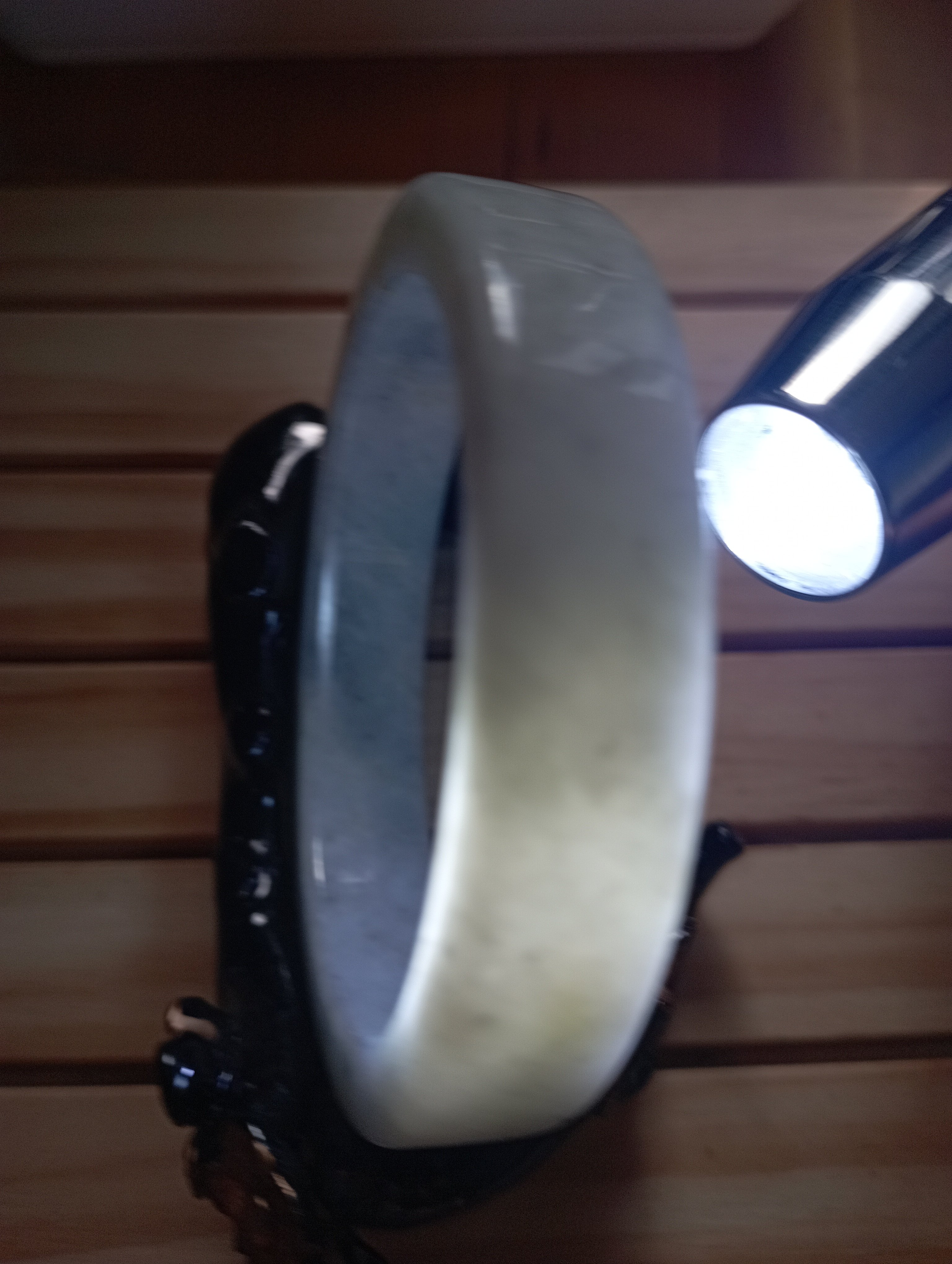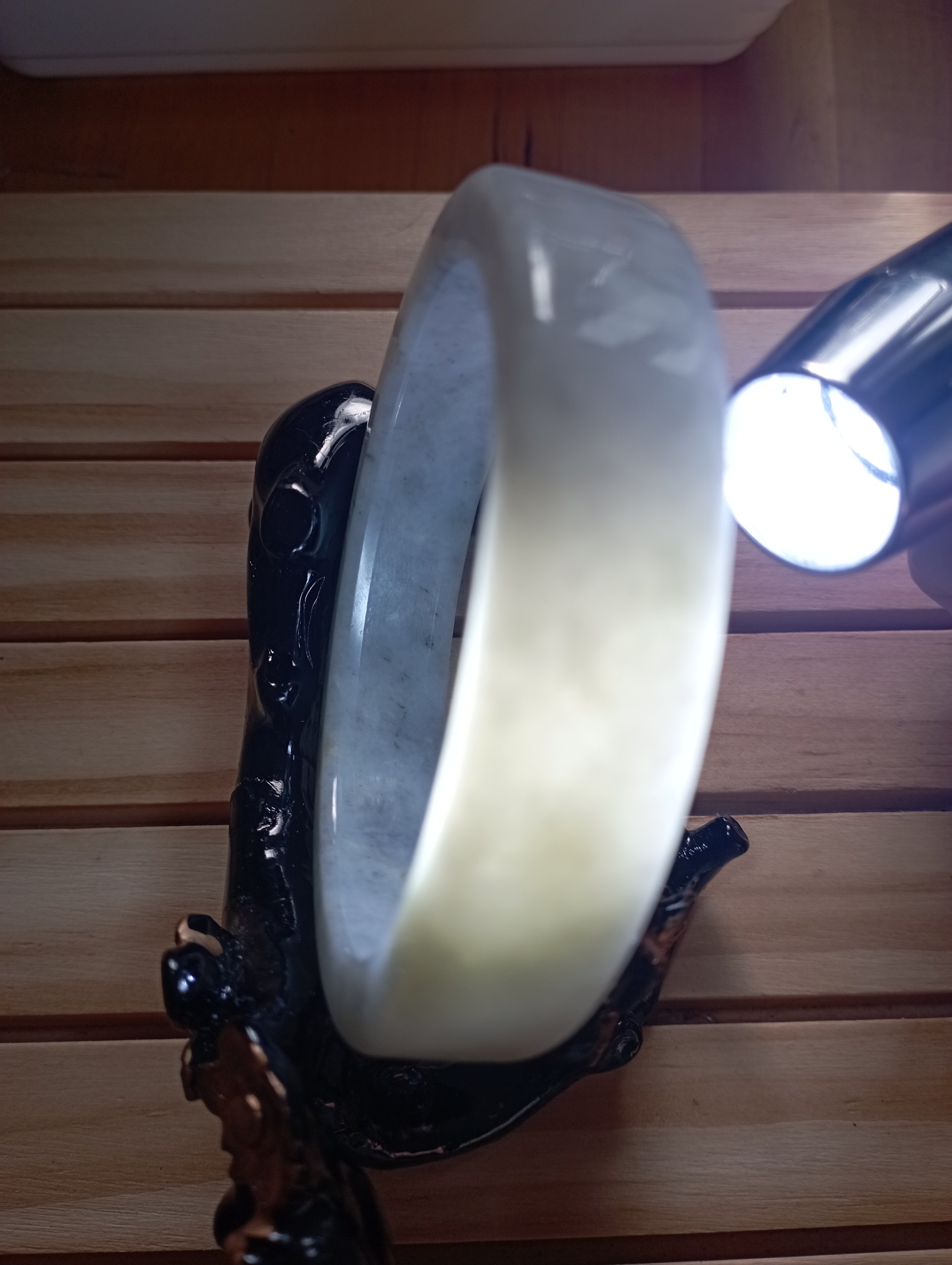 Unusual shape, with a width of 12.9mm thickness of 8.3mm with a diameter of 57.4mm, this lovely pales green bangle weighs 68.95g, comes with a certificate of authenticity. £188