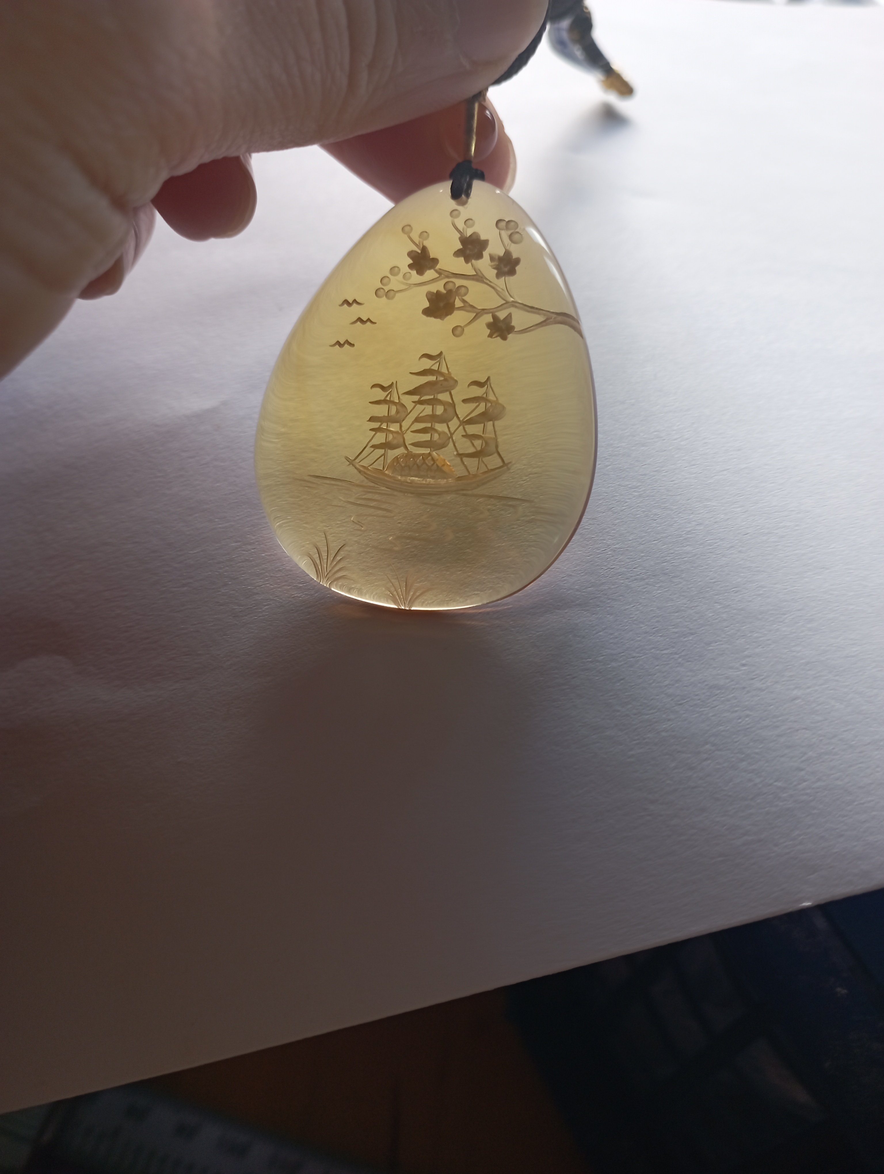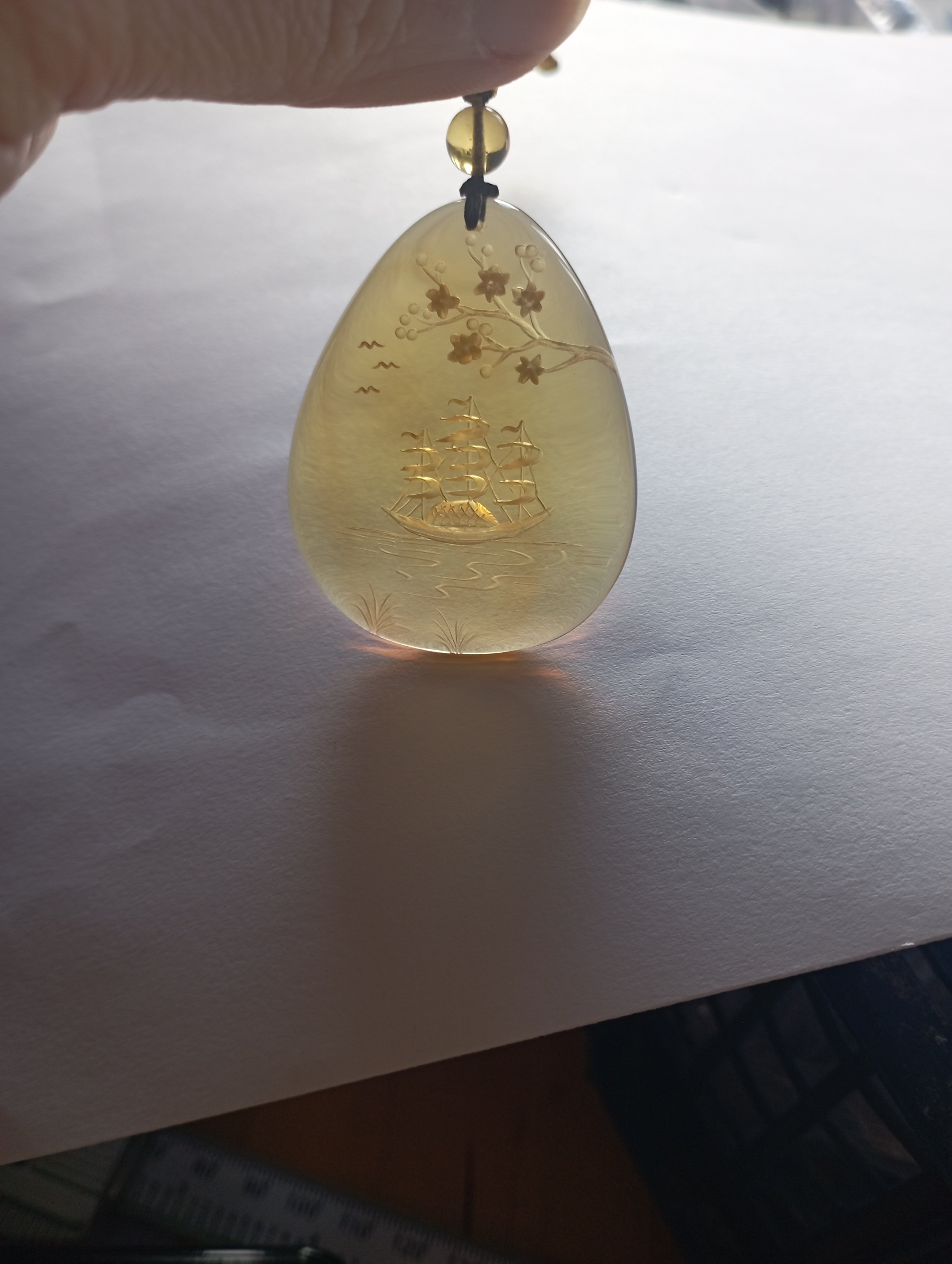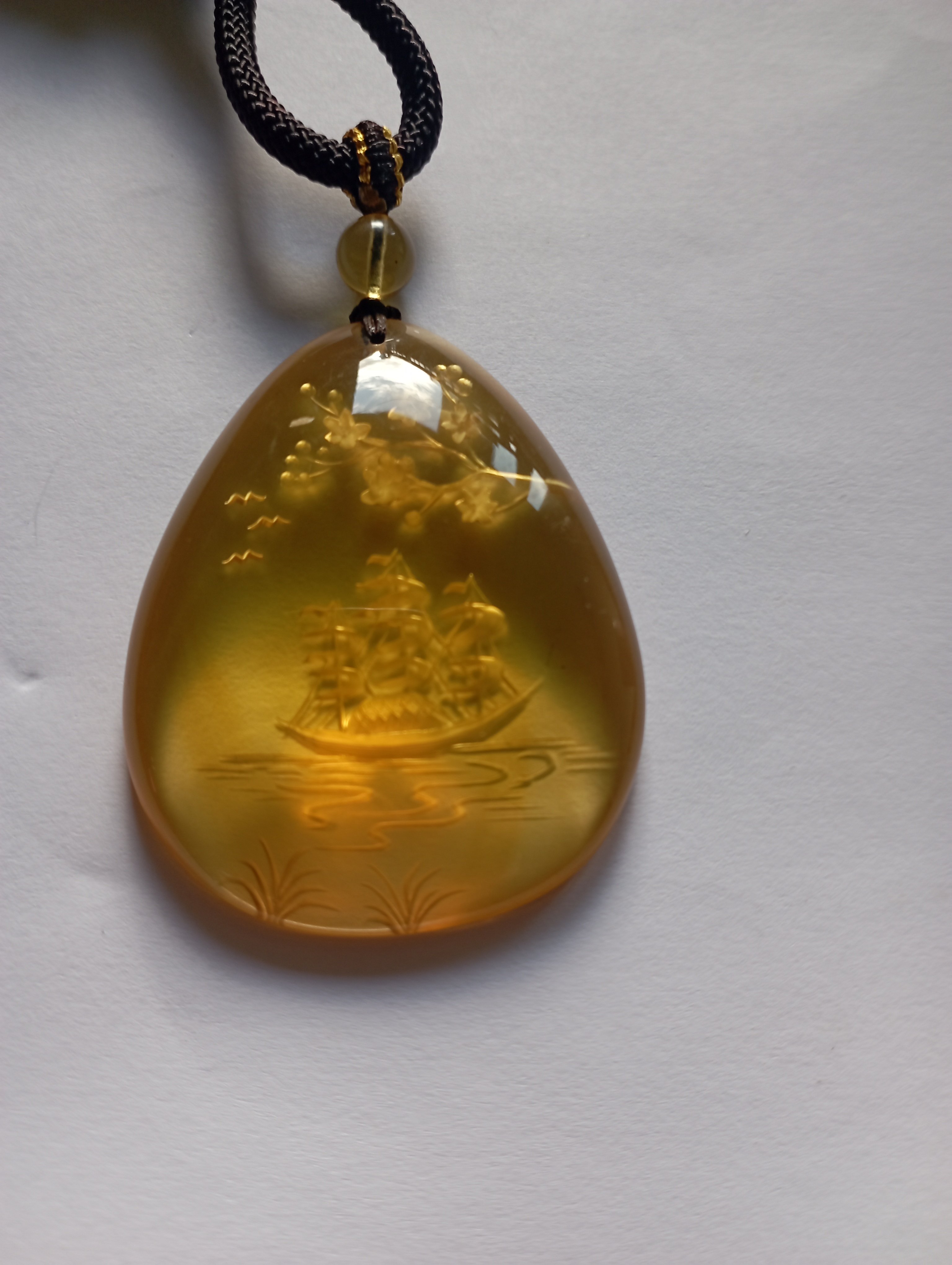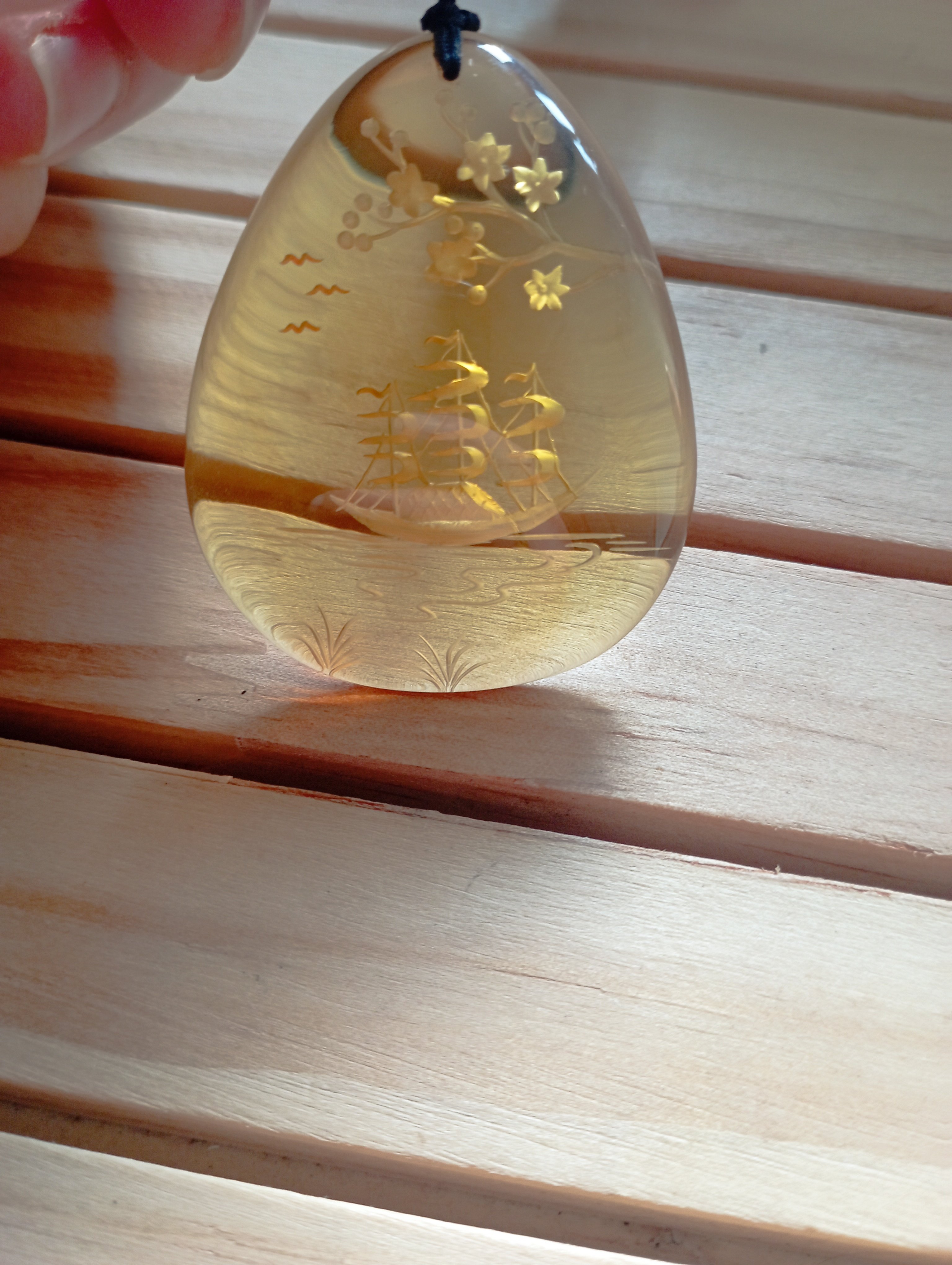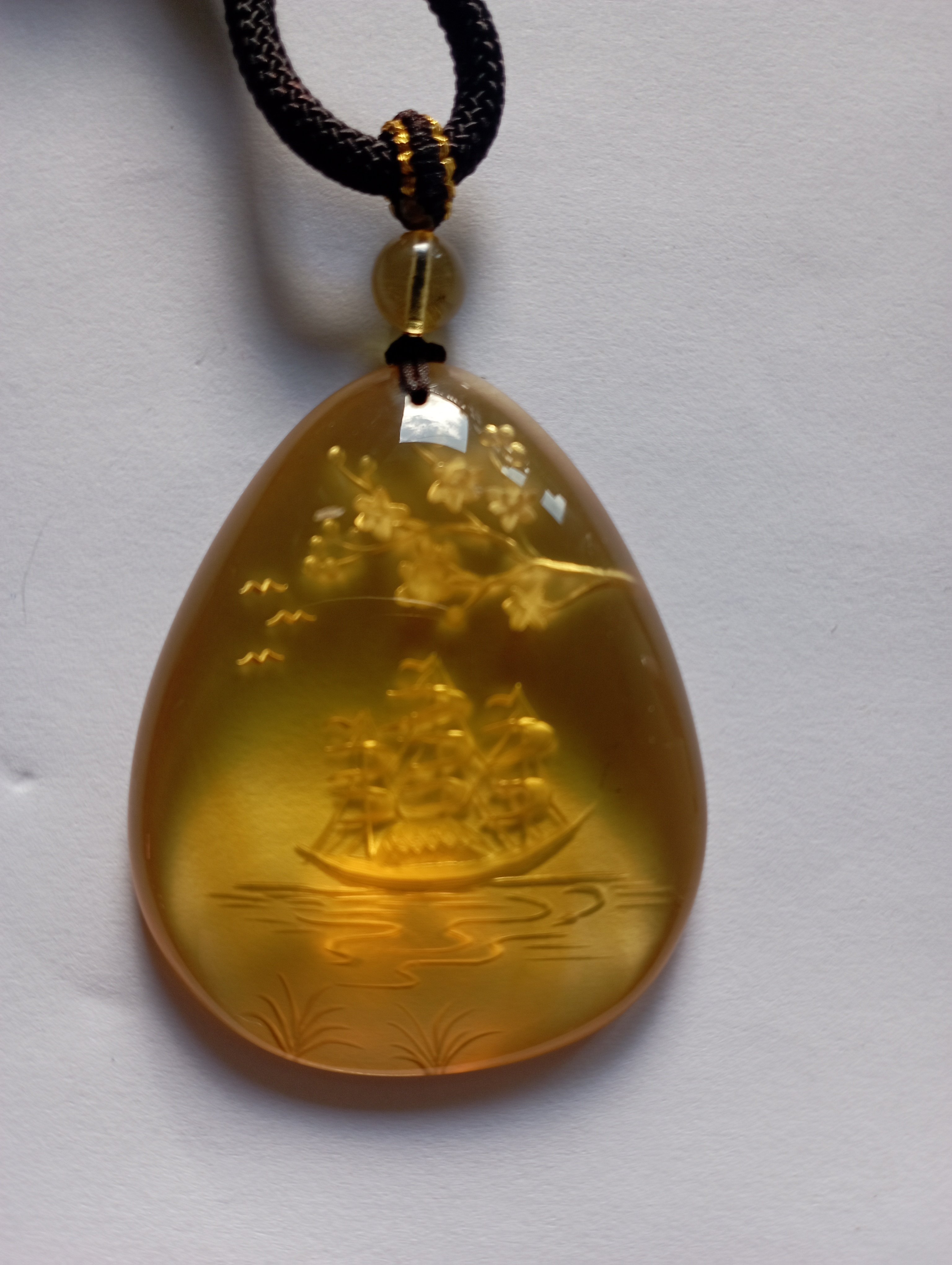 In the shape of a water droplet, it is engraved with a Chinese traditional boat sailing in the water. It signifies smooth sailing, peace and safety. The flowers means wealth and health, the grass means resilience.
