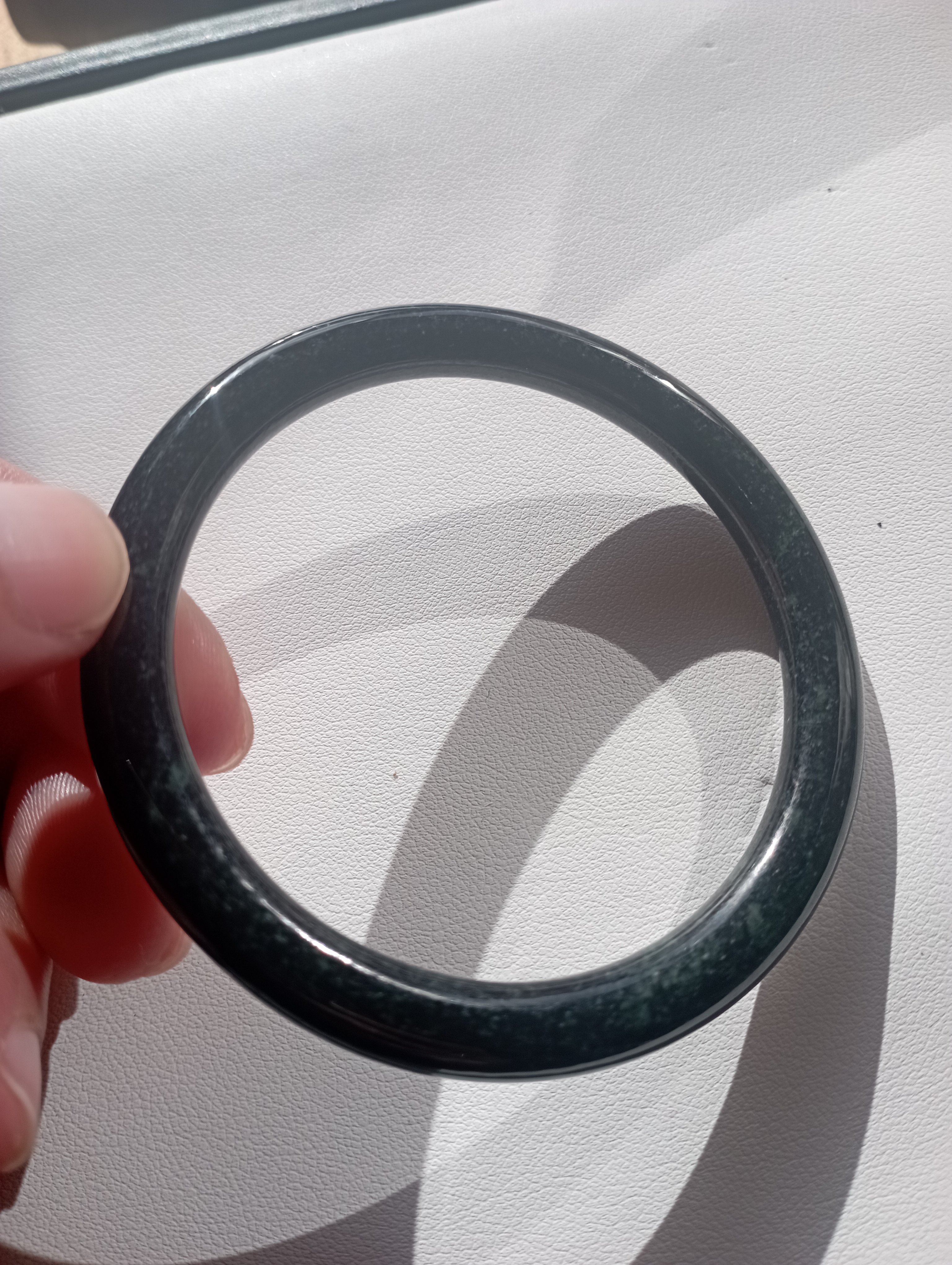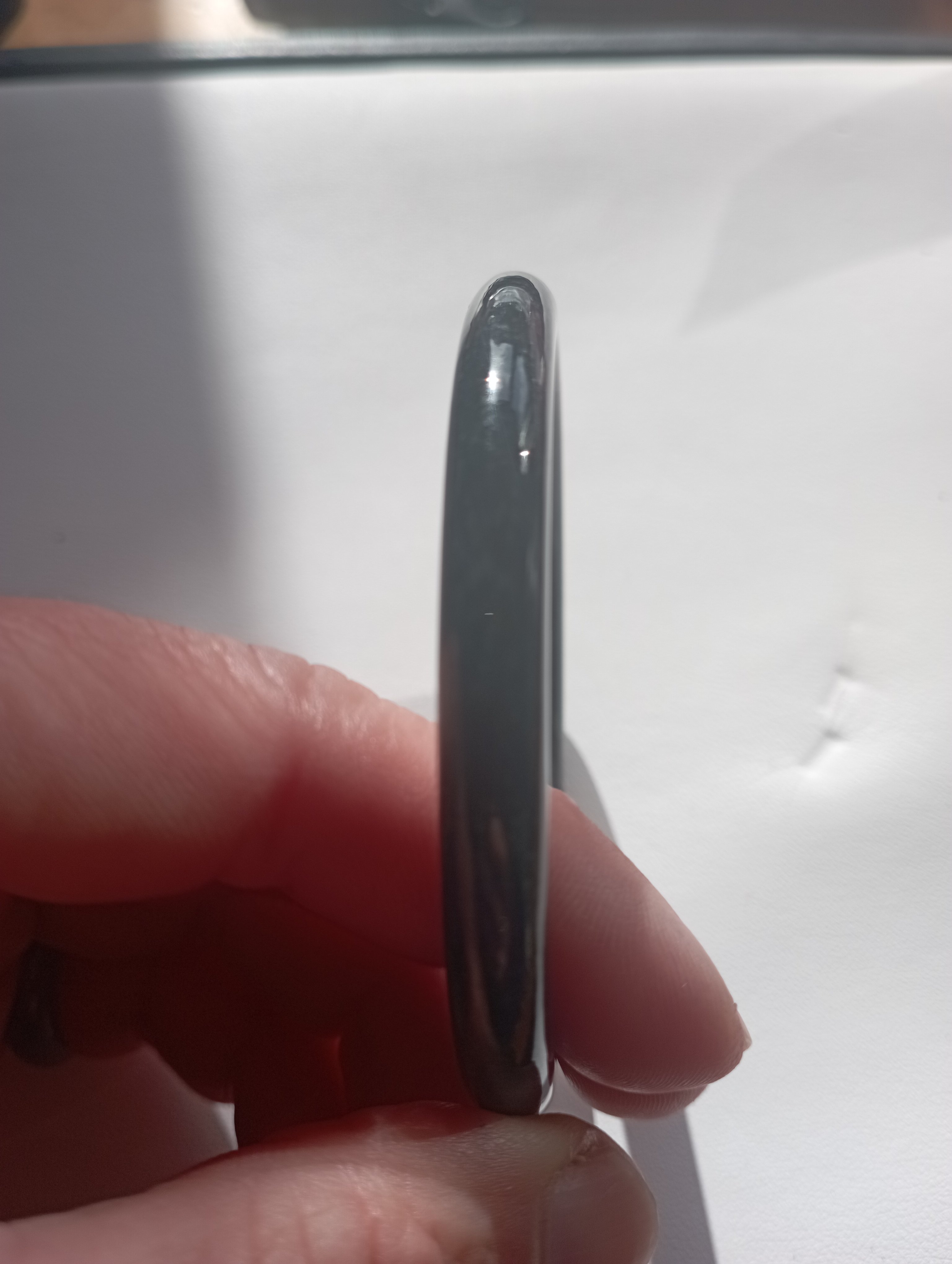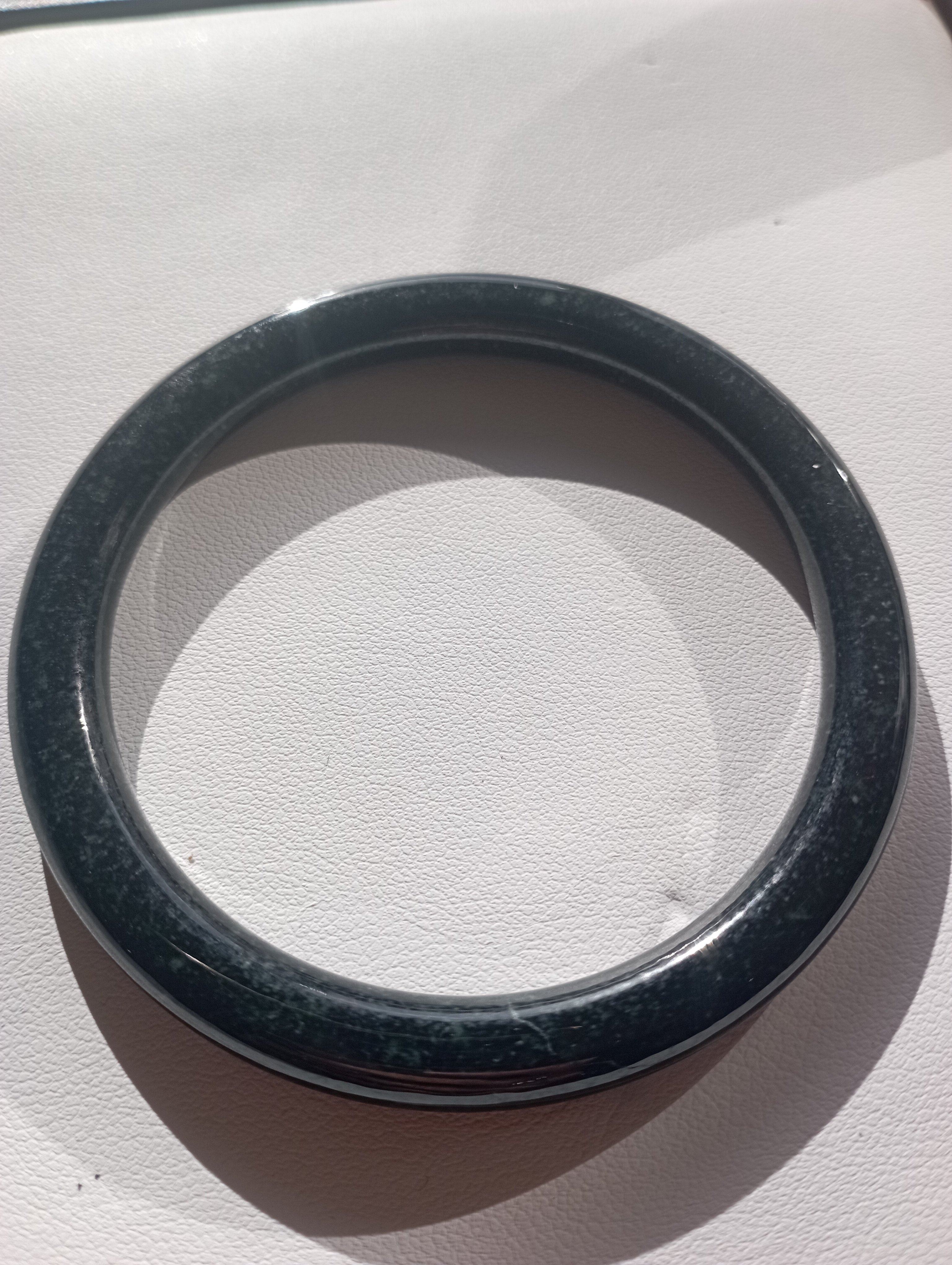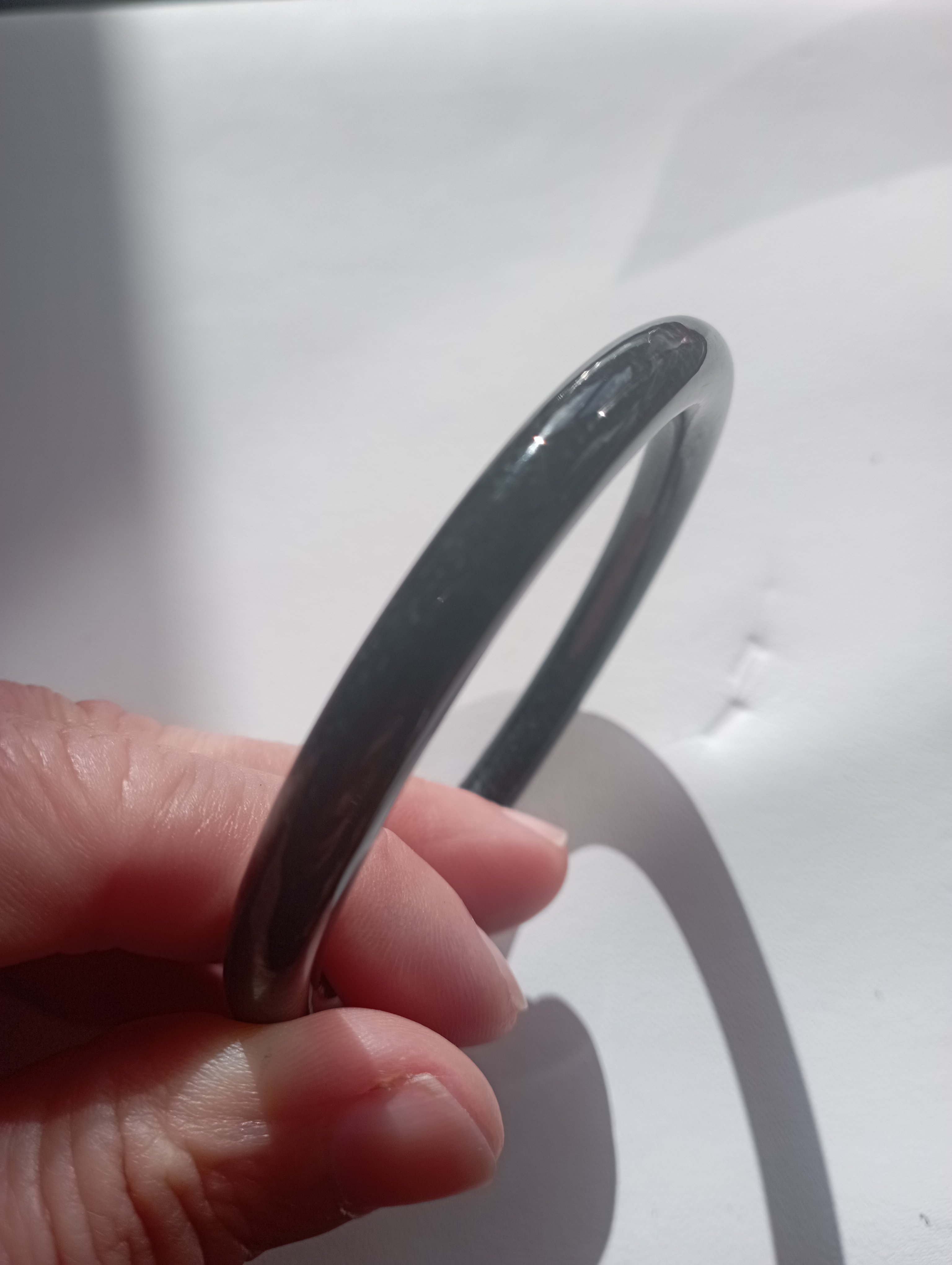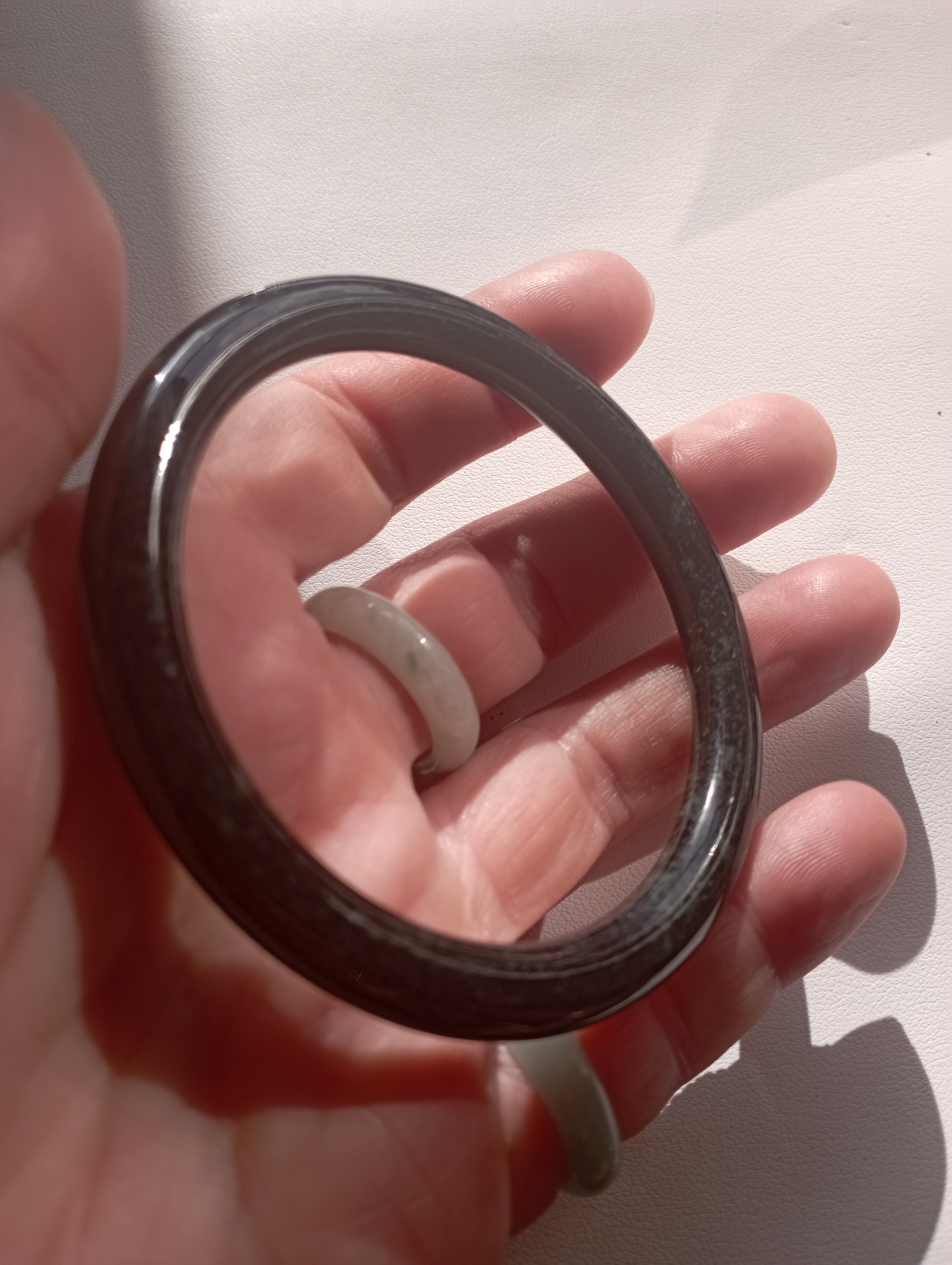 A smoky grey slim bangle that can be paired with another similar colour and thickness to make a pair of ding dang where the two bangles clink together to make a beautiful sound. Measures 54.3 X 6.4 x 7.4mm, fits up to 56mm, comes with a certificate of authenticity, £69