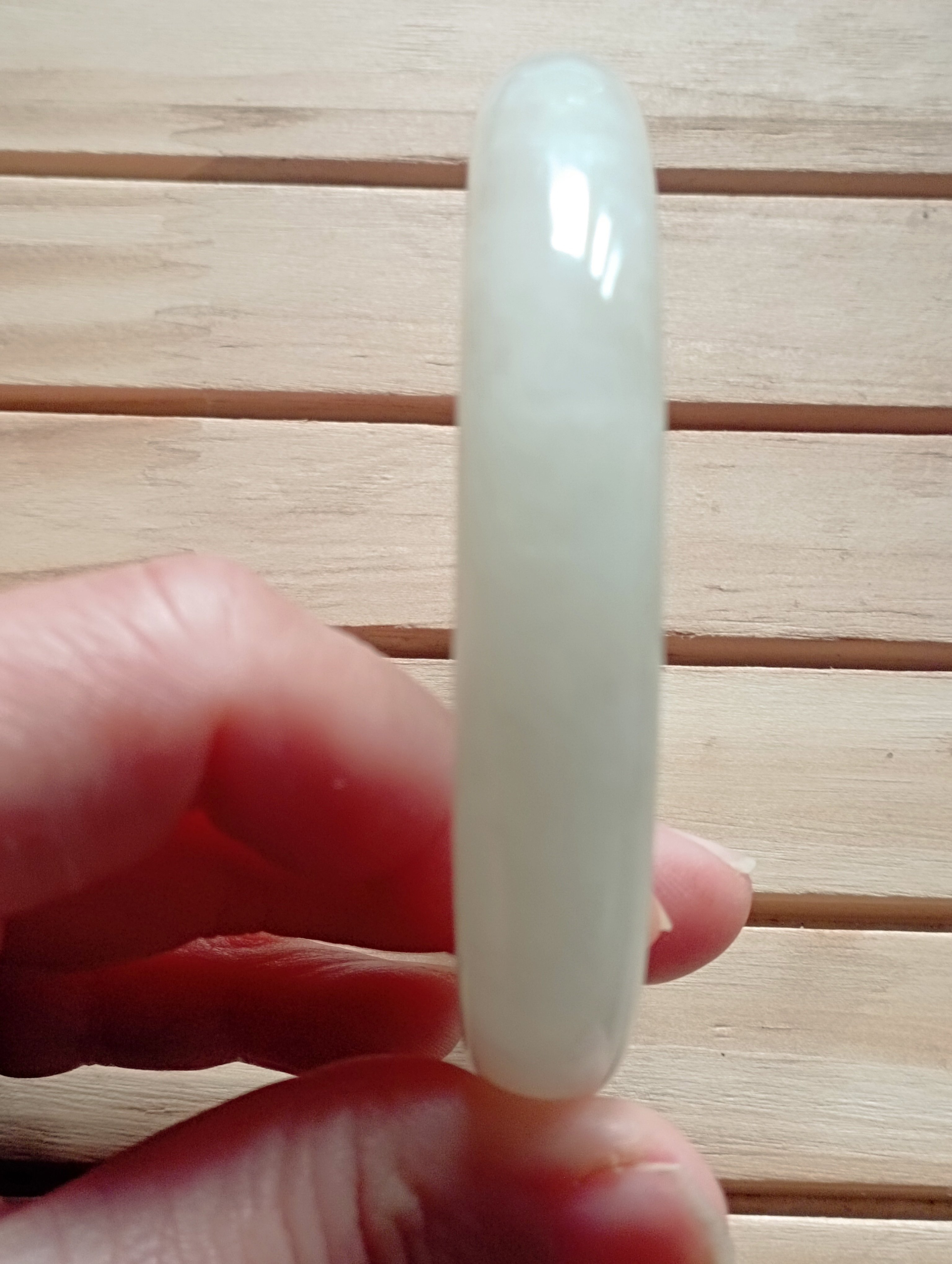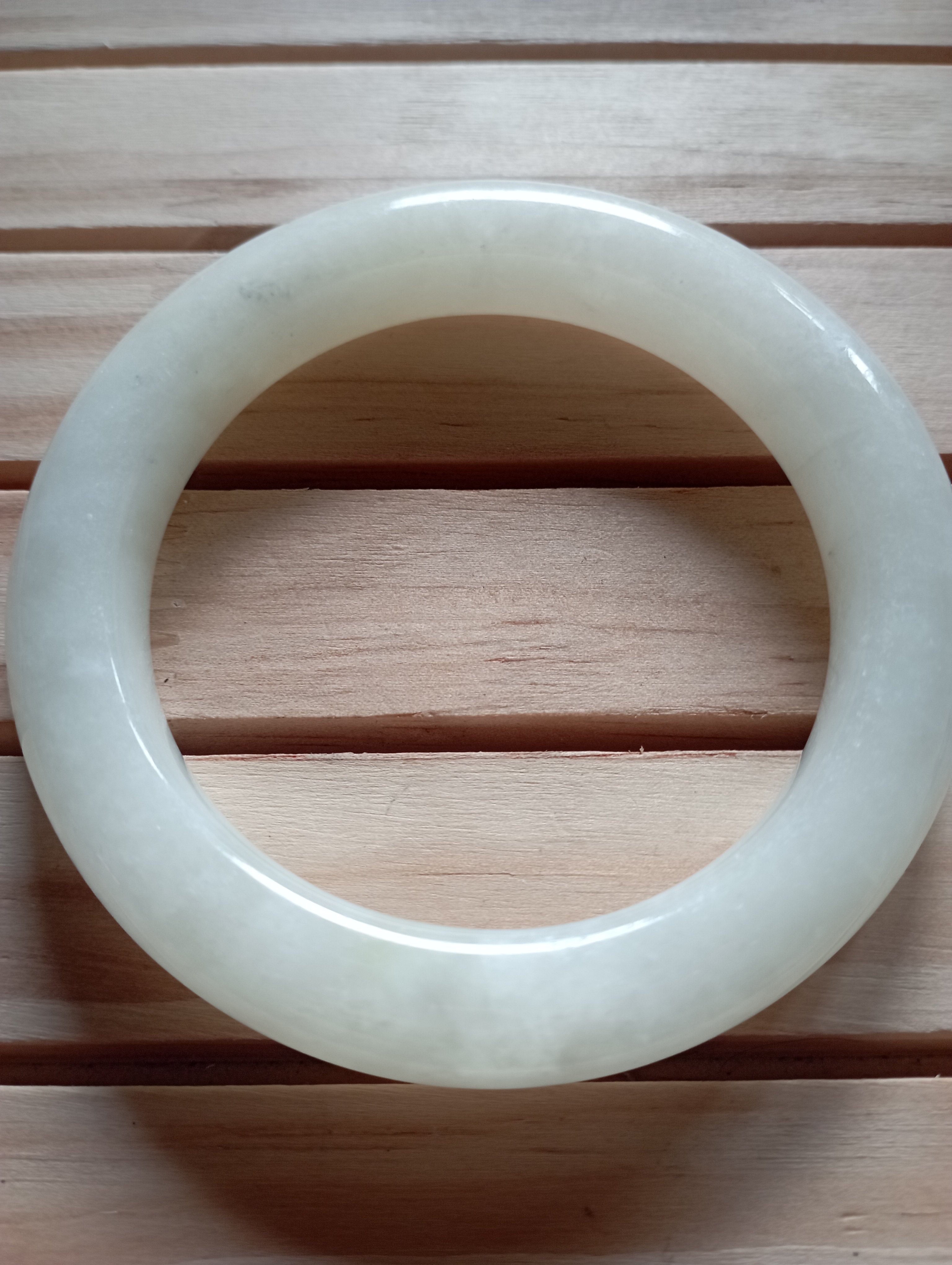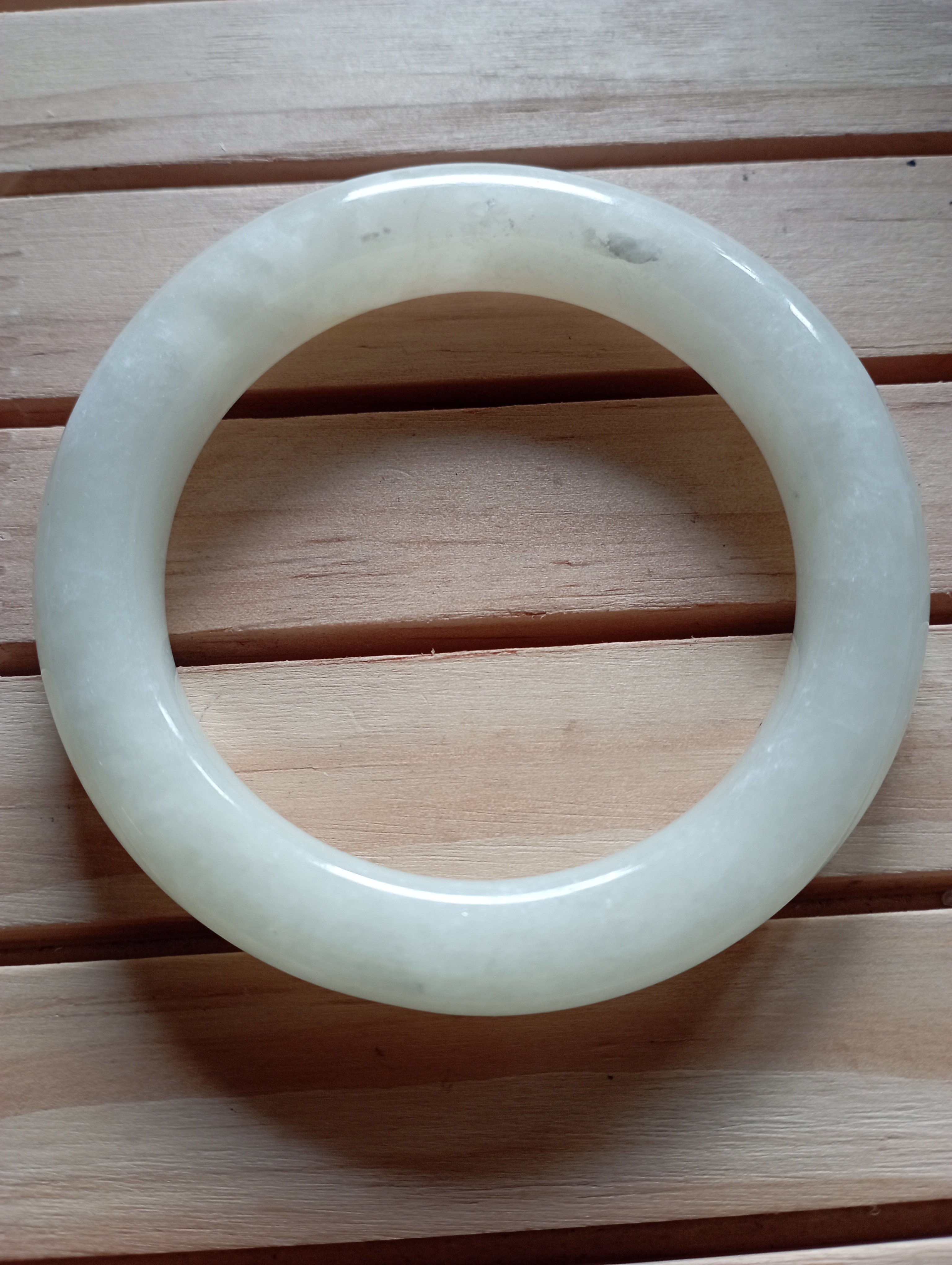 Beautiful white bangle made of Hetian from Qinghai in China. It is a softer jade compared to jadeite. Measures 57.5 X 11.2 X 10mm, weighs 67.59g, comes with a certificate of authenticity.£180